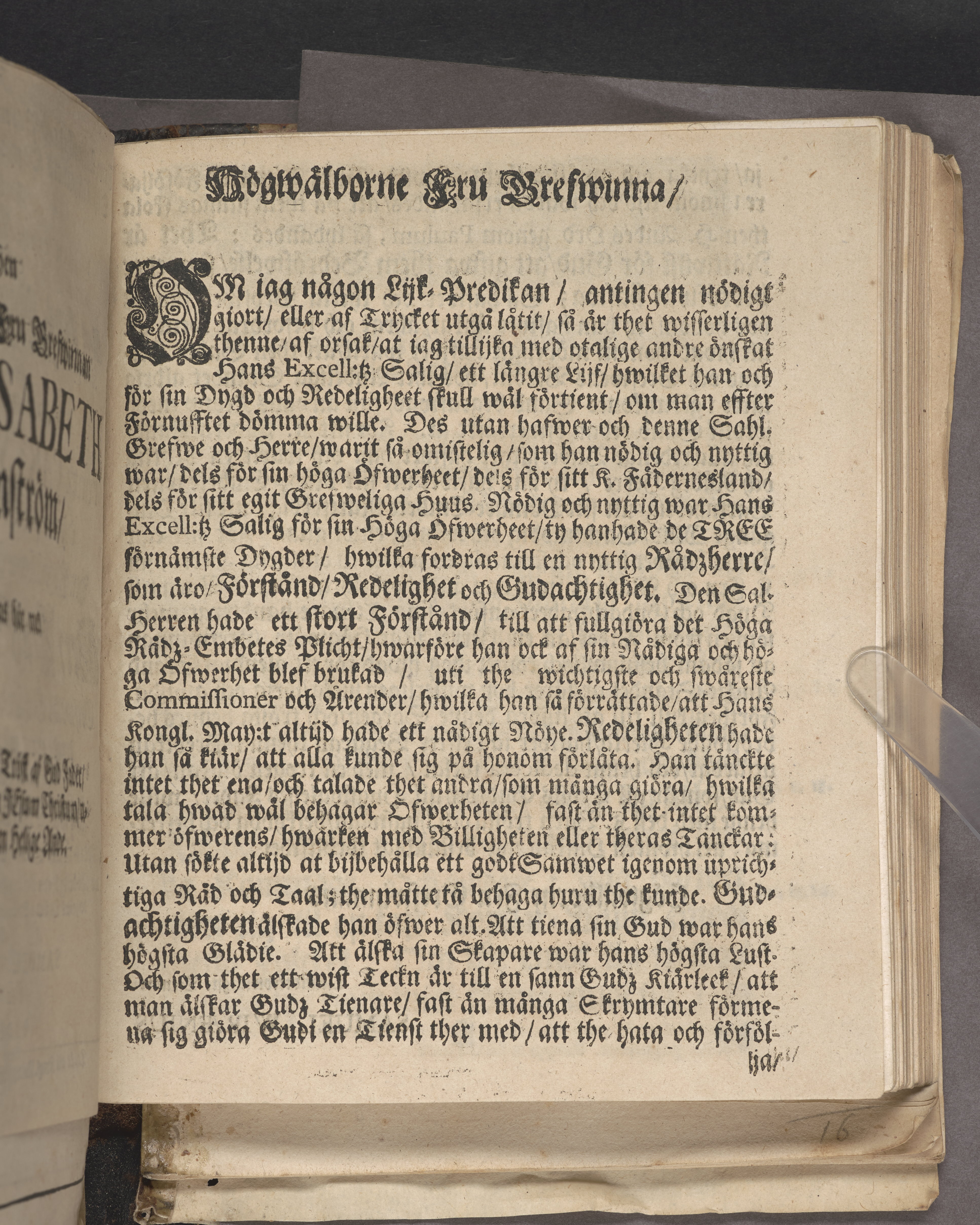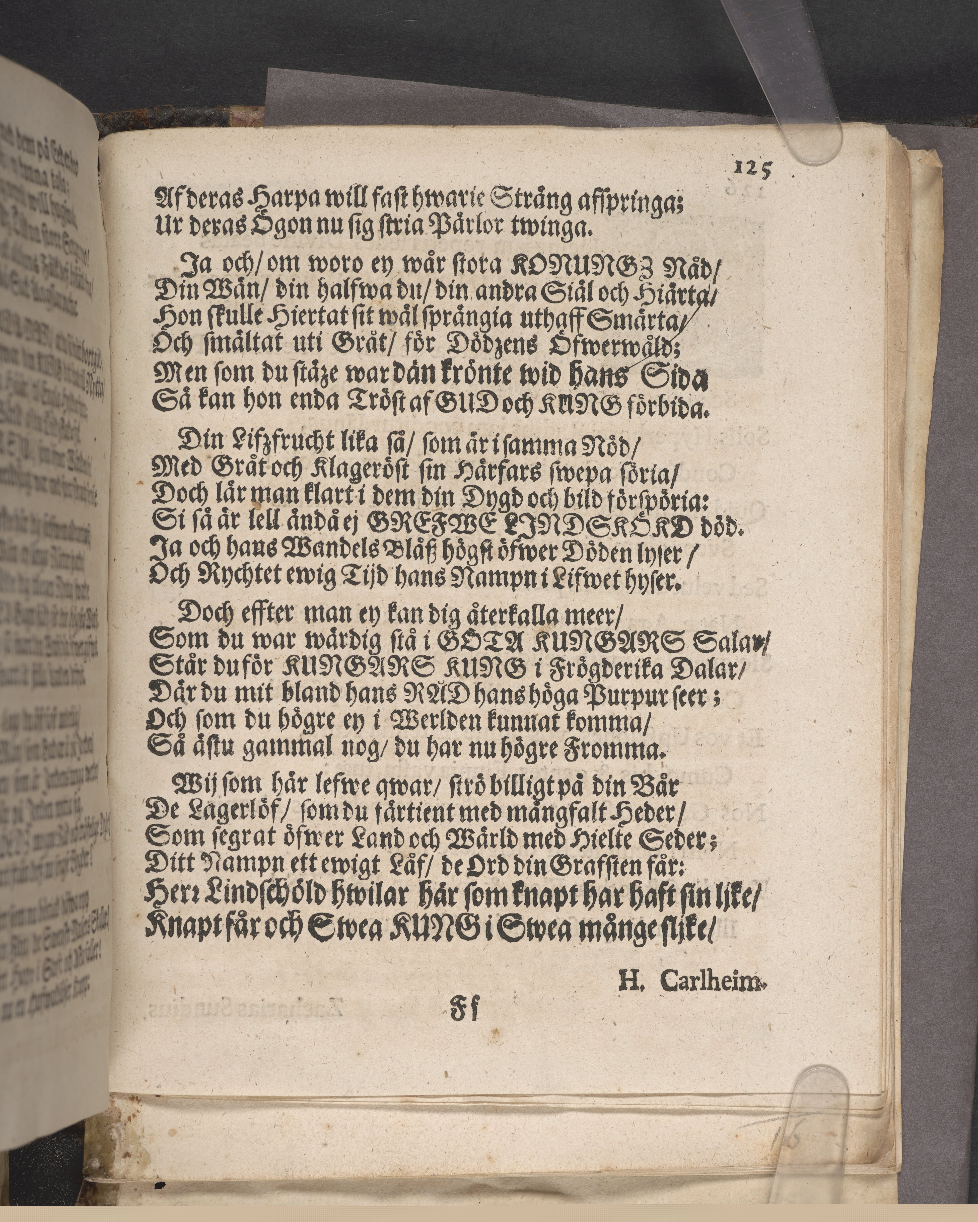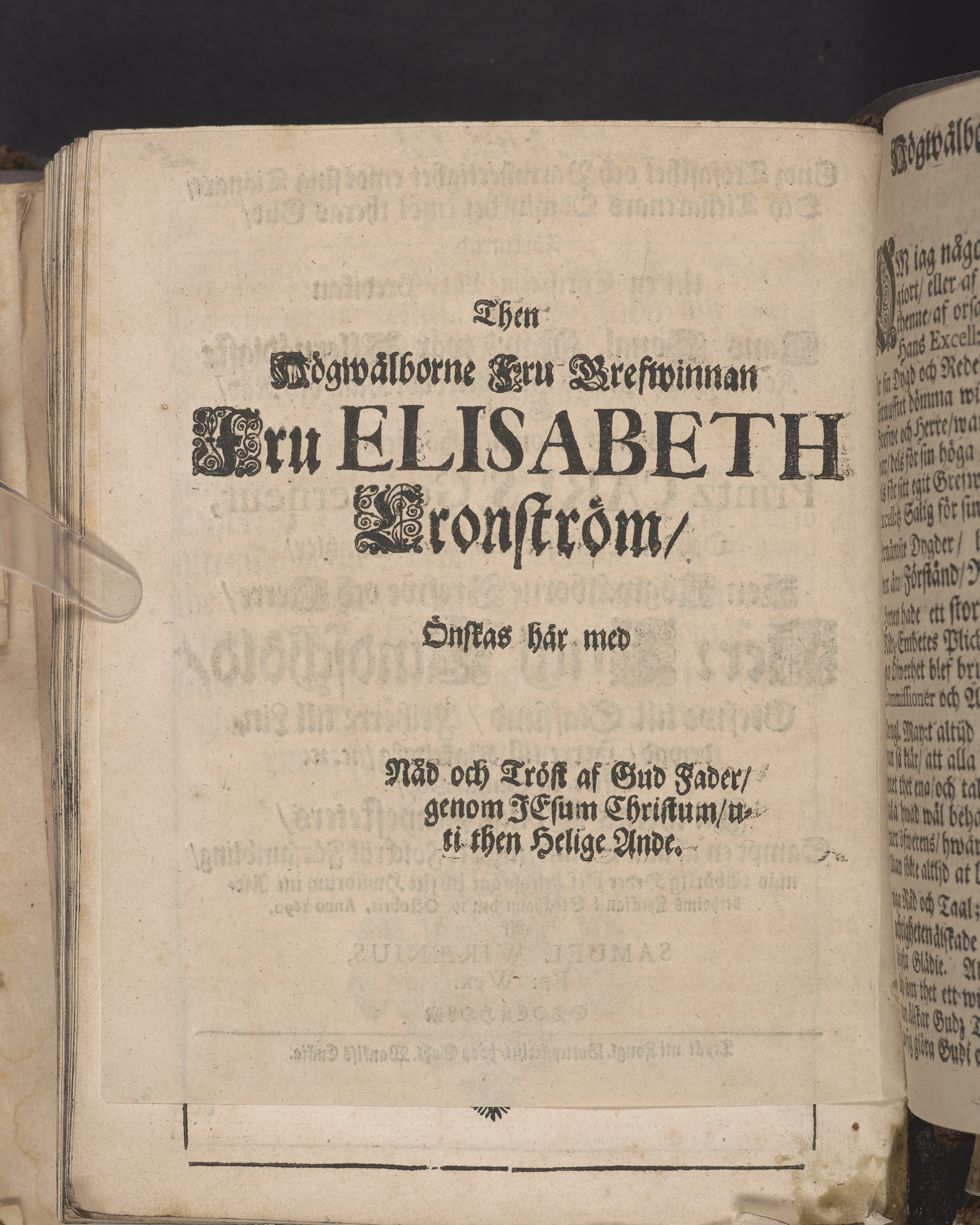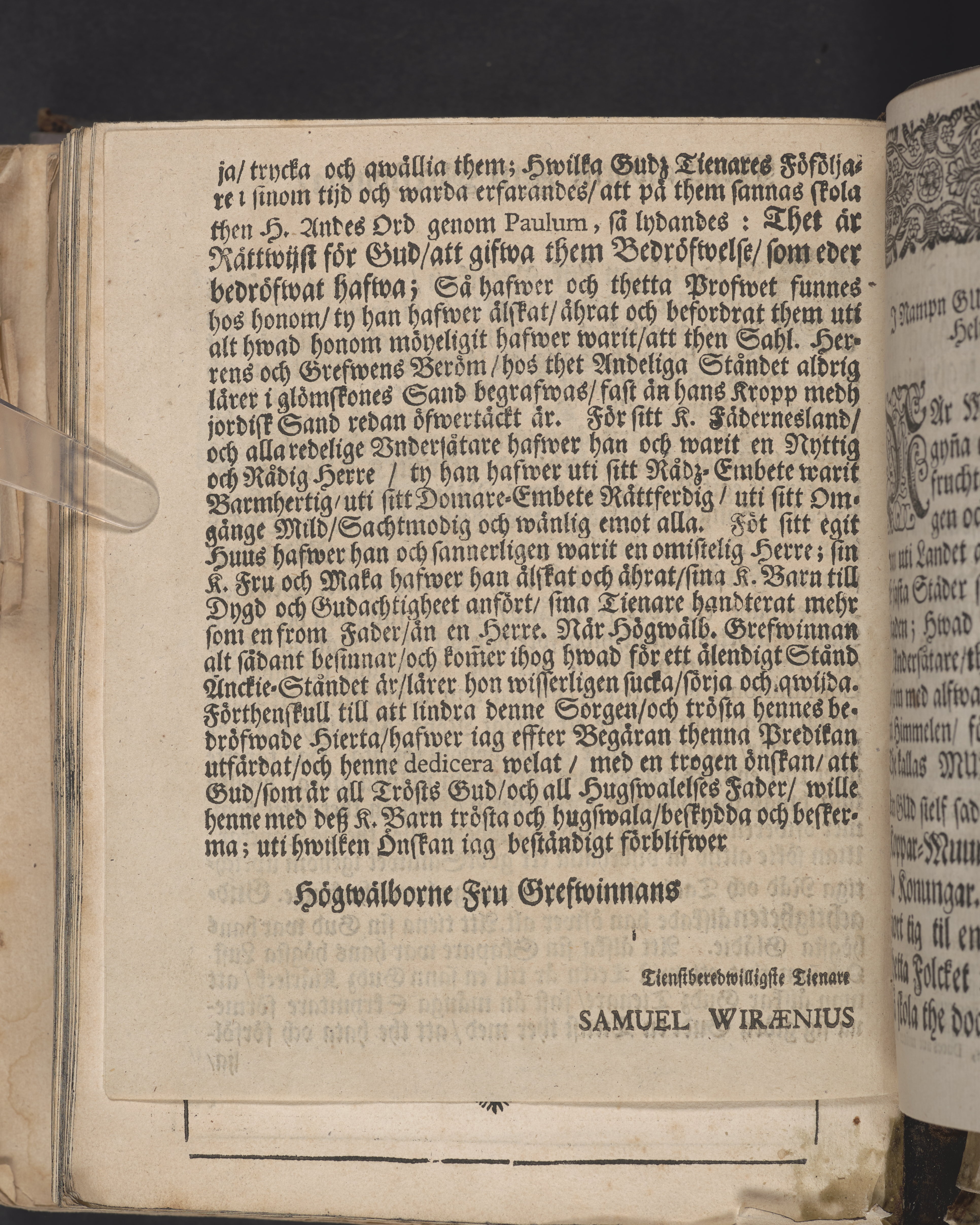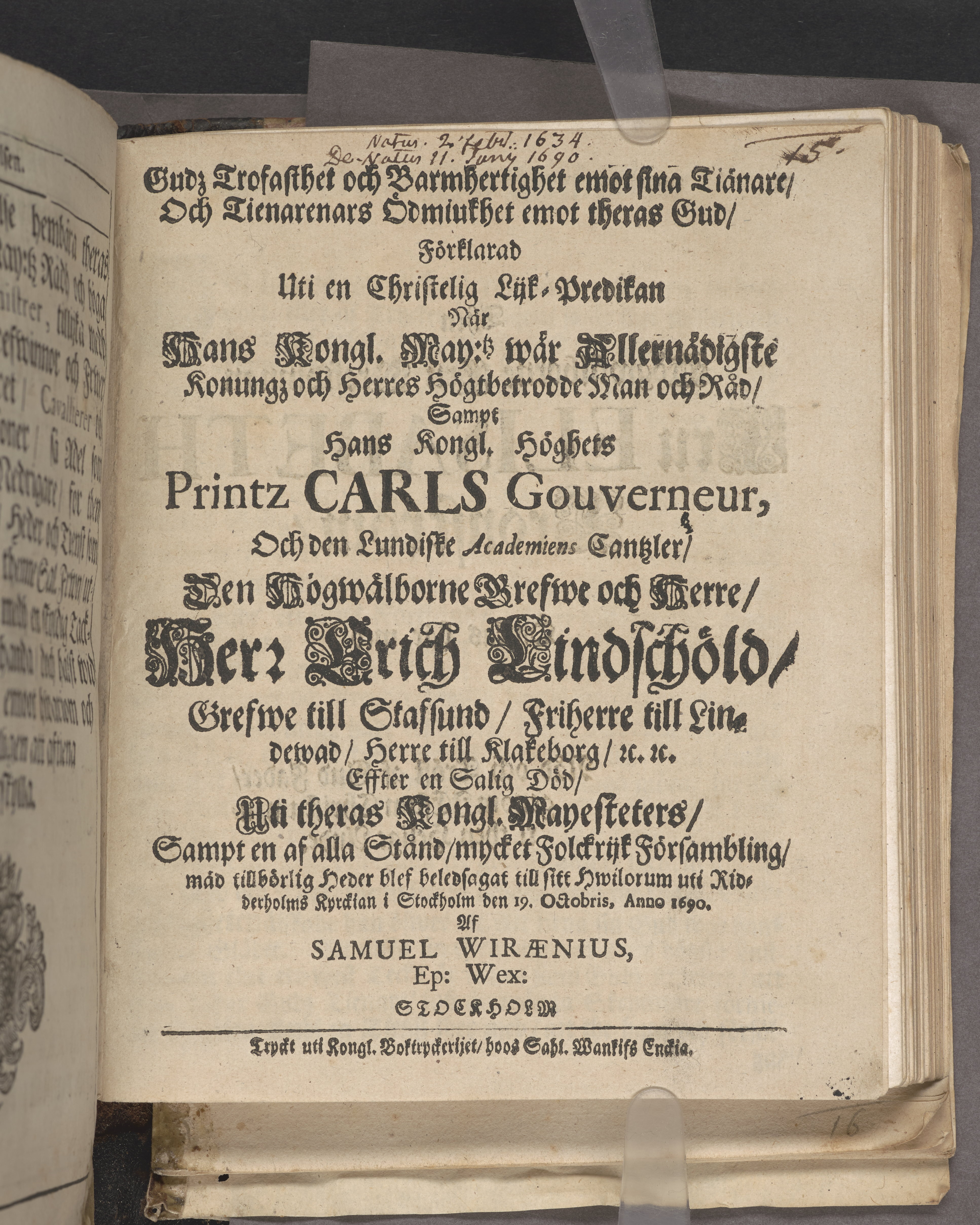 Gudz trofasthet och barmhertighet emot sina tiänare, och tienarenars ödmiukhet emot theras Gud, förklarad uti en christelig lijk-predikan när ... Herr Erich Lindschöld, grefwe til Stafsund ... blef beledsagat till sitt hwilorum uti Ridderholms kyrckian i Stockholm den 19. octobris, anno 1690. Af Samuel Wiræus, ep: Wex: Stockholm tryckt uti kongl. boktryckerijet, hoos sahl. Wankifs enckia.