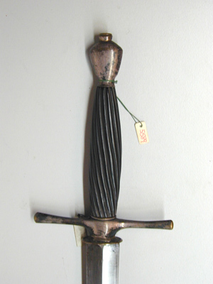 Fäste korsformigt, av försilvrad, slät mässing. Knapp omvänt päronformig, tryckt från ut- och insidan, nitknapp med plan ovansida. Parerstänger korta, raka, svagt uppåtböjda och med något förtjockade ytterändar. Kavel av ebenholts, spiralräfflad. Mellan fäste och klinga en tunn, oval mässingsskiva. Klinga rak, tvåeggad med mötande, jämnbreda skär.