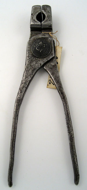 Tång smidd i stål, i mitten fäst med nit. Käftar flata med rundad ytterkant och i mitten urtaget hål, diam ca 10 mm, med öppning åt ena sidan.