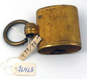 Baljbeslag i mässing. Pressad linje utgör kant upptill och nertill. Lödd konturerad ring utgör fäste för koppelring i mässing.