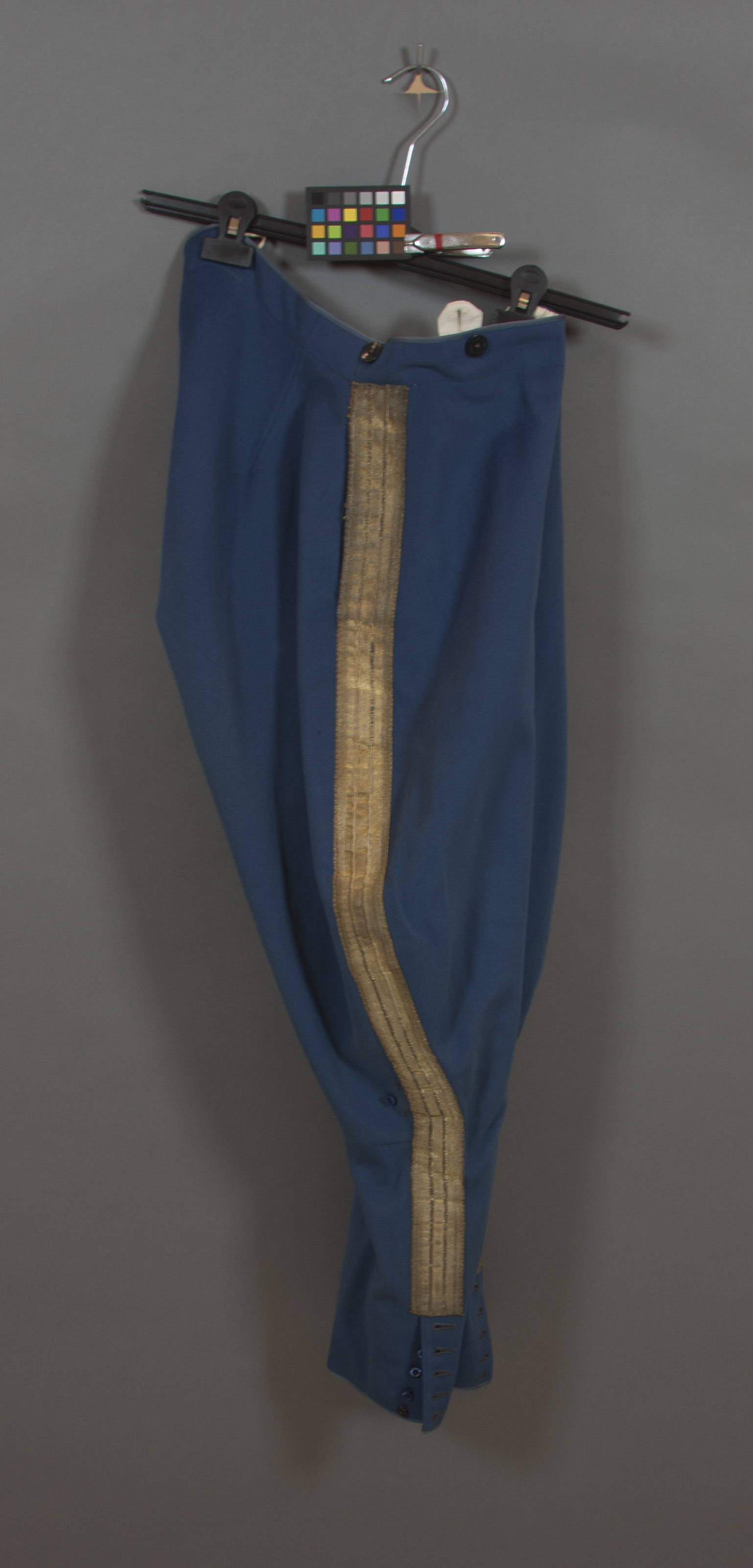Ridbyxor av blått kläde med s.k vid tillskärning med 45 mm bred guldgalon vid sidsömmen, sidsömsfickor. Gylf med dold knäppning om fem knappar, d: 15 mm med firmanamn i relief: "J.M.JANSON & WALLGREN" och med hake och hyska. Utefter linningen fem mörkblåknappar, d: 18 mm, märkta: " J.M. JANSON & WALLGREN // STOCKHOLM". Ytterligare två knappar baktill på insidan av linningen. Nedtill på benen, under den slitna galonen ett sprund med öppen knäppning med fem knappar, d: 10 mm,. 300 mm upp på byxbenen en dito knapp. Linnings- och fickfoder av vit bomull.