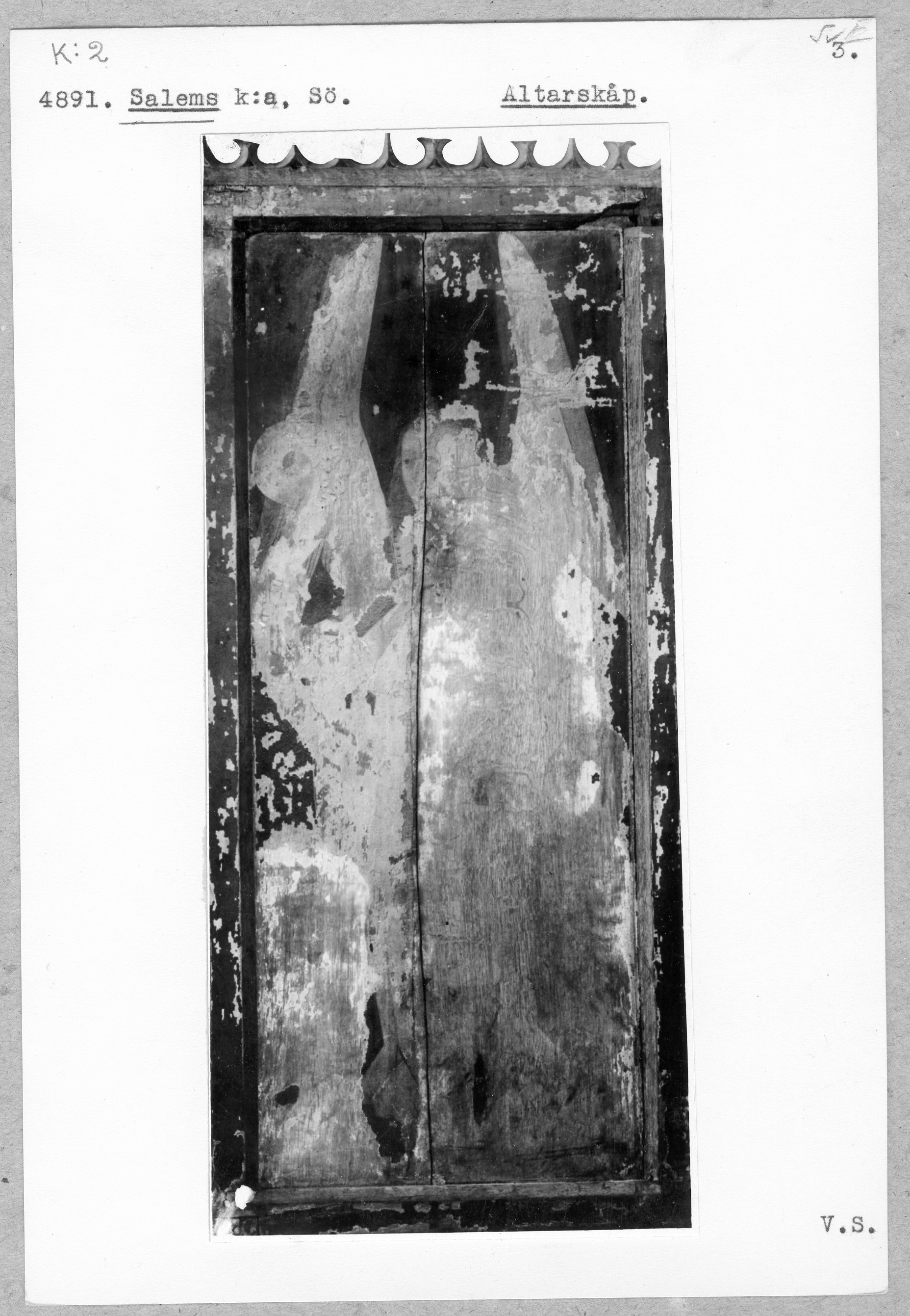 Kondition: god, Marias högra hand och barnets båda armar avbrutna, barnets vänstra fot skadad, de flankerande helgonen har förlorat sina attribut. Färg: i huvudsak bevarad.