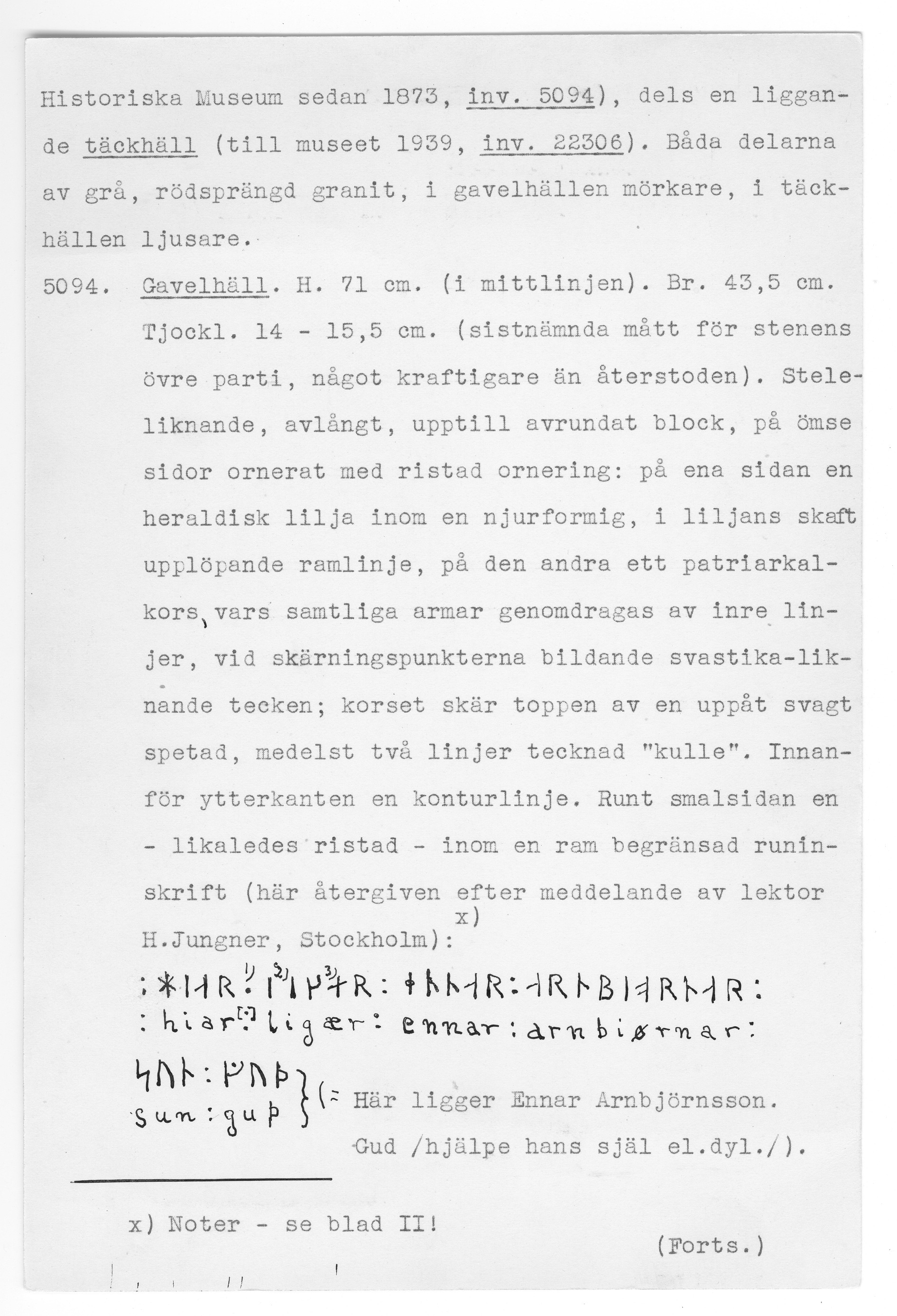 Runristad gavelsten. Ristningen uttyds: "hiar : (l)(i)(g)ær : ennar : arnbiornar : sun : guþ".
