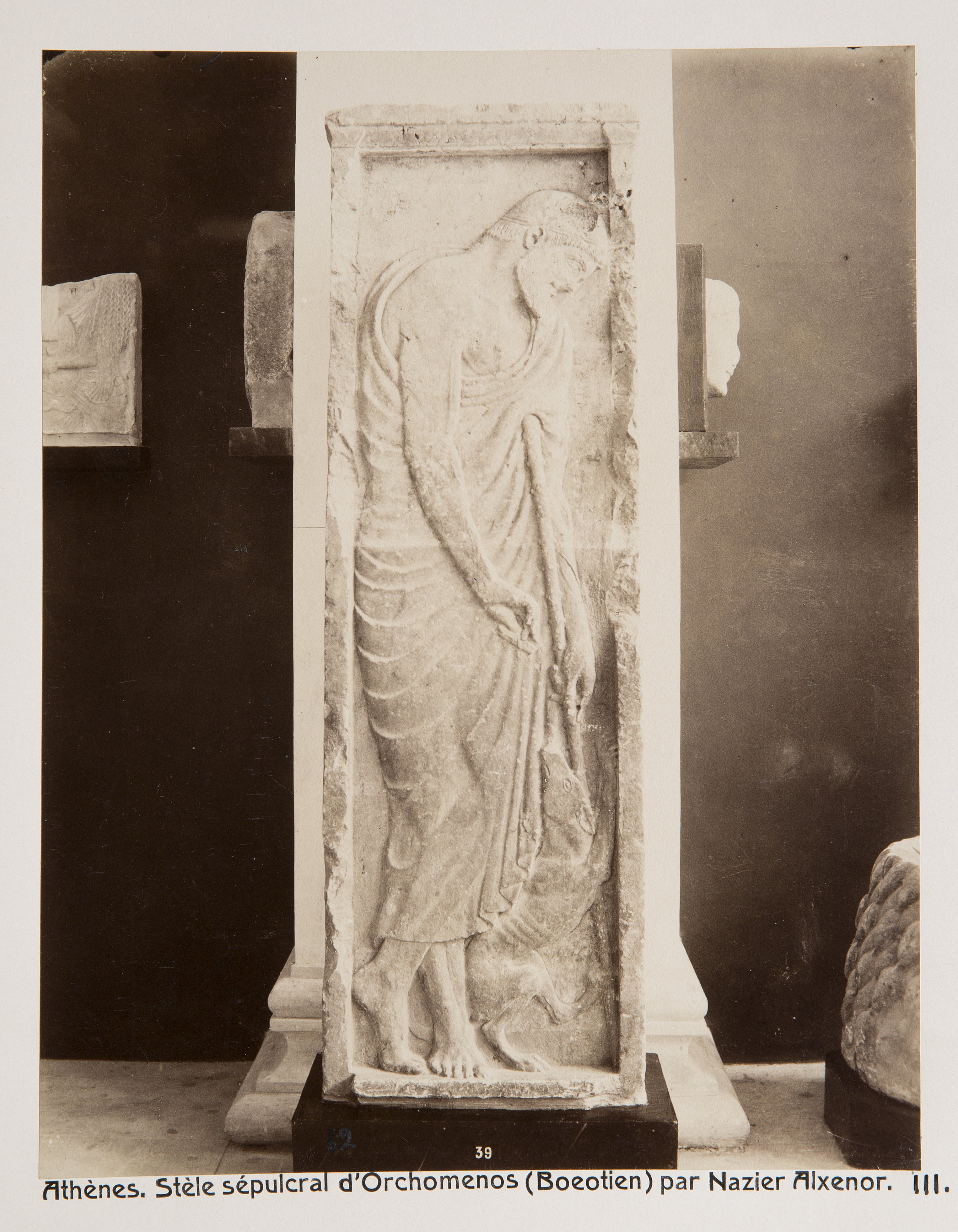 Gravstele från Orchomenos. Aten, Grekland. Text på originalet: Athènes. Stèle sépulcral d`Orchomenos (Béotie) par le Naxien Alxénor. Foto från resa genom Grekland, Makedonien och Serbien, 15 mars-6 juni 1896. Fotografierna LXVI:K.18.-147. är köpta av Wilhelmina von Hallwyl, f. Kempe på Korfu samt i Patras, Nafplion, Aten, Thessaloniki och Belgrad. Med på resan var maken Walther von Hallwyl och fröken Ida Uhse. Uppgifterna kommer från Ida Uhses reseanteckningar.