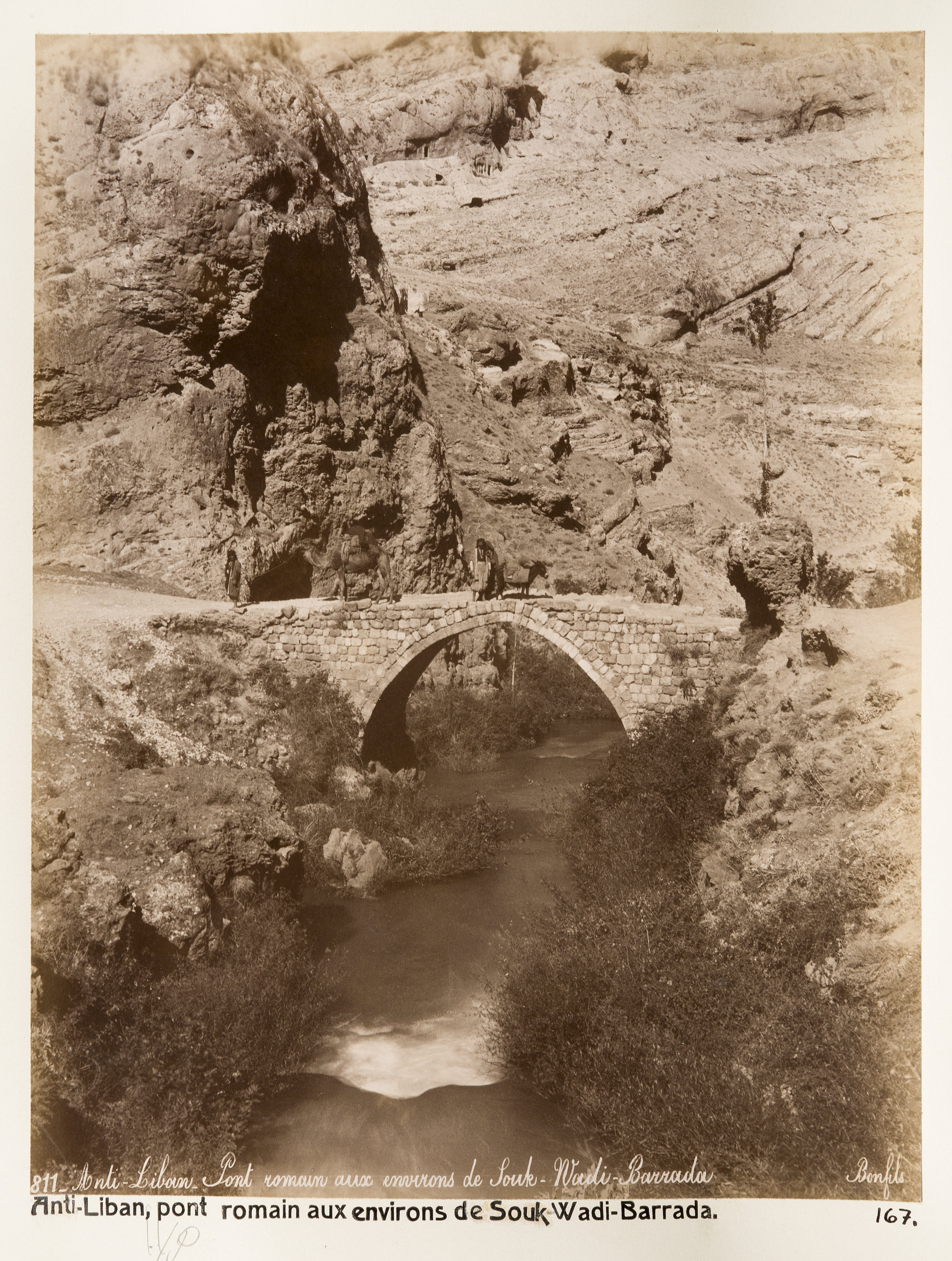 Den romerska bron nära byn Souq Wadi Barada i bergskedjan Antilibanon, Syrien. Text på originalet: "Anti-Liban. Pont romain aux environs de Souk-Wadi-Barada." Fotografierna LXVI:N.01.-180. kommer från resan till Palestina och Syrien som Wilhelmina och Walther von Hallwyl gjorde den 30 mars-27 april 1901. De lämnade Sverige den 5 november 1900 för Egypten, där de stannade till den 28 mars 1901, då de fortsatte till Palestina. Med på resan var Wilhelminas sällskapsdam, fröken Ida Uhse. Den 27 april fortsatte de till Turkiet och Mindre Asien. De mindre fotografierna (utom de från Samos) LXVI:N.90.-100. är tagna av Wilhelmina själv, under en resa till häst från Jerusalem till Damaskus 8-20 april 1901. Övriga fotografier är inköpta av Wilhelmina i Jerusalem, Damaskus och Beirut. Alla uppgifter kommer från Ida Uhses reseanteckningar.