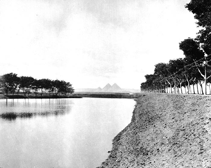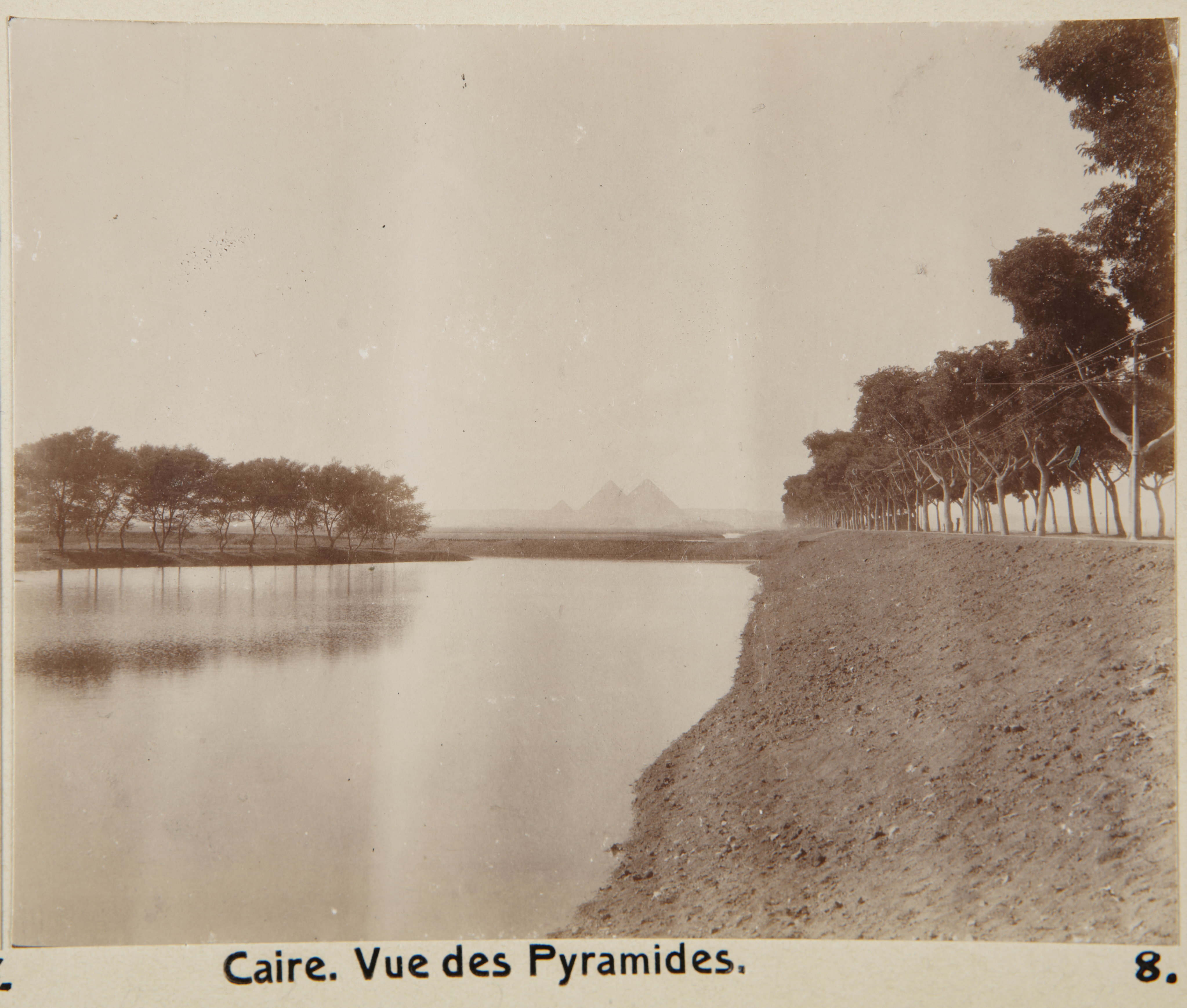 Vy från pyramiderna. Kairo, Egypten. Text på fotografiet: Caire. Vue des Pyramides Fotografierna LXVI:M.01.- 201. kommer från resan till Egypten och Sudan som Wilhelmina och Walther von Hallwyl gjorde vintern 1900-1901. De lämnade Sverige den 5 november 1900 och fortsatte från Egypten till Palestina den 28 mars 1901. Med på resan var döttrarna Ellen med maken Henric de Maré och Irma med maken Wilhelm von Geijer. Wilhelminas sällskapsdam, fröken Ida Uhse reste också med. Under en del av resan anslöt sig ledamoten av Internationella domstolen i Kairo, assessorn Otto Conrad Waldemar Cedercrantz med makan Anna Elisabeth. Vid resan uppför Nilen hade Walther von Hallwyl hyrt ångfartyget Columbia med besättning. Båtresan startade i Kairo 27 december 1900, gick ända till Wadi Halfa varifrån man reste vidare med tåg till Khartum och tillbaka till Wadi Halfa. Båten vände åter i riktning mot Kairo, men det verkar som att sällskapet tog tåg sista biten, från Luxor. Henric och Ellen de Maré samt fru Cedercrantz lämnade båten redan då de passerade Luxor första gången. Resten av sällskapet återvände till Kairo den 1 mars. Fotografierna LXVI:M.01.-120. togs av resenärerna själva, de största av Ellen de Maré, de mellersta av Wilhelmina von Hallwyl och de minsta av Wilhelm von Geijer. Resten köptes av professionella fotografer i Kairo, de flesta från Studio Photogr. Artistique G. Lekegian & Cie. Alla uppgifter kommer från Ida Uhses reseanteckningar.