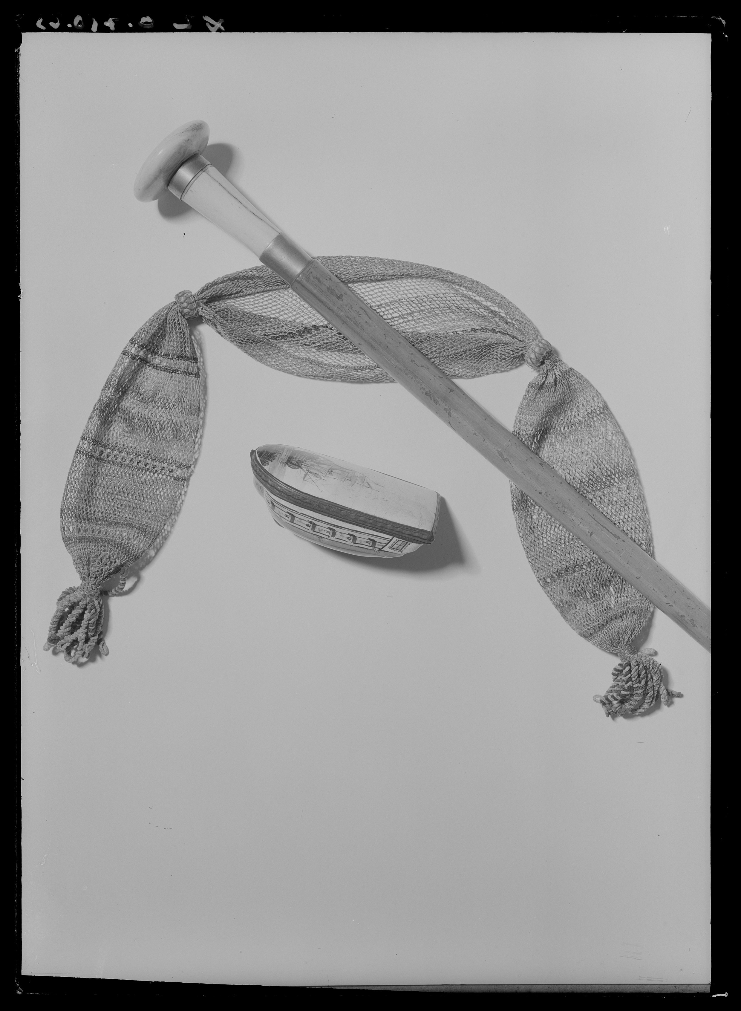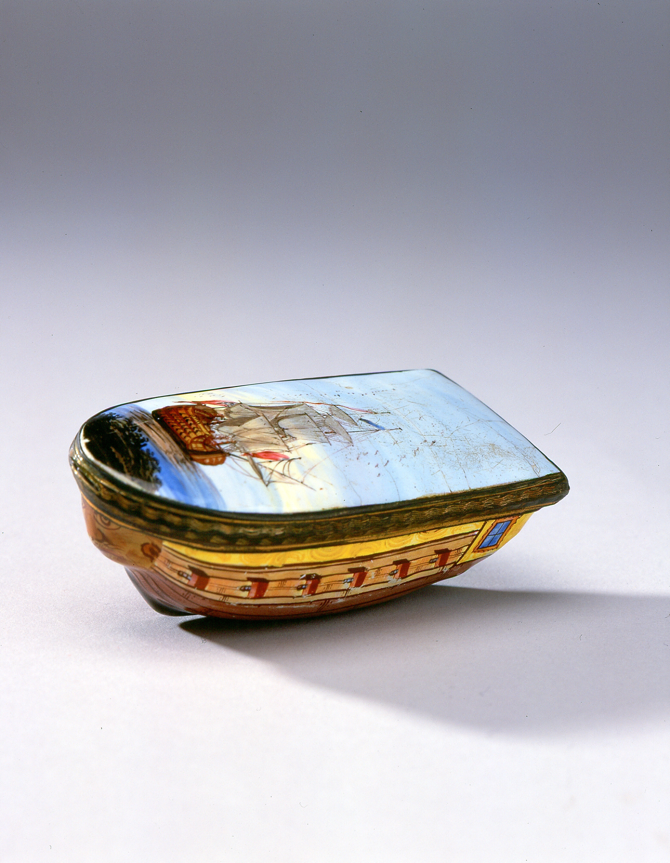 Snusdosa av emaljerad koppar formad som ett båtskrov. Sidor i rött och gult, galjonsbild föreställande lejon. I aktern blå smårutade fönster. Svart köl. På locket ett skepp på blått hav. Blå himmel. Locket har kopparkanter med graverat vågmönster. I dosanförvaras ett ovalt, platt föremål (agat?), l: 12 m, ristat djurmönster.