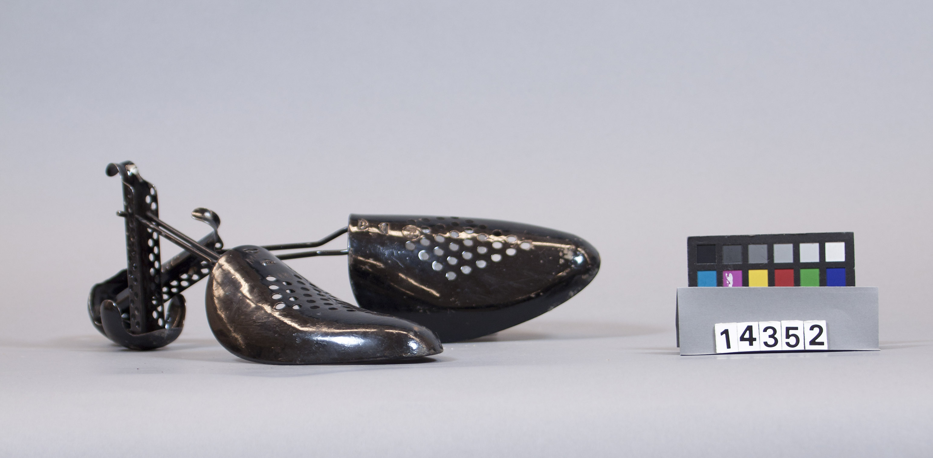 Skoblock av svartlackerad stål, bestående av en framdel ,häldel och däri mellan en delvis dubbelledad stång. Framdelen har runda hål i en rombform mitt på.Överst i en rund ring märkt 8- 10 . Häldelen rund formad med två fyrkantiga hål. Stångens övre del dubbelledad nedre delen med små hål på sidorna. Den dubbelledade stången skjuts in i hål på den nedre delen av stången för att ställa in rätt storlek. Stången märkt med: " "MERZ" ".