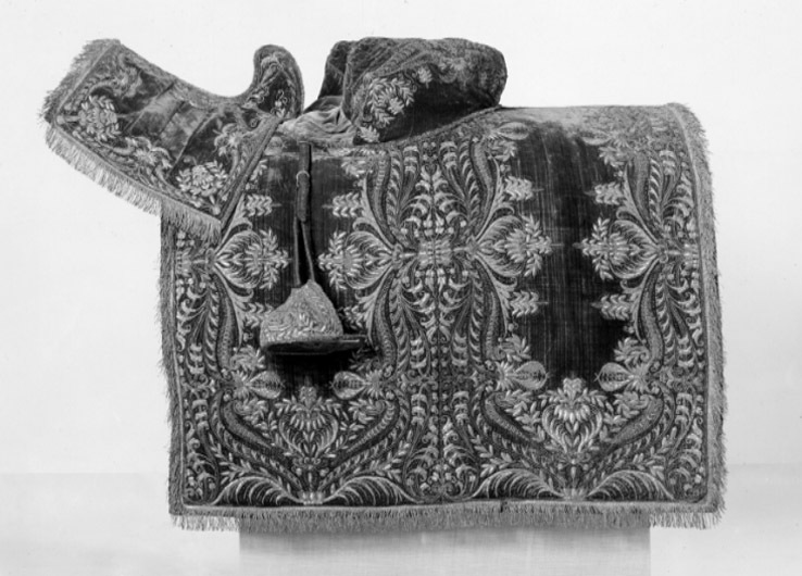 Kåpa till sadelknappen. 370 mm lång med lika broderi som sadeln i övrigt.