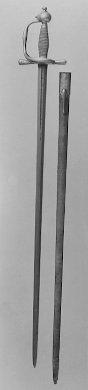 Modellenlig. Fäste utan konventionell gelbgjutarstämpel, men nära knappen på handbygelns insida inslaget bokstaven D. På klingbasens utsida inslagen proberstämpel: P. Enligt hovkamreren Gustaf Adolf Törn (+1824) en av de värjor som använts av hertig Fredrik Adolfs stånddrabanter vid Hedvig Elisabeth Charlottas intåg i Stockholm 1774.