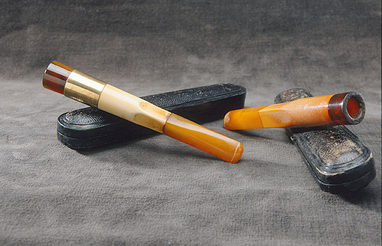 Munstycke i tre delar, mynning av opak, brun bärnsten, mellanstycke av benvitt gult sjöskum, runt framtill, fyrsidigt baktill, framtill ett 20 mm långt beslag av gulmetall. Munstycke av opak, gul bärnsten, fyrsidigt i främre änden, sakta övergående i spetsoval.
