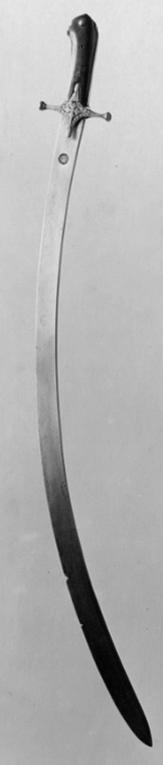 Fäste upptill konturerat och framåtböjt klätt med plattor av rödbetsat trä fästade med nitar, upptill med rosetthuvud. Runt om fram- och baksidan skena av nysilver. Korta raka parerstänger, gjutna av mässing med knoppformiga ändar i ett med styrskenorna. Krysset ornerat med kors och blommor. Klinga av stål 34 mm bred, böjd, eneggad med 225 mm långt tvåeggat spetsparti. På utsidan nära fästet rund stämpel med orientaliska tecken.