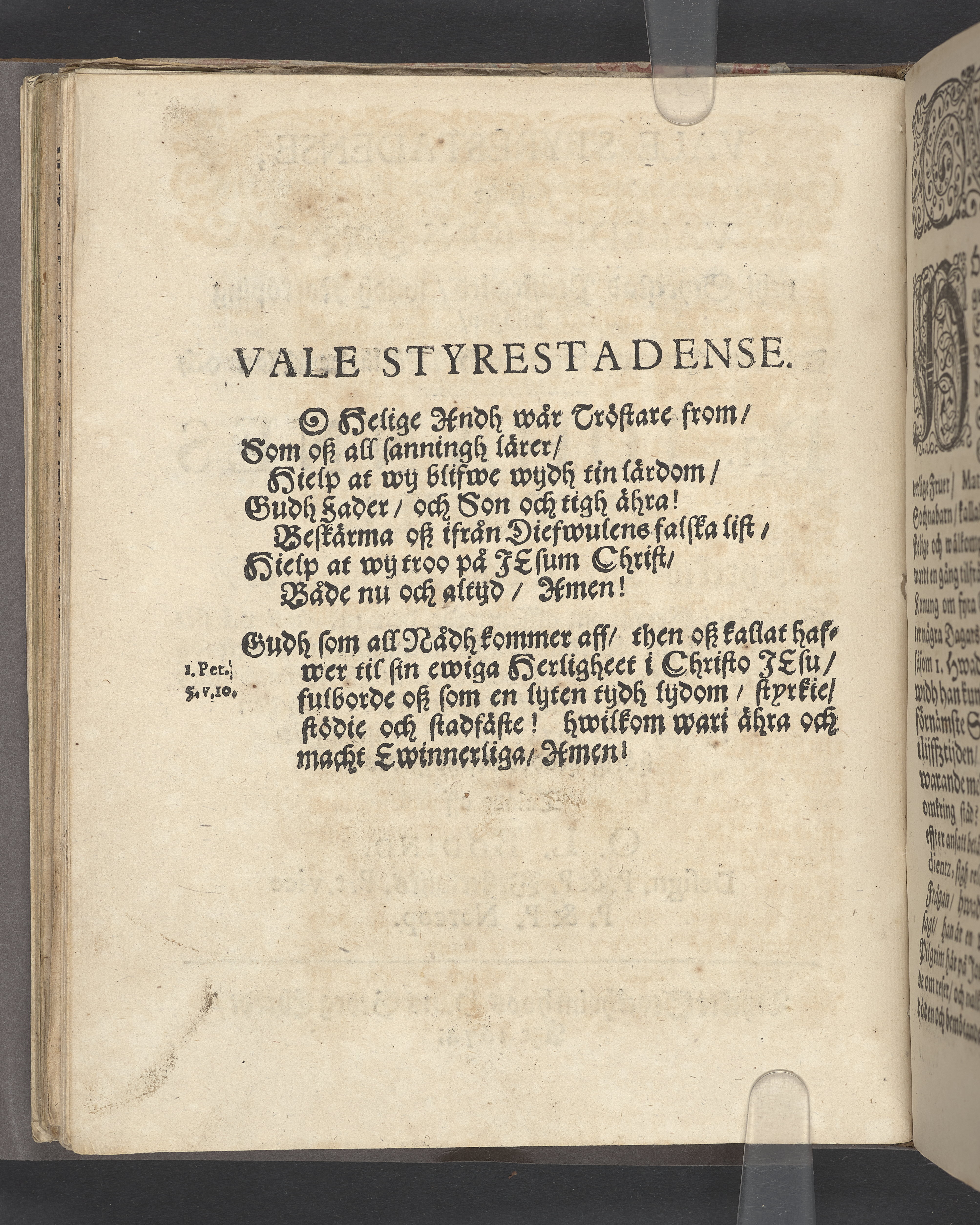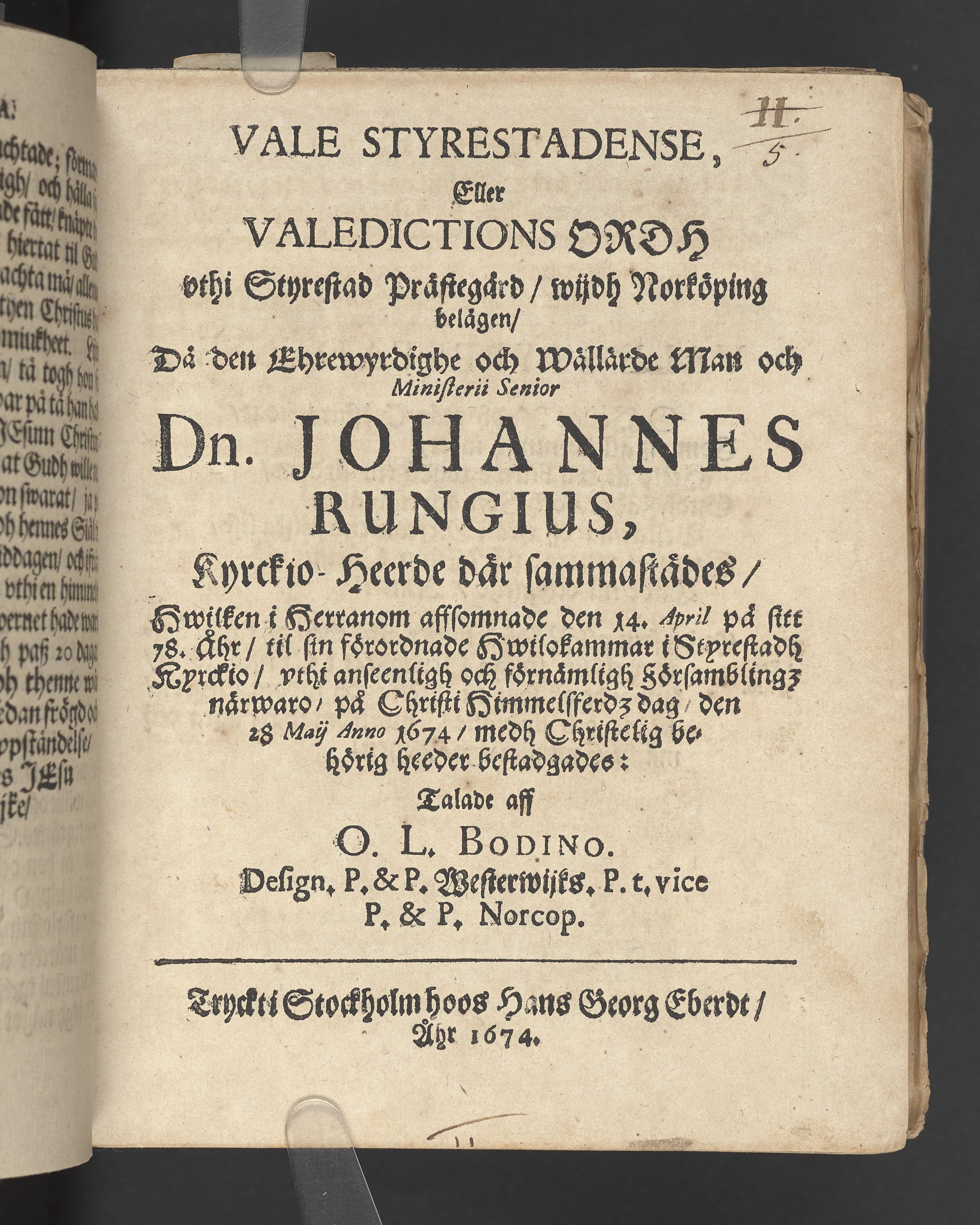 Vale styrestadense, eller valedictions ordh vthi Styrestad prästegård, wijdh Norköping belägen, då ... Dn. Johannes Rungius, kyrckio-herde ... til sin förordnade hwilokammar ... den 28 maij anno 1674, medh christelig behörig heeder bestadgades: talade aff O. L. Bodino ... Tryckt i Stockholm hoos Hans Georg Eberdt, åhr 1674.