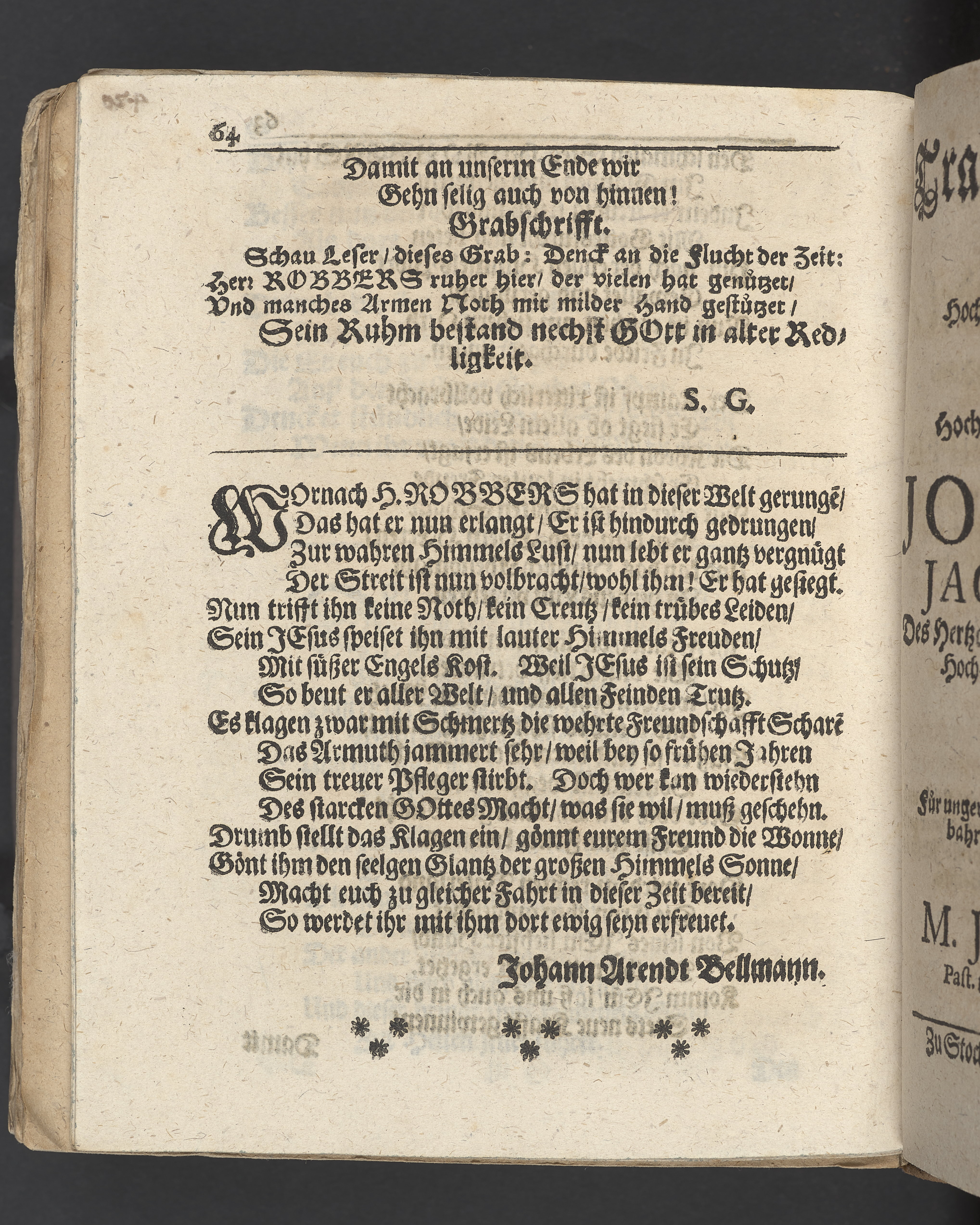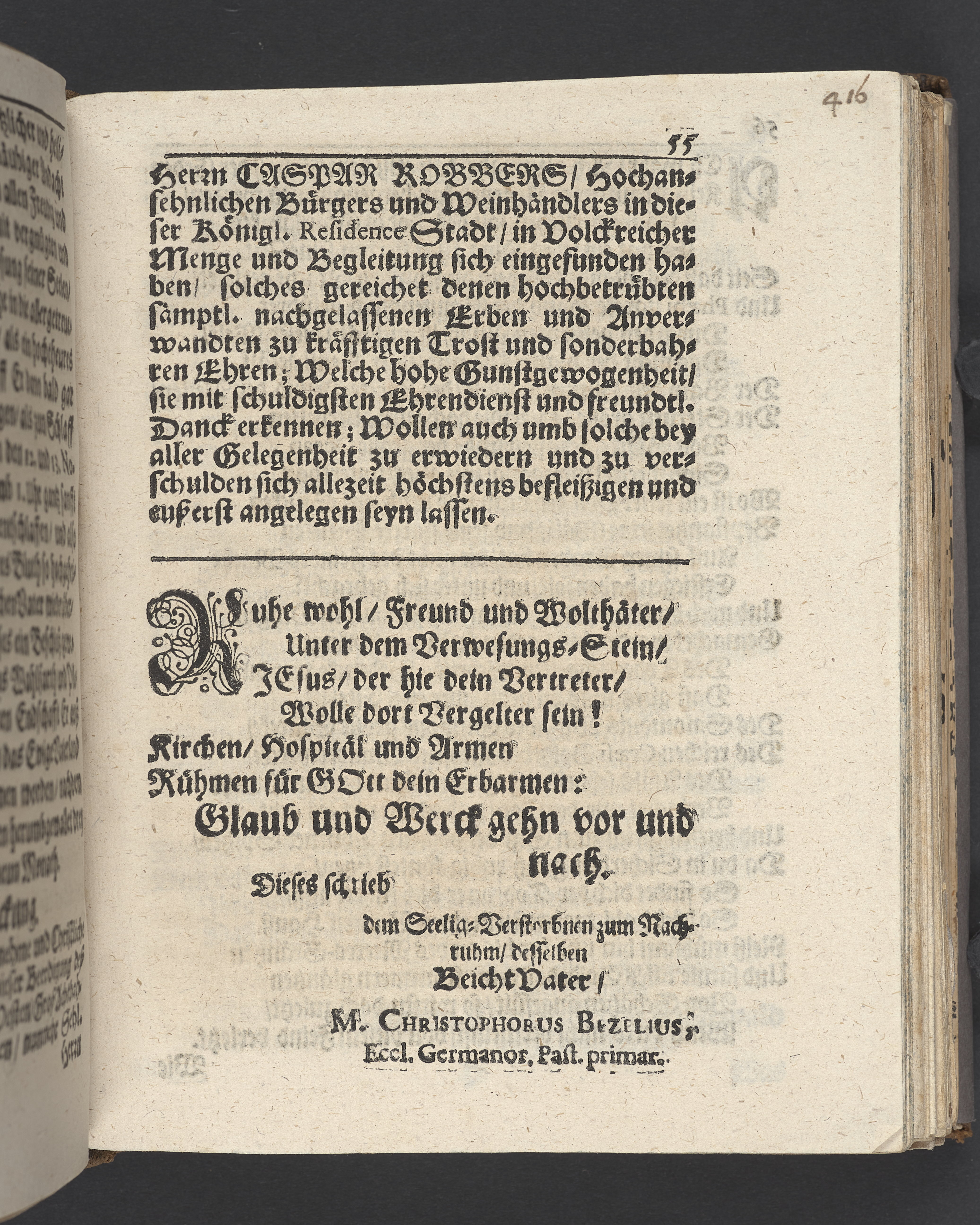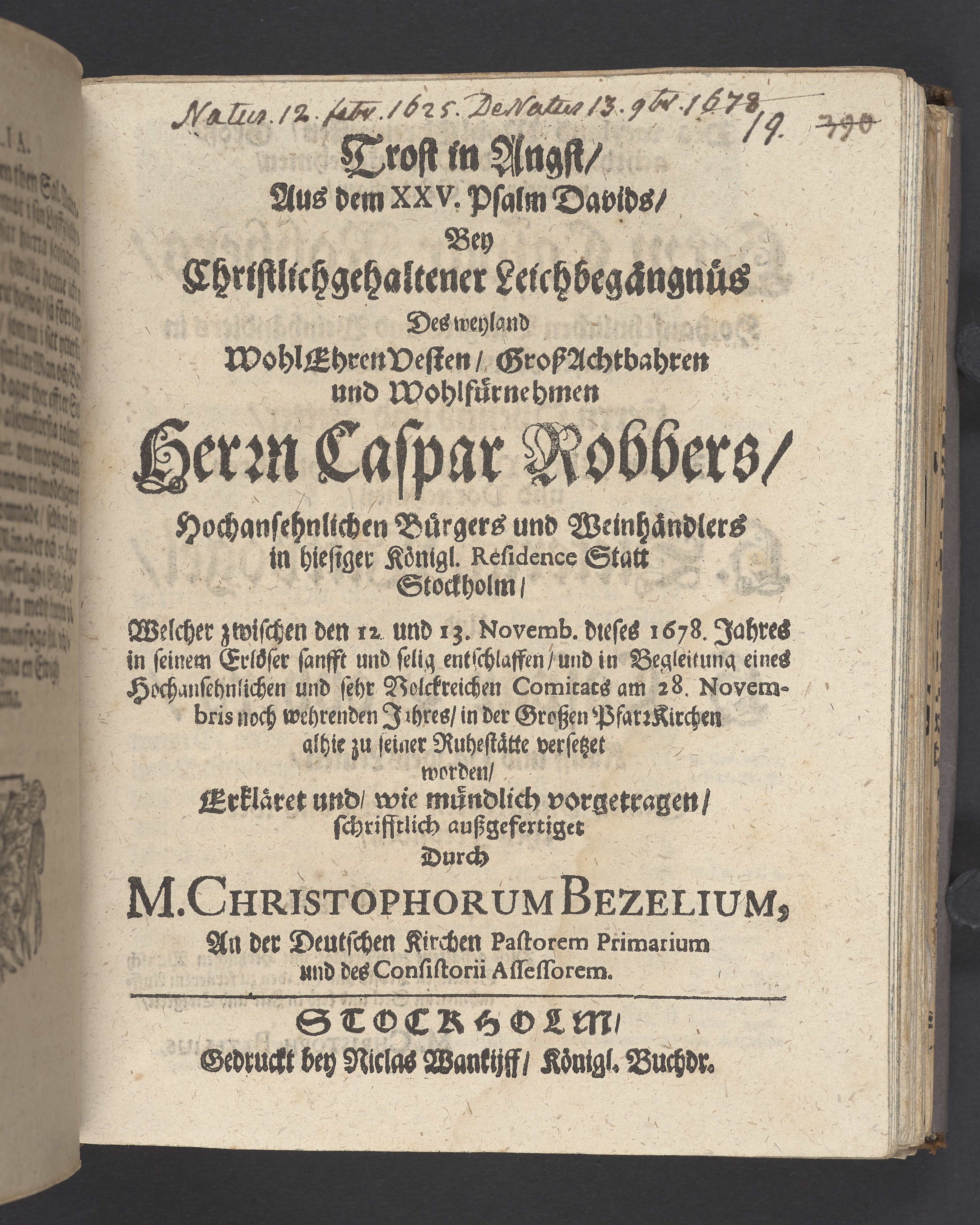 Trost in Angst ... bey christlichgehaltener Leichbegängnus des ... Herrn Caspar Robbers hochansehnlichen Bürgers und Weinhändlers in ... Stockholm, welcher zwischen den 12. und 13. Novemb. dieses 1678. Jahres ... selig entschlaffen, und ... am 28 novembris ... in der Groszen Pfarr Kirchen alhie zu seiner Ruhestätte versetzet worden, erkläret ... durch M. Christophorum Bezelium ... Stockholm, gedruckt bey Niclas Wankijff, königl. Buchdr.