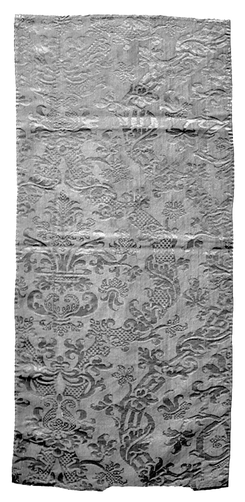 Sängkappa Av röd sidendamast med geometriska mönster och akantusblad. Inköpt av Wilhelmina von Hallwyl i april 1894 hos antikhandlare Alessandro Scavini, Intra, för 10 lire.
