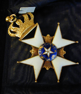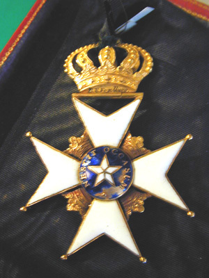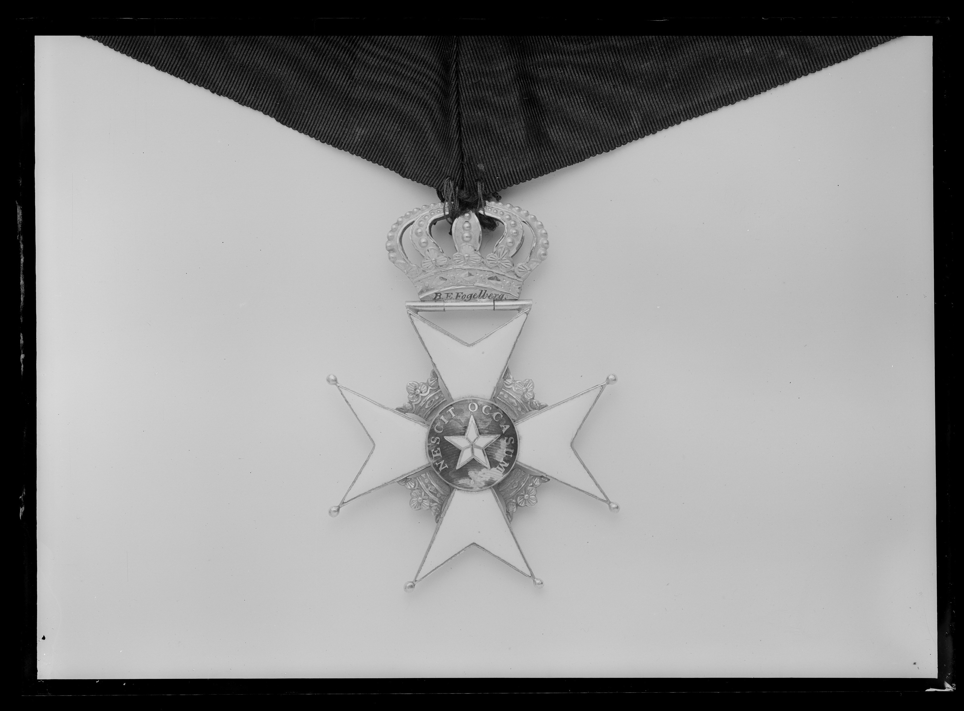 Vitemaljerat malteserkors av guld, kulor på de tre nedre korsarmarna. Mellan korsarmarna öppna kronor av guld. Välvd medaljong av guld och blå emalj, i mitten femuddig stjärna av vit emalj, runtom guldtext: "NESCIT OCCASUM". Mellan den övre korsarmens spetsar ett scharner och däri fäst en kunglig krona av delvis blankpolerat guld. Ovanför scharneret graverat: "Har tillhört" "B E Fogelberg".