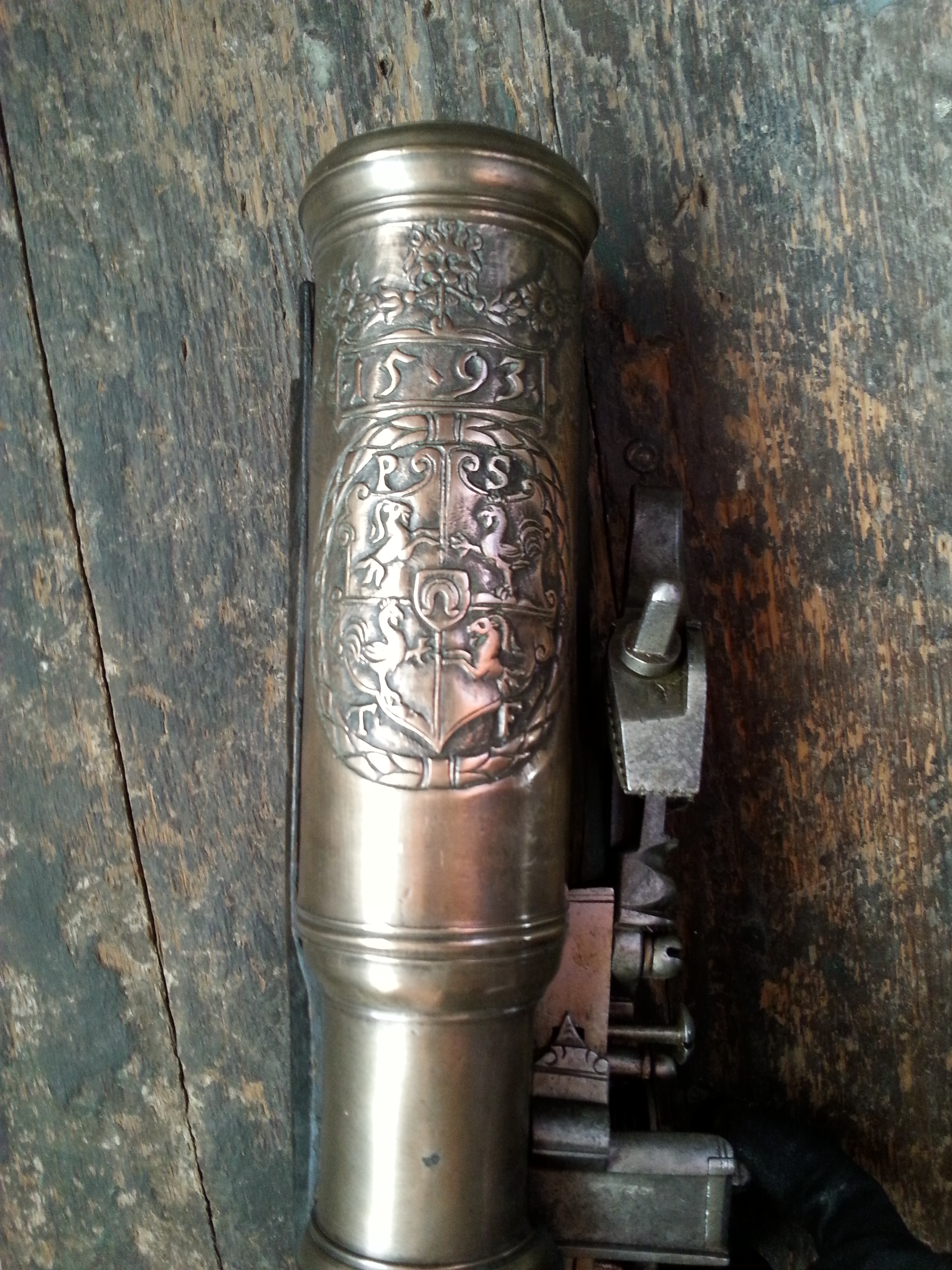 Rund, slätborrad pipa av mässing med smalare kammarstycke. Förstärkt, profilerad trumf och profilerad vulst framför svansskruvbladet. Graverat ägarevapen utfört i relief i en kvadrerad vapenkartusch - fält 1 och 4 har en upprest bock, medan fält 2 och 3 har en tupp samt en hjärtsköld med hästsko. Tre hjälmar med hjälmprydnader. Vapnet är omgivet av bokstäverna: "P.S.T.F.". Årtalet: "1593" under lejonmaskaron med blomsterguirland. På kammaren finns en ryttare till häst. Ett piphäfte i form av en hake. Hjullås. Tysk typ, kantiga former. Låsblecket har två stämplar: "HA" och en mansfigur (Stöckel nr 2745, Nyrnberg? ca 1580 - 1593) samt en stämpel med "S" under korslagda hammare (Stöckel nr 4430, Nyrnberg? ca 1575 - 1593). Hjulet är täckt av en genombruten mässingsskiva, fastskruvad kl. 9 och kl. 3. Obefintlig krutskärm. Hane med lös överkäke och kort fingergrepp. Hankroppen är ringformigt genombruten. På låsbleckets bakre del finns en virvelsäkring. Vertikalhjulstudel. Hel stock av svärtat trä. Fiskstjärtskolv av pistoltyp. Inlagd med graverade benplattor, runt svansskruvbladet med motiv med antikiserande krigare. På stockens vänstra sida avbildas drakar och en änglabyst. Näsband och pipstiftsunderlägg av ben. Ett piphäfte av trä. På varbygeln finns en stämpel med en kräfta (Stöckel nr 5348, Nyrnberg?). Utan tillbehör. Märkt: 684 ovanför låsblecket, stanstyp 5376. Enligt 1710 års inventarium p. 6, rum I, tillsammans med inv.nr 6211: "103, 104-683, 684-2 Musquedoner med Namn P.S. och årtal öfwer 1593, den ena med een Ryttare back på krut Cammaren, litet beensatte..".
