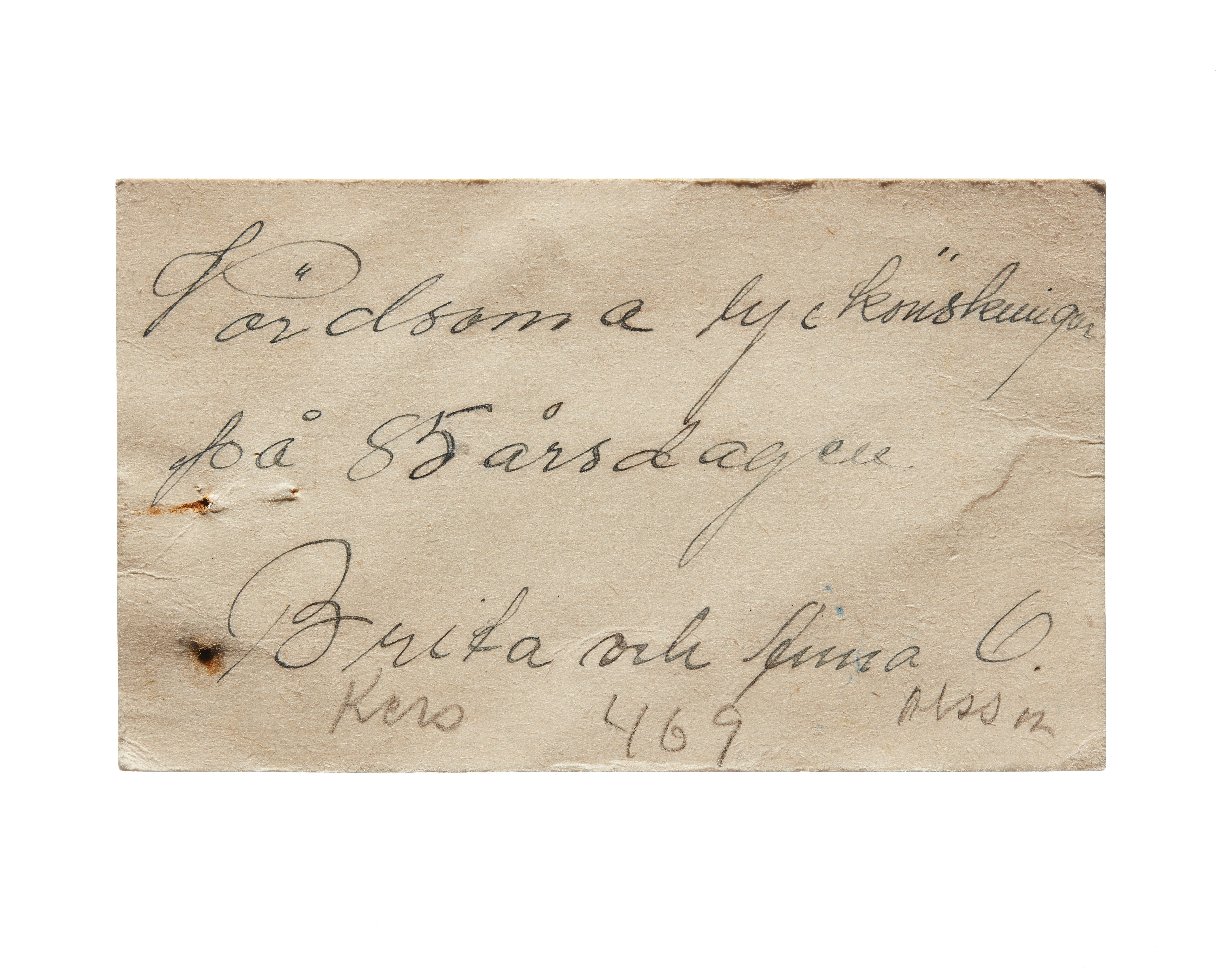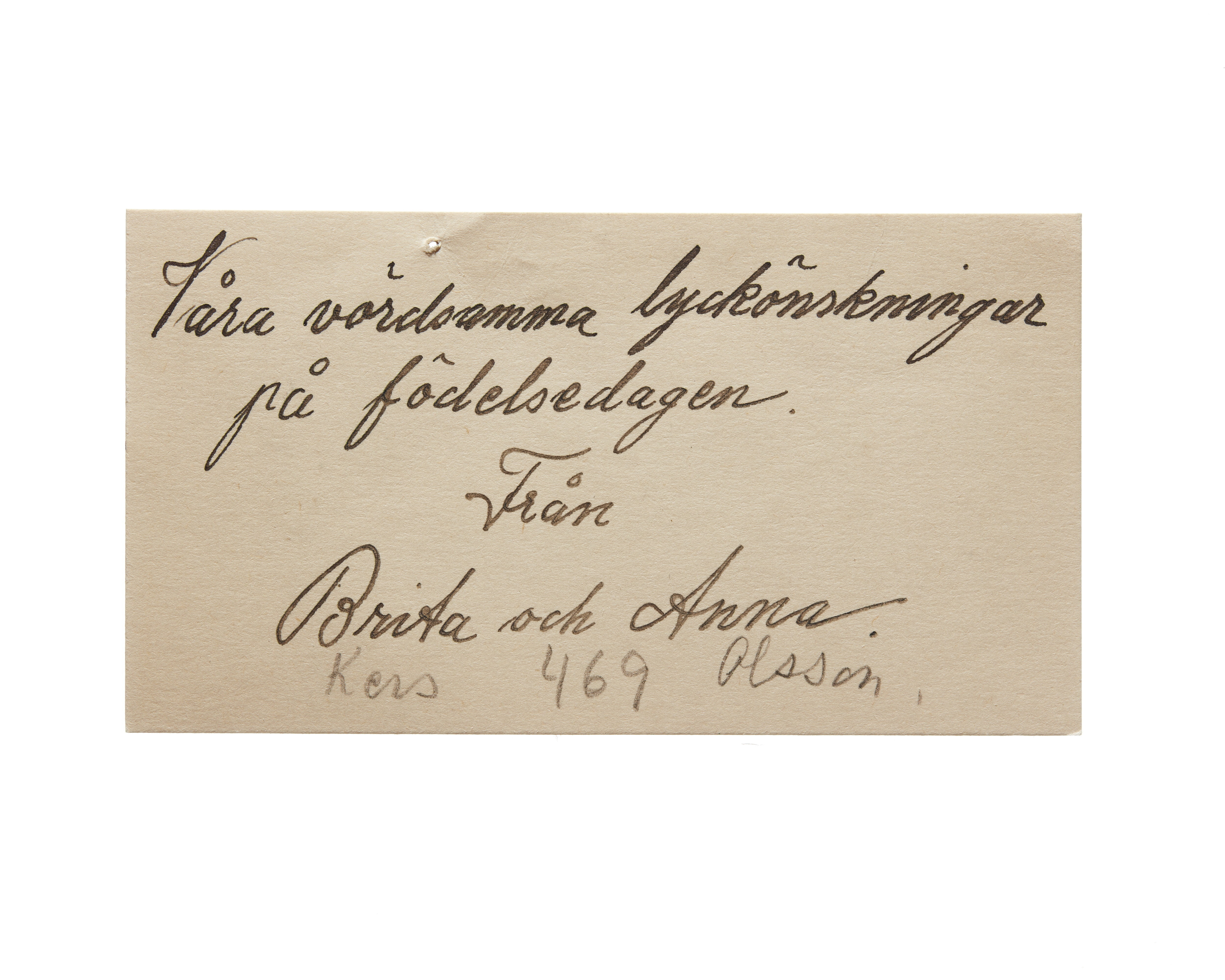 Två visitkort från Brita Kers och Anna Olsson. Första kortet daterat 1924. Handskrift "Våra vördsamma lyckönskningar på födelsedagen. Från Brita och Anna.". Andra kortet daterat 1929. Handskrift "Vördsama lyckönskningar på 85 årsdagen. Brita och Anna".