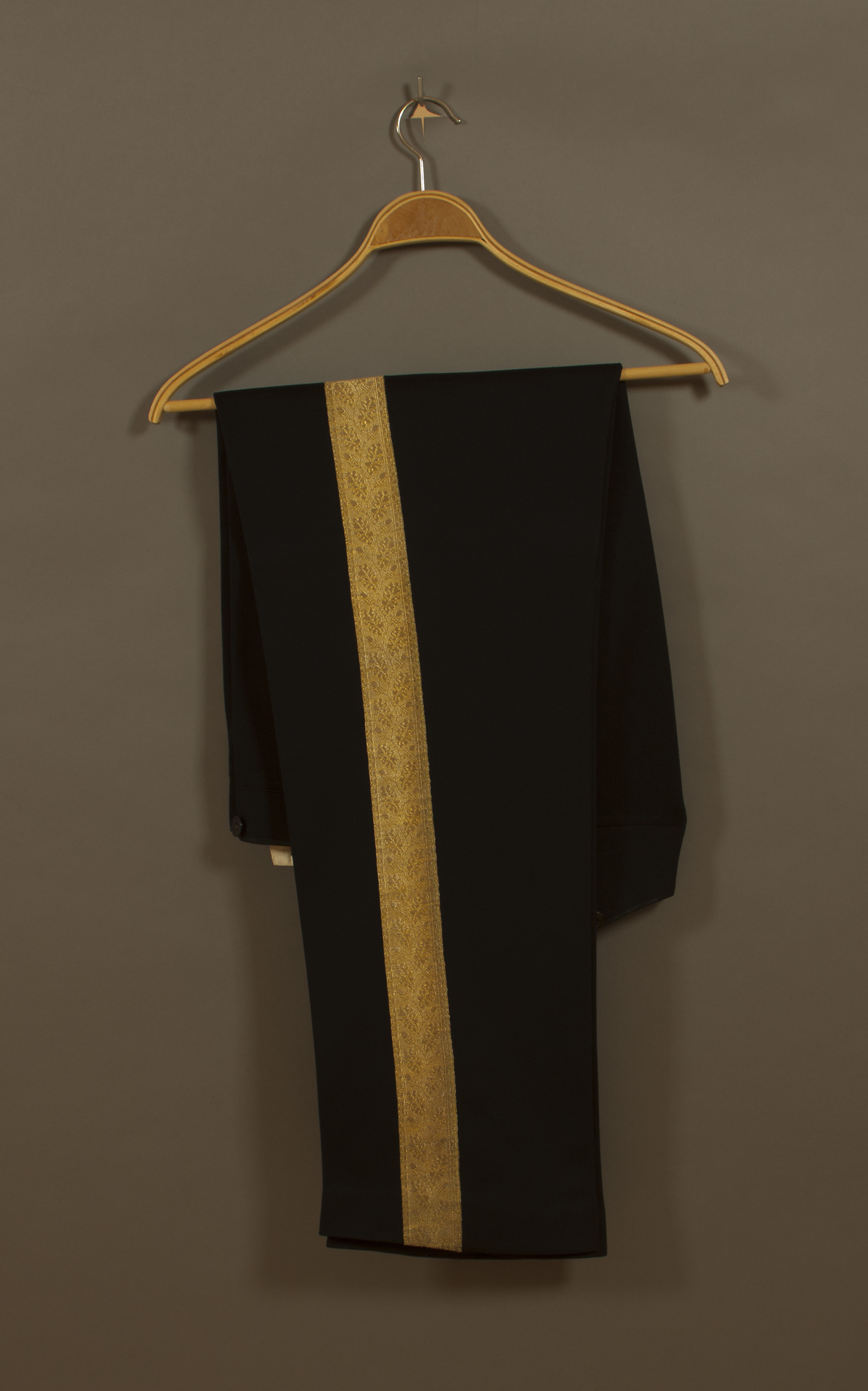 Koppelhylsa av mörkblått kläde sydd av dubbelt tyg med ett lodrätt och ett vågrätt sprund för värja och koppelhake. Upptill två knapphål för fästande i linningen.