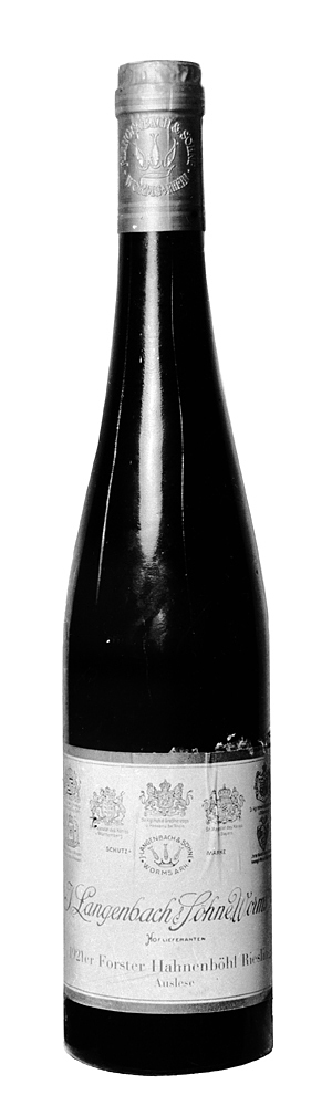 FORSTER HAHNENBÖHL, Reisling Auslese 1921, J. Langenbach & Söhnen, Worms a/Rhein, en helbutelj Butelj av mörkbrunt glas. Kägelformig, kring vars mynning en bandliknande utsvällning (s. k. stärkring); bottnen svagt skålig. Etikett vit, på denna text i brunrött samt varumärke och sju tyska furstliga vapen (hovleverantörsmärken) i svart. Kapsyl av förtent bly, rödgredelin, på denna varumärke och firmanamn i förgylld relief, ovanpå varumärke i svag relief. Höjd: 35,3 cm.; diameter: 7,5 cm. Inköpt av Wilhelmina von Hallwyl den 8 November 1929 hos AB Stockholmssystemet.