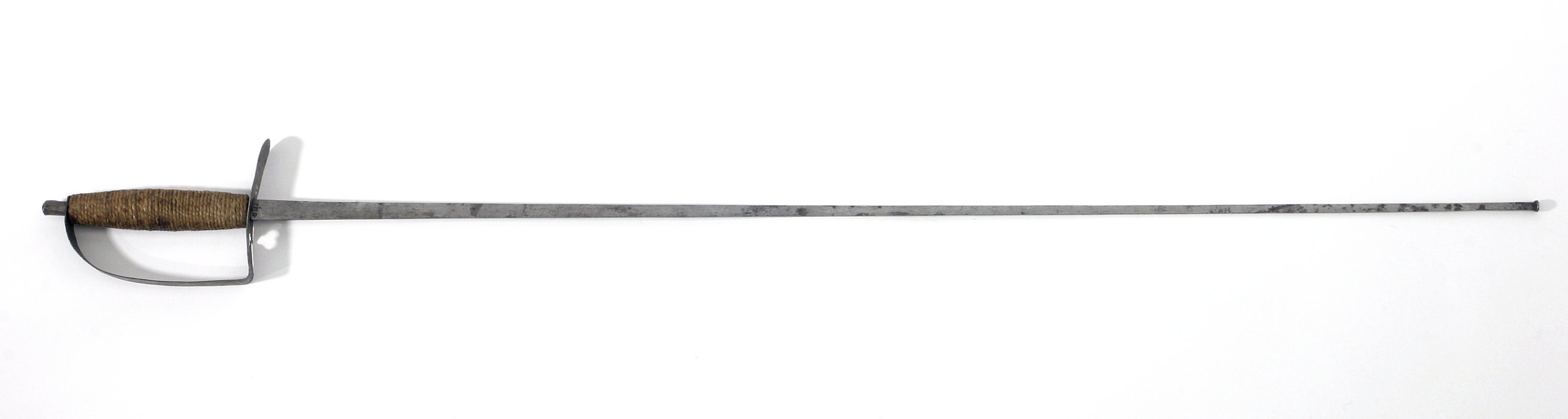 Fäste av typ som ett sabelfäste, av stål, utan ornering. Knapp i form av en tämligen smal cylindrisk, 16 mm hög hylsa. Handbygel och parerstänger av plåt, utformade i samma stycke, handbygelns överdel fäst mellan knapp och kavel, nederdelen tvärt inåtböjd och övergående i främre parerstången, denna med ett trepassformigt hål. Kavel något spolformigt, tätt lindad med tämligen tjockt segelgarn. Klinga rak, med rektangulärt tvärsnitt (nästan platt). Ytteränden formad som en tvärställd knapp, avsedd som underlag till en stoppad stötknopp. Basen utsida med instämplat tillverkarmärke: " I W D ".