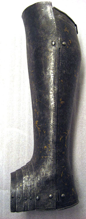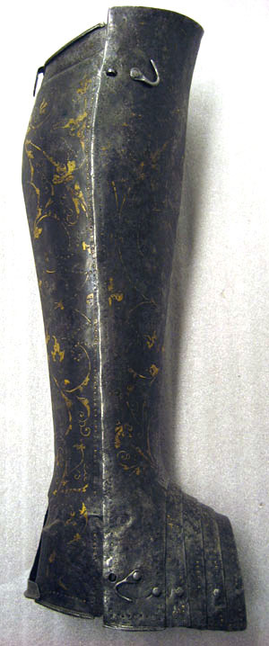 Driven stålplåt med på utsidan rankdekor av påslaget guld och silver mot mörk botten. Insidan brunaktig med tydliga hammarslag. Sammanlagt delar. Rörformig benskena bestående av två välvda halvor, drivna efter benets form med utbuktning över vaden, avsmalnande nedåt och bredare över foten. Bakre kanten vid knävecket snett avtagen och lutande utåt. Delarna fästade samman med mot insidan två gångjärn och mot utsidan upptill och nertill genomborrad tapp och hasp. I hälen ett vertikalt ställt rektangulärt hål, 65 x 17 mm. På bägge skenor en skarp mittås, framtill löpande från övre kant till skon. Upptill en hake av plåtbit, nitad på insidan och vikt över kanten. Sko av ursprungligen tio delar, nu återstår endast de fyra första skenorna. Dekor: Blånerad yta med skrafferade partier med påslaget guld och silver i form av slingrande rankor och blommor. Över och genom detta mönster löper slingor av punsade och guldfyllda prickar. Längs bakre skenans övre kant löper en försänkt bård med etsad och förgylld dekor av bladverk.