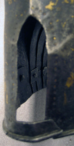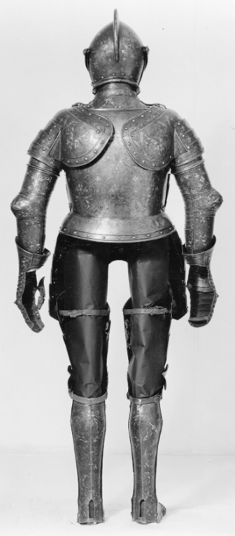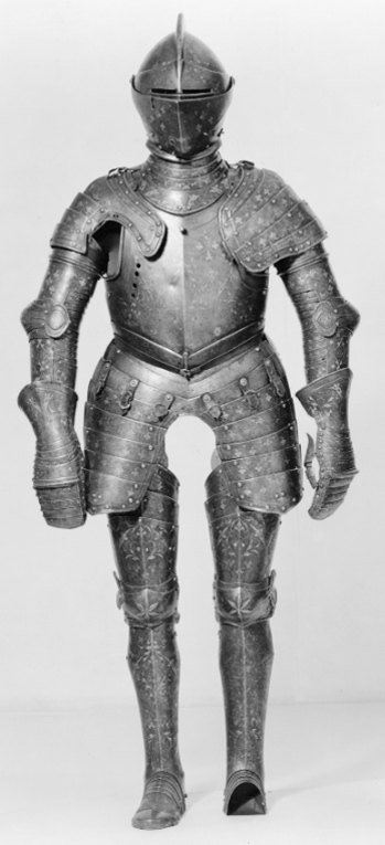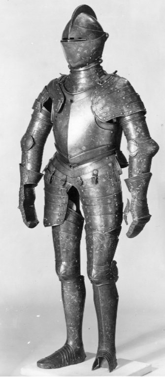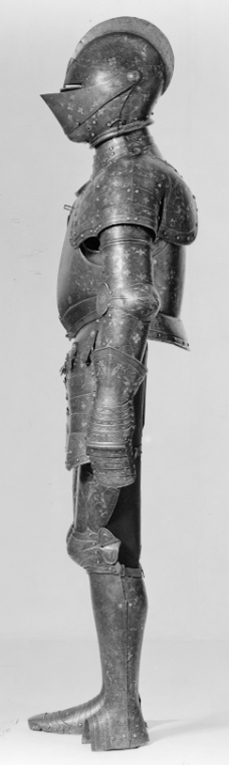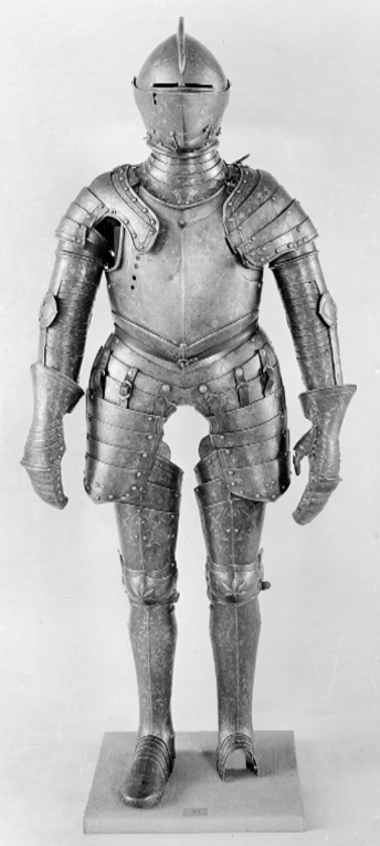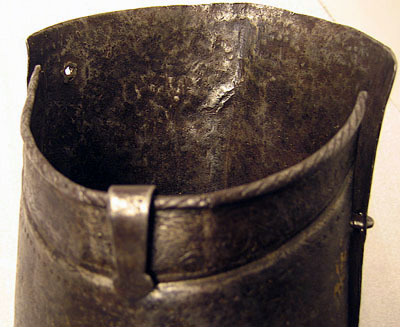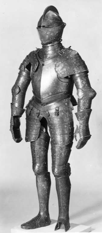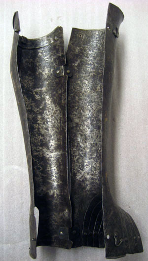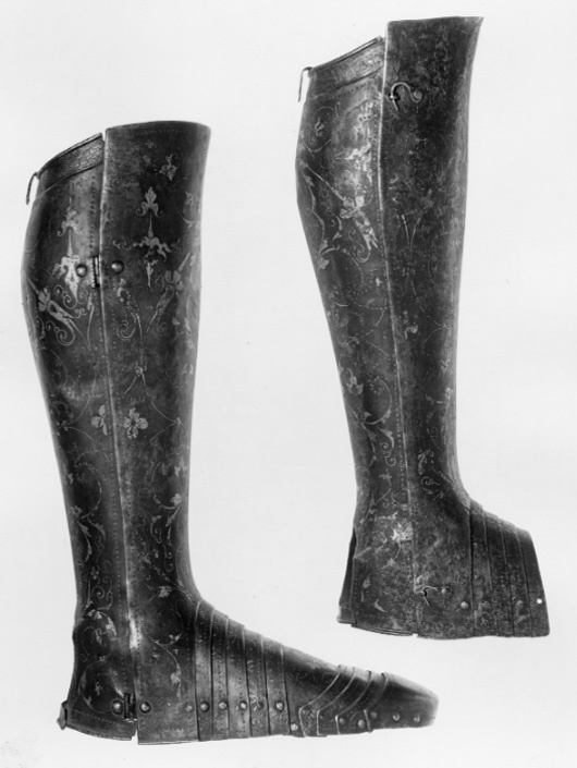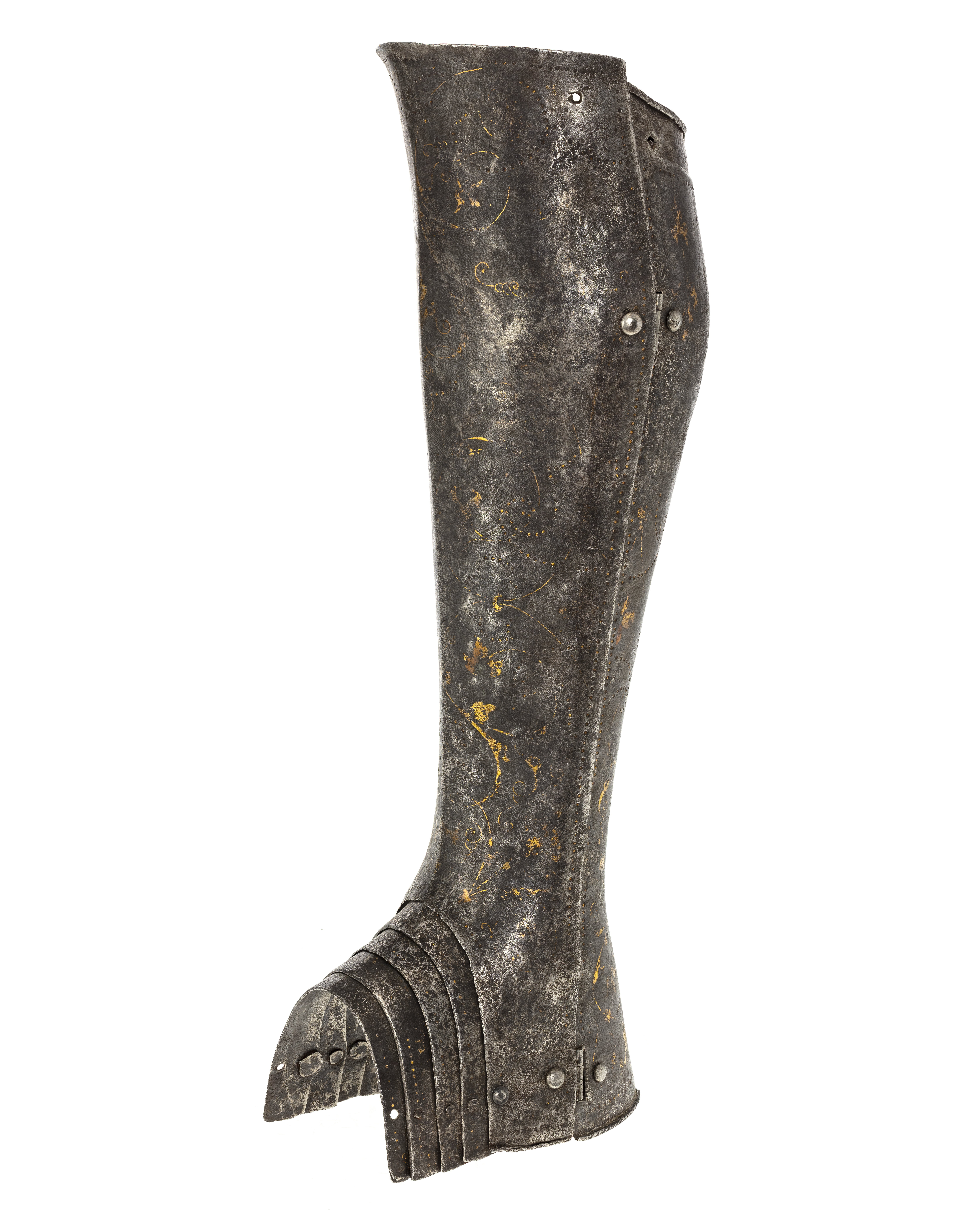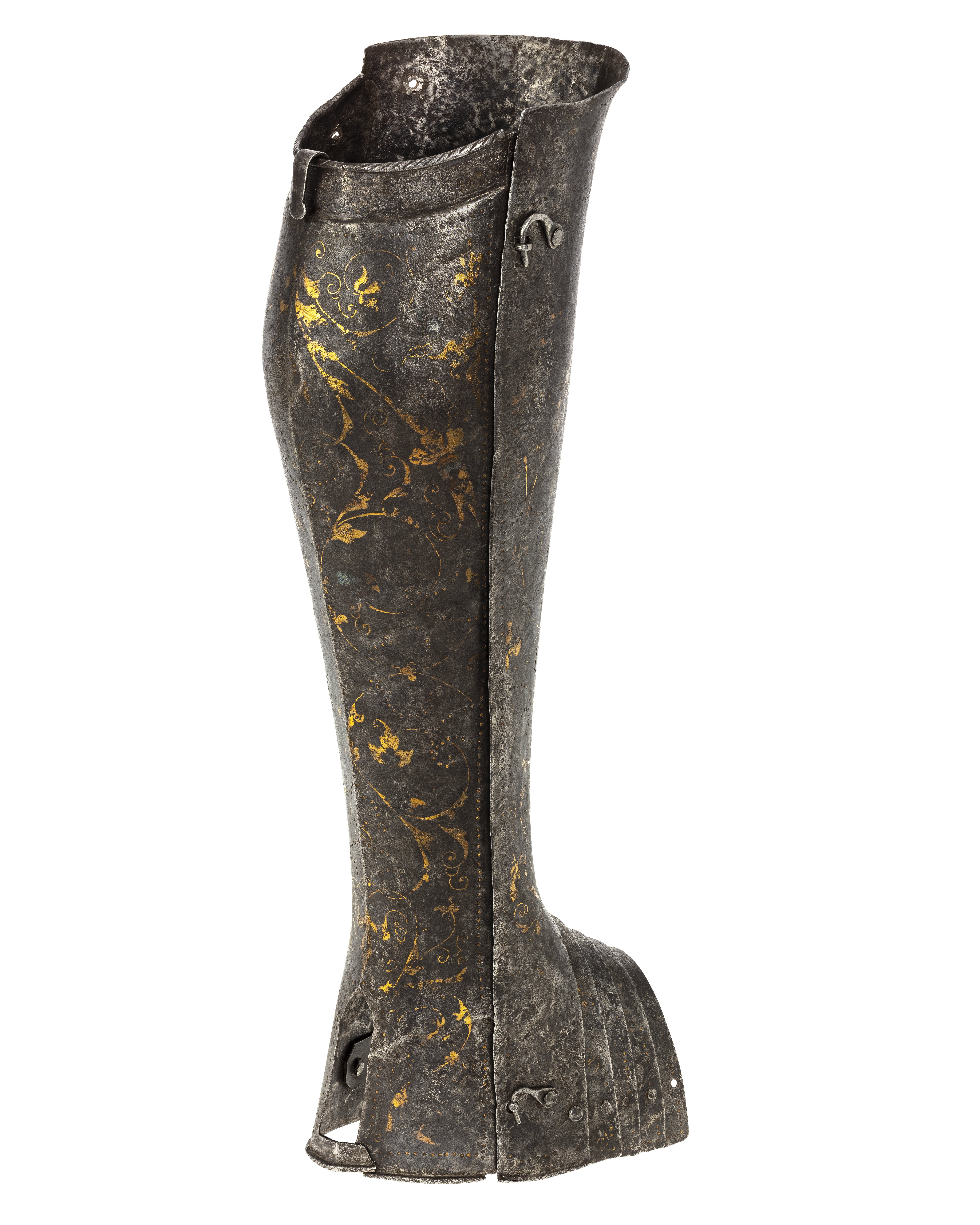 Benskena och harnesksko till helrustning. Tillverkad i Arboga åt Erik XIV som en gåva till Eriks halvbror hertig Magnus år 1564.