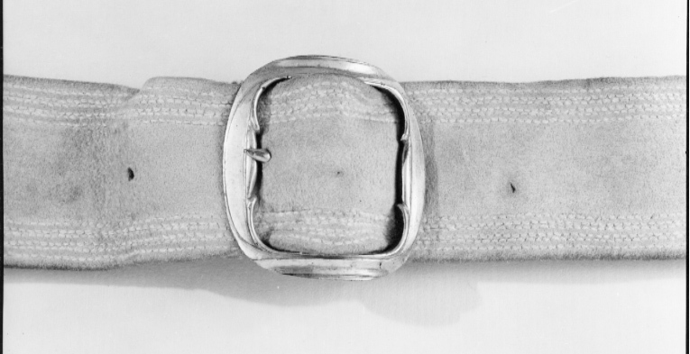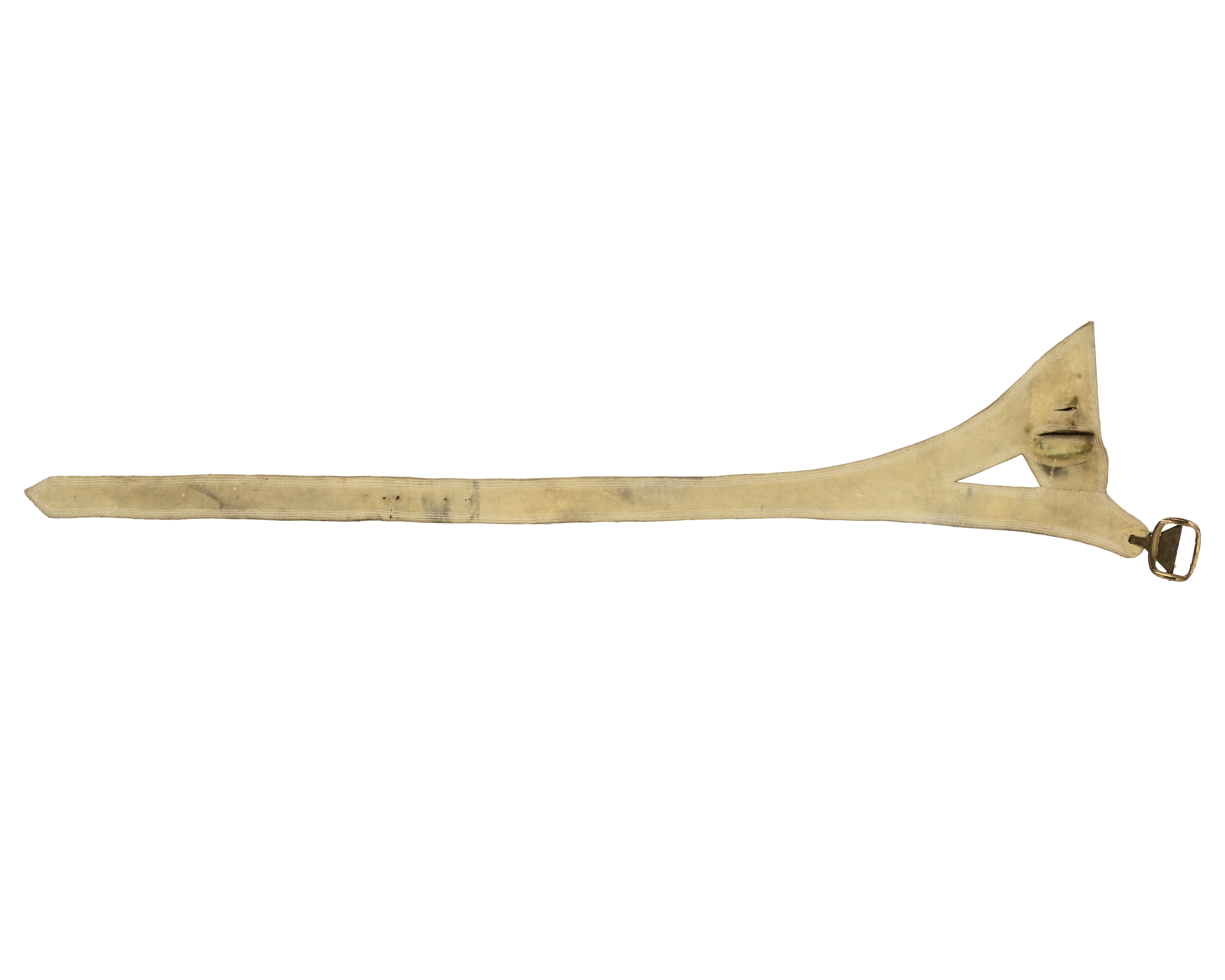 Livgehäng gult sämsk-skinn tillskuret i ett enda stycke med aningen svängd midjelinje. Vid koppelhylsan finns en tvärgående söm. Den nedhängande delen -koppelhylsan- har fäste för värja med en mindre och en större öppning. Längs med alla kanter löper fyra parallella dekorstickningar. Även längs med värjöppningen och trekantshålet vid koppelhylsan. Lilla hålet inramas av två kantstickningar. Foder i smidigare och tunnare skinn som är skarvat på flera ställen. Spänne i mässing med en stor krok på baksidan som hakades fast i runt hyål på gehängets kortsida när det skulle knäppas.