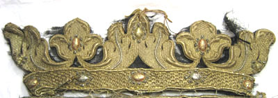 Dubbelsidig vapensköld av blå taft. Mitt på vapnet är i relief broderat en stående grip av röd och brun silkestråd samt förgylld silvertråd i läggsöm. Fjädrar på kropp och vinge är även broderade med ett krusat, förgyllt lan. Benskägget och svanstippen är av krusad röd silkestråd. Svansen utgörs av en tjock snodd av röd silkestråd. Klor och öra är av svart silkestråd och tänderna är av vitt ben medan gapet är broderat med röd silkestråd. En svart pärla samt silverlan utgör gripens öga som kantas av en tvinnad förgylld tråd samt av ett ögonbryn av en smal snodd av förgylld tråd. Gripen kröns av en adelskrona av förgylld metalltråd. Skölden kantas runtom av en tjockare och en smalare snodd av förgylld silvertråd samt av vit silkestråd ombundet av silvertråd utdragen i små öglor. Vapnet kröns av en grevekrona broderad med förgylld silvertråd. Kronringen är broderad i ett våffelliknande mönster kallat gaufrure och kantas liksom skölden av en tjockare och en smalare snodd. Mitt på kronringen samt mitt på vardera kronspets sitter fem stenimitationer av förgyllda lan omvirade med blå, grön och röd silkestråd. Lanen kantas av tvinnad förgylld tråd samt av små prickar av kantiljer av förgylld tråd. Kronspetsarna är fem till antalet och föreställer stiliserade blad med kanter broderade i relief.