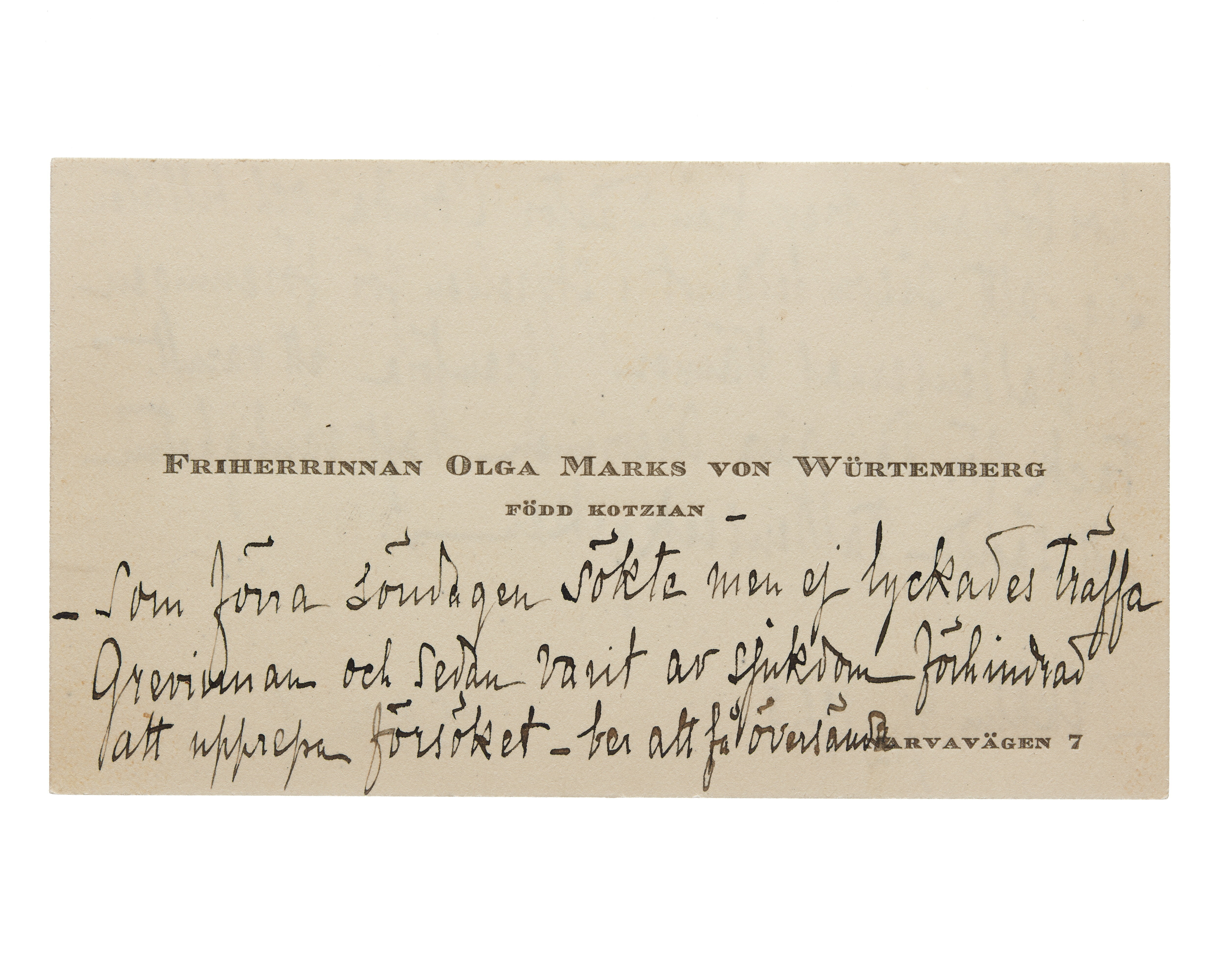 Visitkort från Friherrinnan Olga Marks von Würtemberg, f. Kotzian.