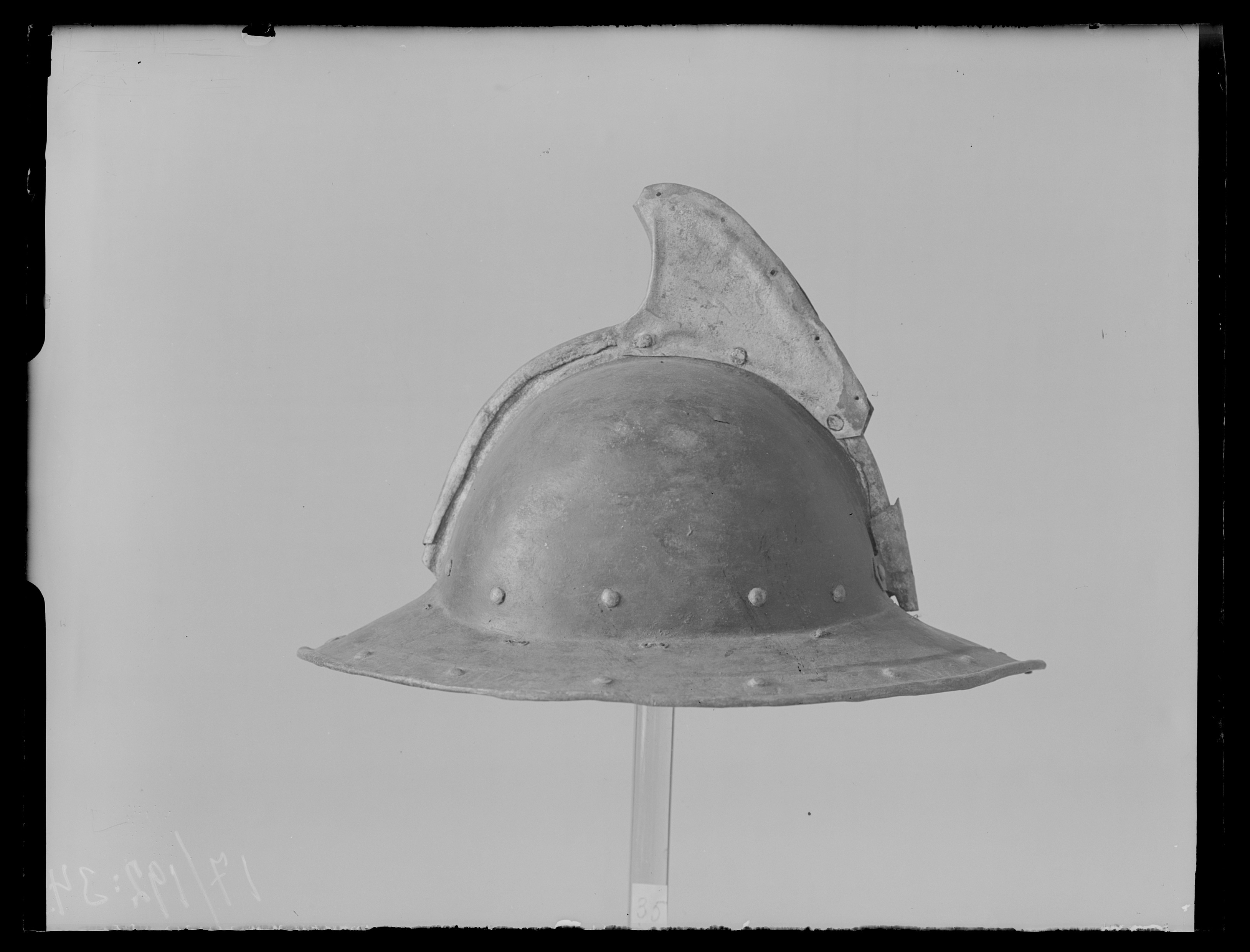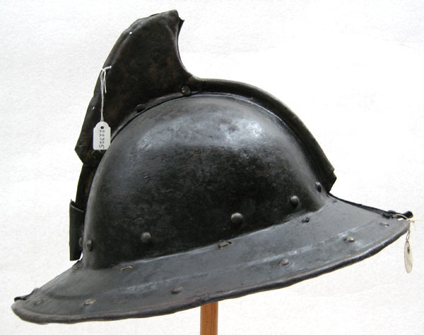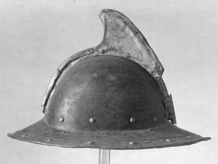 Av driven stålplåt. Utsidan målad svart med nederkant, kamkant och vinge ursprungligen guldgula, tydliga filspår. Insidan med slagmärken. Hjälm bestående av två halvor, sammanfogade i en längsmed klockan löpande kam, omvikt och förstärkt. Klockan rundad. Upptill på kammen är en senare (under 1700-talet) nitad dekoration i form av en trekantig något framåtsvängd vinge av bleckplåt, av två halvor fäst i kammen med tre nitar. Nertill övergår klockan i ett brätte, något neddraget med invikt rundsmidd kant och försänkt bård med falska uppdrivna nitar. På klockan baktill en plymhållare, H 53 mm, nedåt avsmalnande med spetsigt tillklippt överkant och tre hål, fäst med två nitar. I klockan nertill på var sida nitar i rad. I kanten där brättet möter klockan är en rad av små slagna hålpar hela vägen runtom. I klockan mitt på är ett liknande hålpar, ett på var sida kammen. I brättet framtill ett från insidan slaget hål samt stämpel liknande en hästsko. Hjälmfoder av grov lärft, hopsytt av två halvor. Under detta en stoppning av linblånor. Fodret är fastsnört i brättetts hålpar med linnetråd.