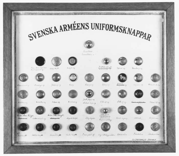UNIFORMSKNAPPAR 1 låda med 43 uniformsknappar uppmonterade på vit kartong med påskrift SVENSKA ARMÉNS UNIFORMSKNAPPAR. Under varje knapp anges tillhörighet inom armén: Fr.v. Kungl. Generalitetet, Svea Livgarde, Göta Livgarde, Livregementet till fots, Västgöta regemente, Karlskronas grenadjärsregemente, Upplands infanteriregemente, Skaraborgs-, Södermanlands-, Kronobergs- och Jönköpings regementen, Dalregementet, Hälsinge-, Älfsborgs-, Hallands- och Bohusläns regementen, Västmanlands-, Norrbottens-, Västerbottens-, Kalmar-, och Värmlands regementen, Jämtlands fältjägarregemente och Norrlands dragonregemente, Norra Skånes och Södra Skånes infanterirgementen, Vaxholms grenadjärsregemente, Gotlands infanteriregemente, Andra Svea trängkår, Västernorrlands infanteriregemente, Andra Göta trängkår, Kungl. Livregementent till häst K !, Kungl. Livregementets dragoner K2, Kungl. Livregementets husarer K 3, Kungl. Smålands husarer K 5, Kronprinsens husarregemente K 7, Norrlands dragonregemente K 8, Kungl. Skånes dragonregemente K 5, Artilleriet-, Fortifikationen, Första Svea trängkår, Första Göta trängkår, Östgöta trängkår, I armén kvarstående officerare, Väg- och vattenbyggnadskåren, Fältläkarkåren, Intendenturen och Fältveterinärkåren. Gåva till Wilhelmina von Hallwyl julafton 1929 från dotterdottern Carola Wachtmeister med make Axel, vilka också författat ett tillhörande julklappsrim (se inv.nr S. Gr LXIV:I:H:g.5).