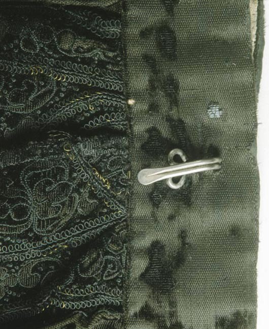 Byxorna är av samma tyg och har samma broderi som tröjan. De är av rak modell och består i huvudsak av 4 stora stycken med raka sömmar i sidorna och sneddade sömmar framtill och baktill. Mitt fram finns det ett 35 cm långt sprund med en 28,5 cm lång knäppslå med 12 knapphål. Upptill har byxorna en 5-4 cm bred linning skarvad av 4 bitar, den går i motsattriktning av tyget mot byxorna i övrigt. Numera finns 4 st hakar av silver kvar, men intryck i sammeten visa att det ursprungligen varit 8 st (vilket också stämmer med tröjans 8 tampar). Linningen knäpps med 2 knappar (d: 1,8 cm) klädda med svart tagel samt 2 st (5 cm långa) knapphål. Linningsknapparna är träkulor omspunna med 2 och 2 vänstertvinnade tageltrådar som lagts i koncentriska cirklar. Invändigt är linningen förstärkt med grov linnelärft (22x20 tr/cm2). I sidsömmarna har 22 cm långa sprund lämnats öppna för byxfickorna. Ficksäckarna är av linnelärft som stofferats med samma brokadfoder som tröjan. Varje ficka består av 3 brokadbitar. De 2 stora fickornas djup är 36 cm till överkanten, den lilla fickan på högersida, c:a 18 cm från kanten mitt fram, har ett 11,5 cm långt sprund. I linningen finns som vanligt en liten urficka på vänster sida fram, placerad mellan 10 och 25 cm från framkanten räknat och ca 14 cm djup. Den är sydd av finare linnelärft (28x25 tr/cm2). Genom dess hål har den första haken trätts. Först ca 5 cm nedanför linningens nedre kant börjar knäppslån, som blott är synlig 1,5 cm utanför byxkanten. Dess 12 knapphål, 2,5 cm långa, är sydda medca 9 stygn/cm med svart högertvinnat silke. De 12 knapparna på motsatta sidan är bara 0,9cm i diameter. De finns alla kvar. De är sydda med svart silke "tät nätning". Knäppslån är fodrad med svart taft (84x35 tr/cm2, den saknar avgränsad stadkant). Skoningen i sprunden liksom på tröjans ärmar utgörs av svart rips. Byxorna har vid knäna också försetts med styvnad av grov linnelärft (10x10 tr/cm2). Byxornas broderi är utfört i en ca 13,5 cm bred vertikal kantbård på fram- och baksidorna utefter sidsömmen, som även försetts med en ca 2,5 (ev.3) cm bred svart, knypplad spets. Efter ett mycket smalt bandformat mellanfält av oregelbunden form (ca 1 cm brett) följer så en ny bård, 12 cm bred, som går i vinkel nedtill vid lårens yttersidor. Bården sträcker sig ej ända ned till byxkanten utan följer tygets trådraka randning, så att man längst ned fått ett kilformigt broderiparti (vilket ju beror på att byxornas nederkant sneddats) som blott är 5 cm högt utåt i hörnet, där den vertikala kantbården kommer ned, men ca 9 cm högt inåt. Byxornas mest kilformiga parti är ej försett med något broderi. I nederkanten har en fin spets suttit (den är nu mycket defekt). Man har alltså först klippt till plagget och känt till hur man skulle sammanfoga dess olika delar innan man gjorde dekoren. På byxorna syns i fodret, på insidan, spår efter fastsydda bandrosetter. I 1671 års inv. angives att det skulle finnas silver- och silkesband häftade i rosor framtill. Det synes som om det skulle varit 5 på varje sida, ordnade i en övre horisontell rad med 3 och är under 2. Intet mellanfoder finns i byxorna. På insidan sitter ett foder av vit linnelärft (25x24 tr/cm2). Byxorna har en bit urbränd i linnefodret på vänster sida fram. De är i fodret med bläck märkta: N 57 (= nr i 1789-90 års inv.).