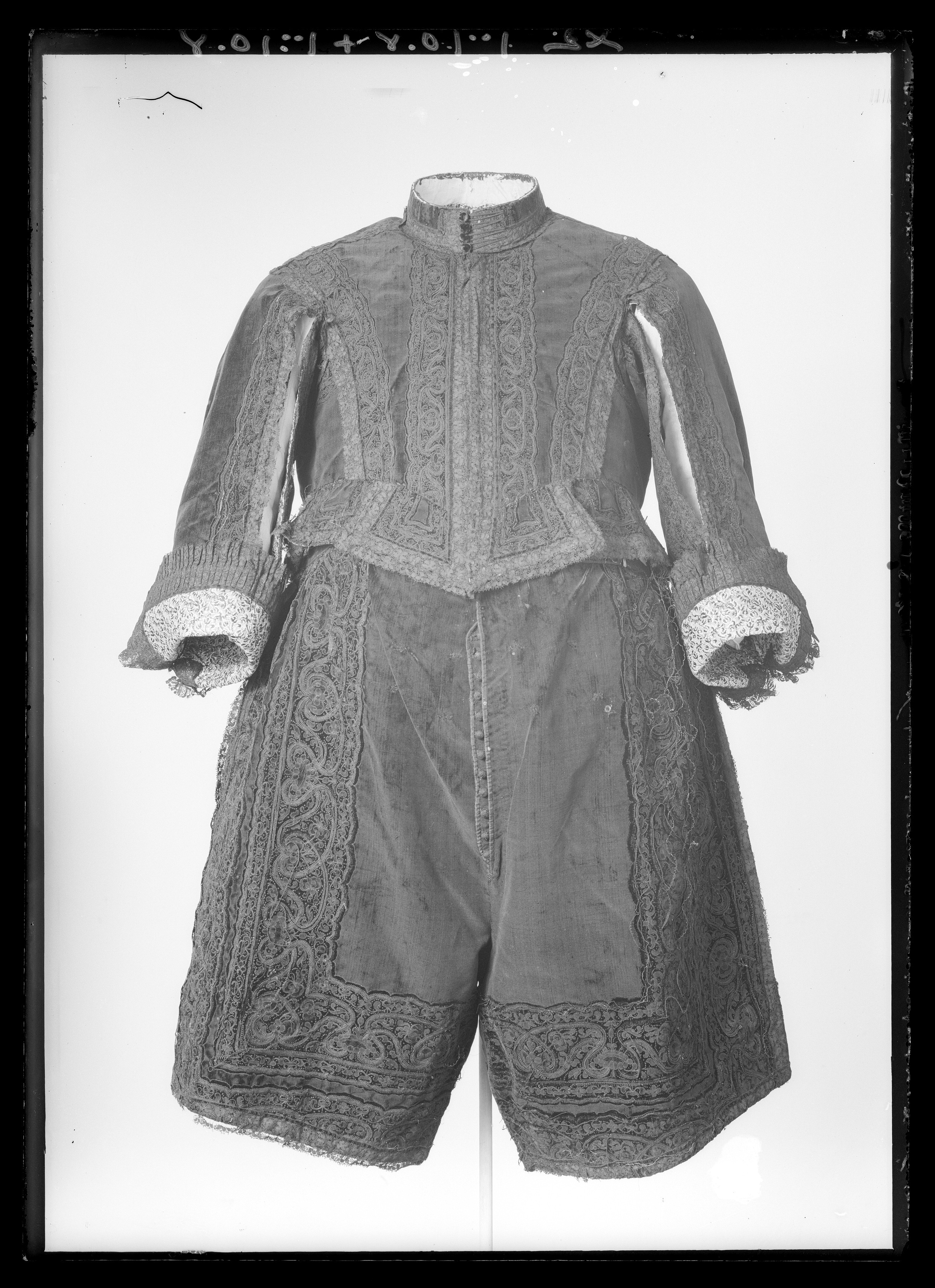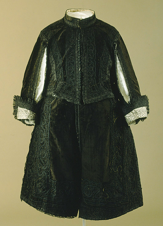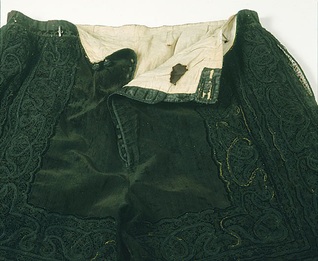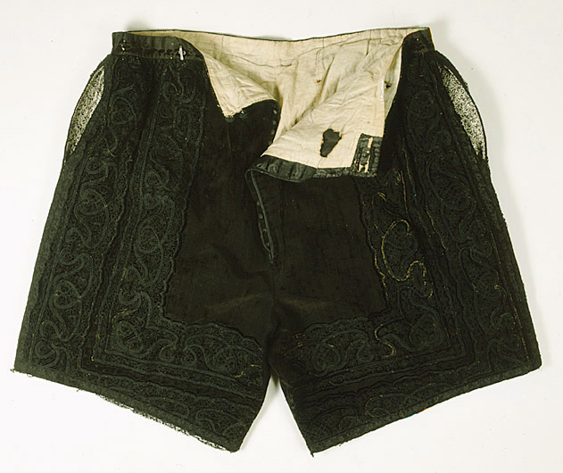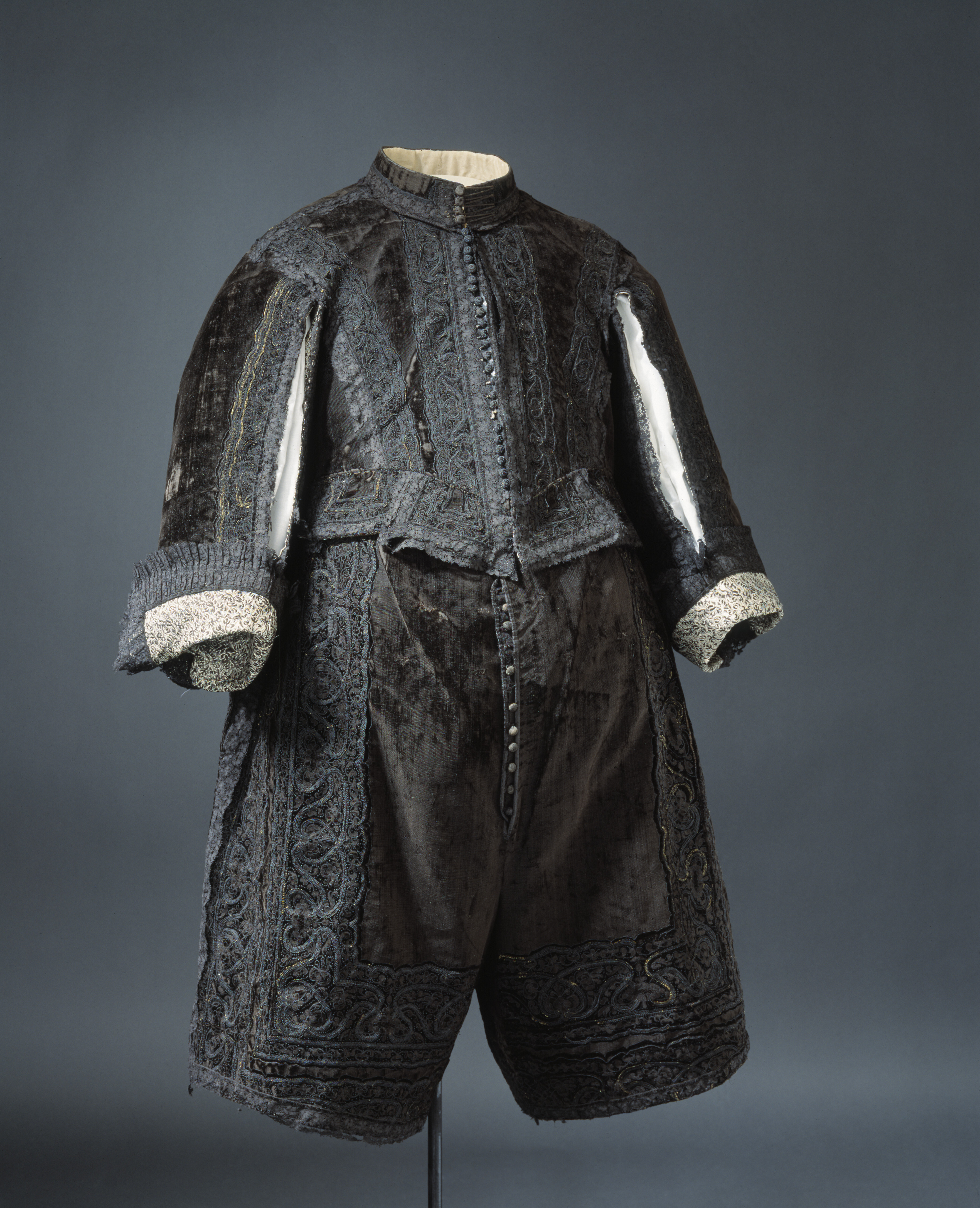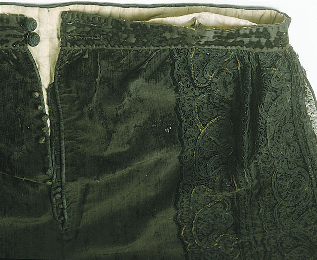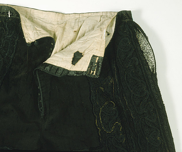 Byxor av svart oskuren sammet. Tillhört Karl X Gustav (1622-1660). Förmodligen tillverkade av Pärlstickare Augustinus Herden, Nürnberg, ca 1650.