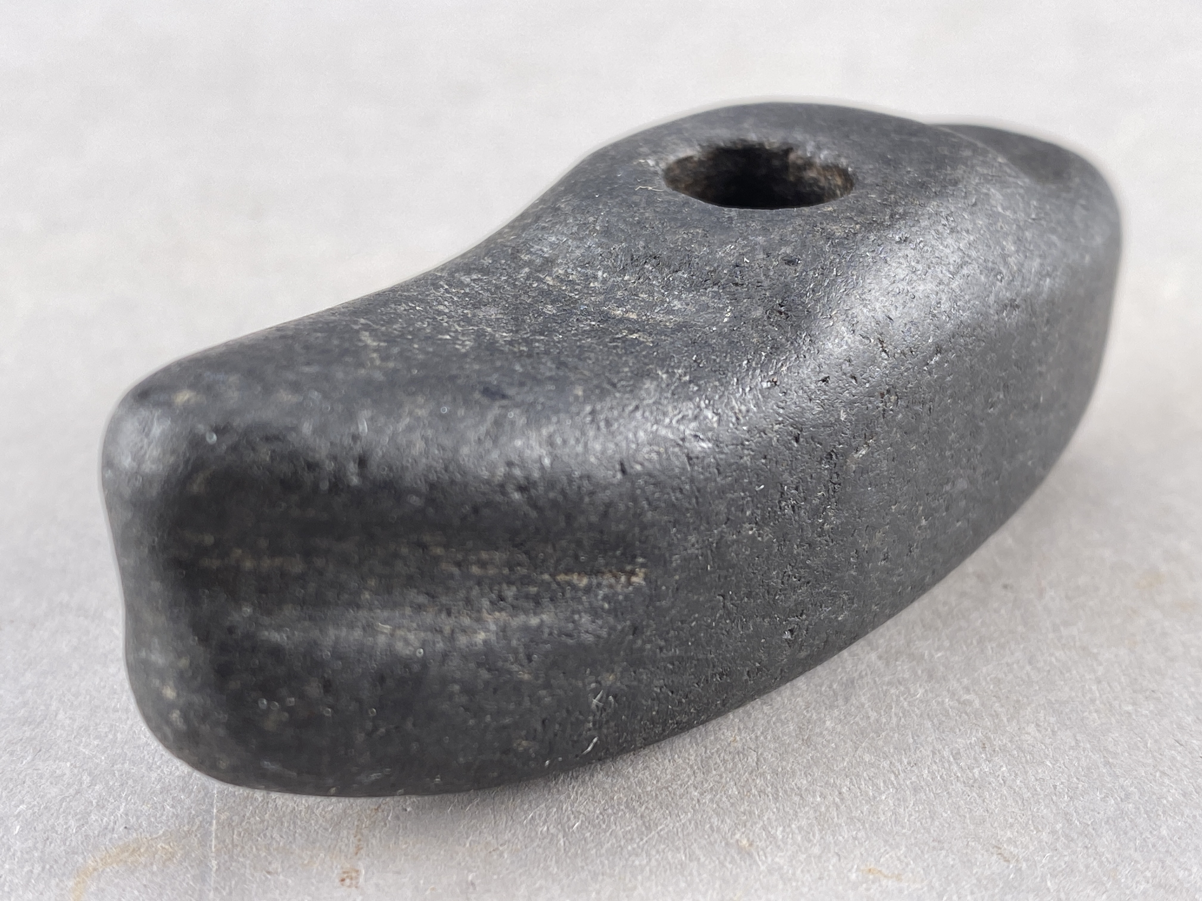 Mininatyrbåtyxa av svart bergart. Mycket liten, med skafholk och breda smalsidor.