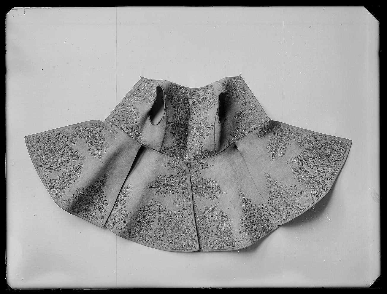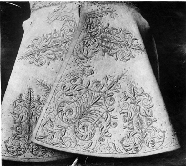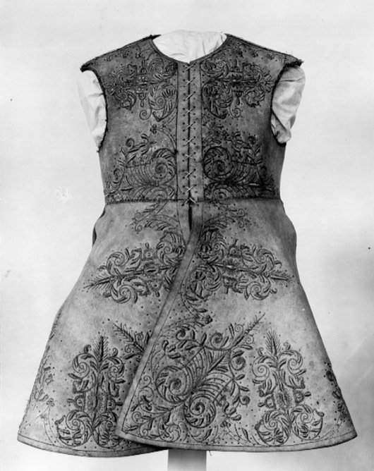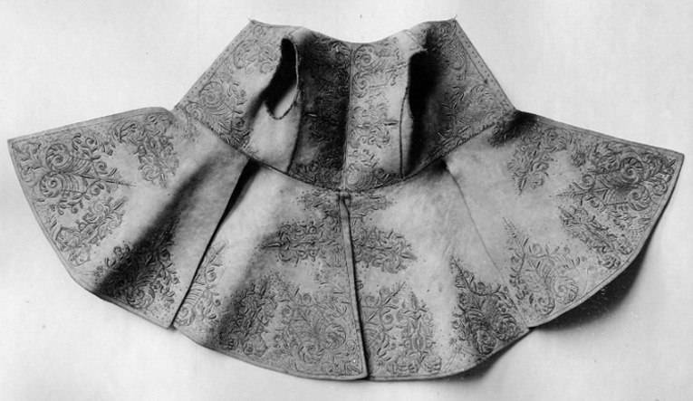 Kyller av älghud, tillskuret med livsöm och utan ärmar. Mitt bak och i sidorna ett snedskuret sprund från livsömmen. Broderier med guld- och silvertråd samt paljetter i form av rank- och blomornament. Broderierna koncentrerade till kanter och hörn. Foder av ljusblått linne. Baksidan av broderiet med gult och vitt lingarn. I livets framkant nitton små hål på vardera sidan för snörning.