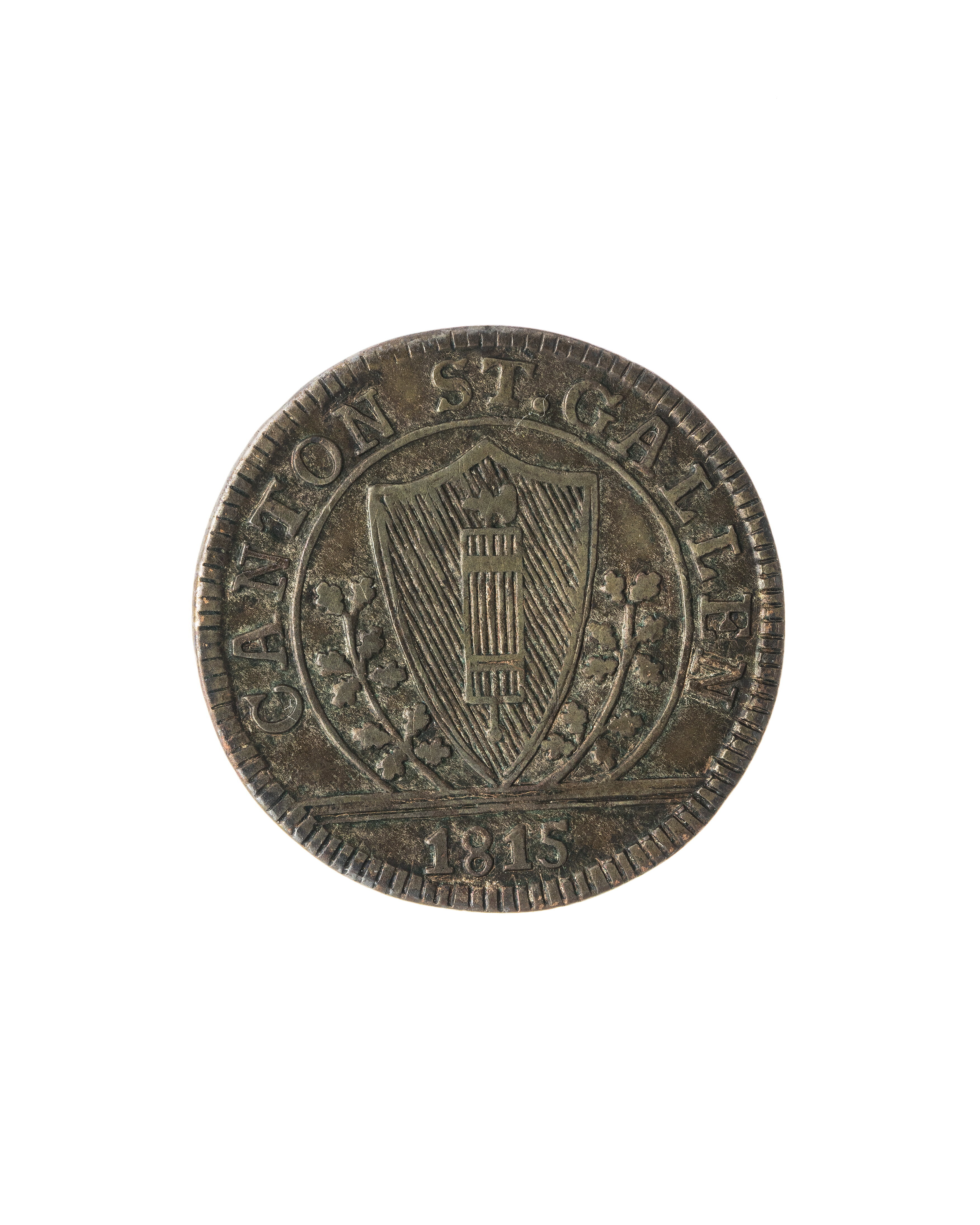 Åtsida: krans och därinnanför: "1 // BAZEN" samt K. Frånsida: sköld med skraffering för grönt, däri faces, omkring skölden två ekkvistar. Omskrift:"CANTON ST. GALLEN", i avskärning nertill: 1815. Räfflade kanter. Har tillhört Gustav IV Adolf under landsflykten. Gåva efter sonens (Gustav, prins av Vasa, 1799-1877) död av sondottern, drottning Karolina av Sachsen till kammarherre Adam Magnus Emanuel Lagergren (1844-1920). Enligt uppgift gåva av honom till LRK via Göteborgs museum (se brev 208:1907).