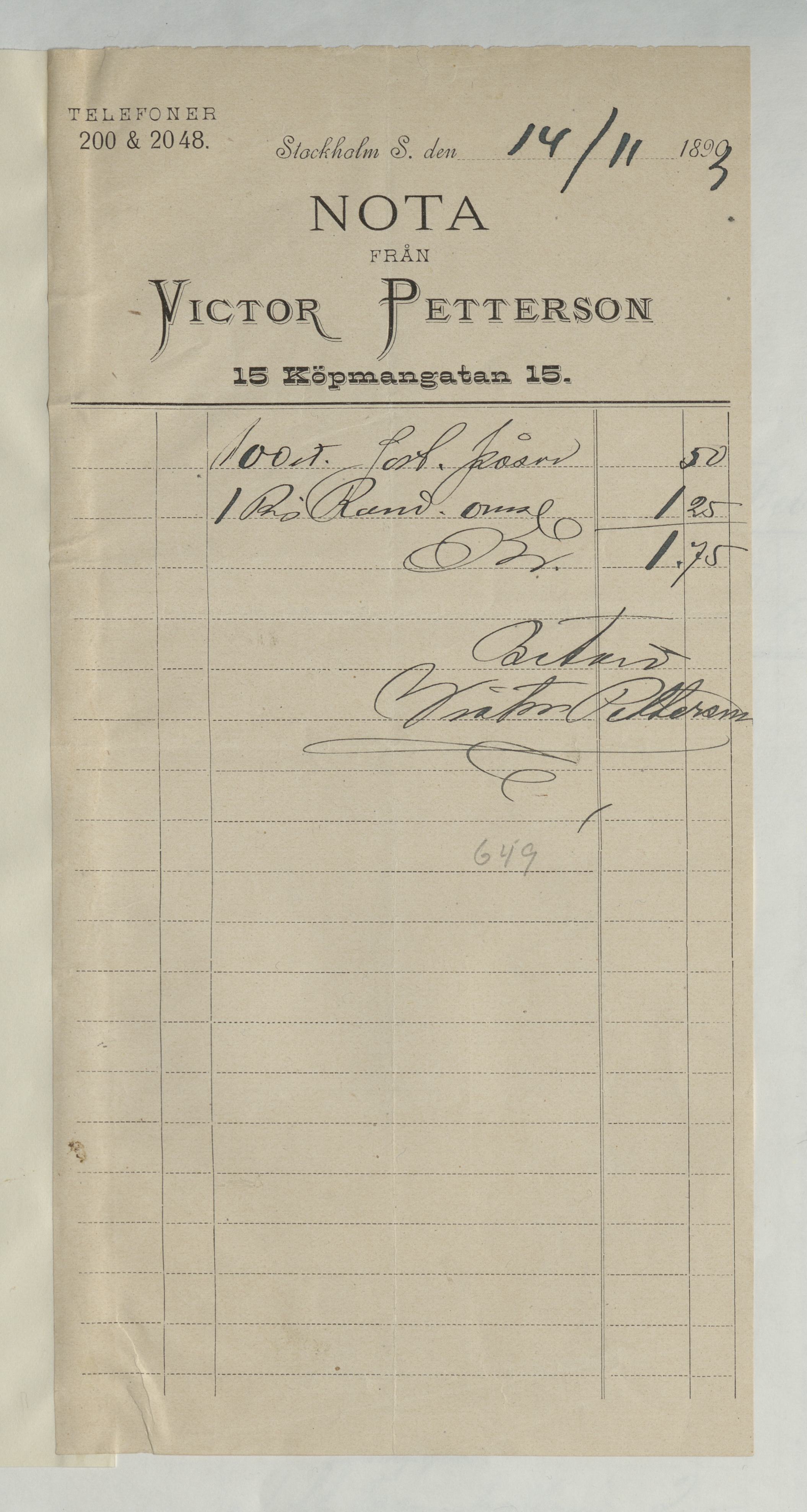 Kvitto från Victor Pettersson för "påsar", för totalsymma 1:75Kr. Betalt Stockholm 14 november, 1892