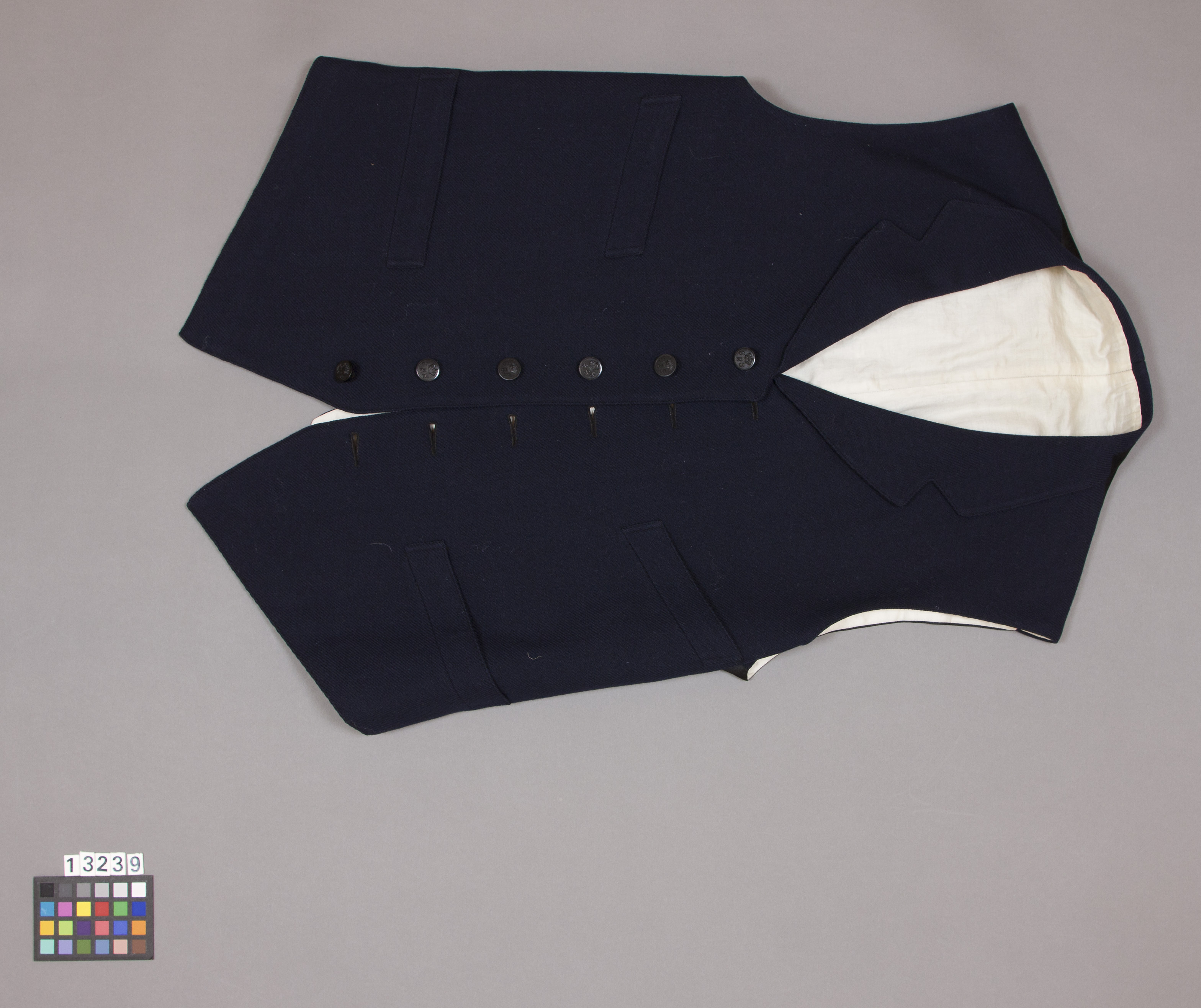 Väst av mörkblått ylle med krage och slag, enkelknäppt med sex plana plastknappar, d: 15 mm med irelief en krona och bokstäverna: "S S S". Fyra stolpfickor. Bakstycke av svart sidenatlas medspänntampar och sölja märkt: "SOLIDE". Foder av vitbomullsatäng.
