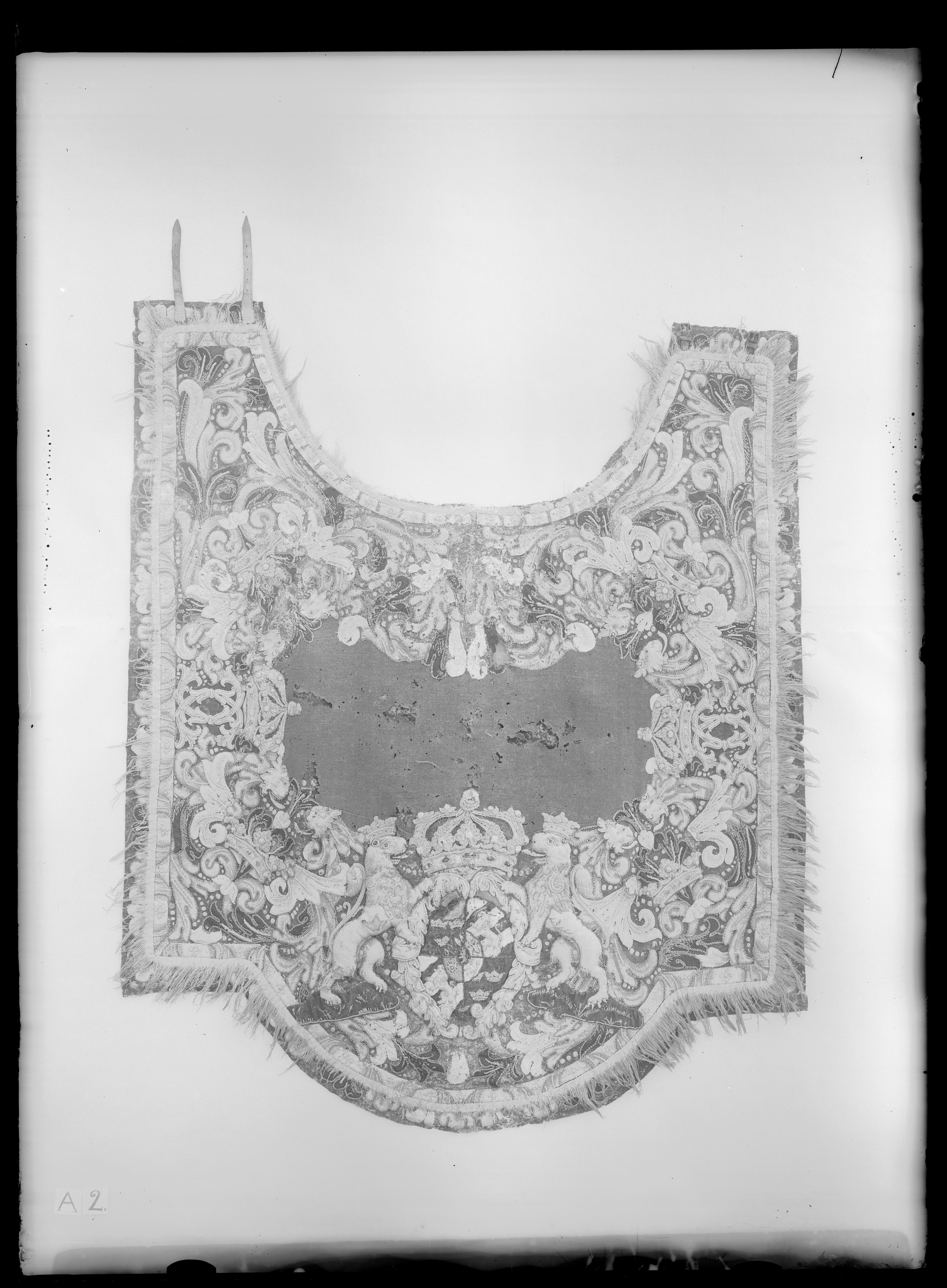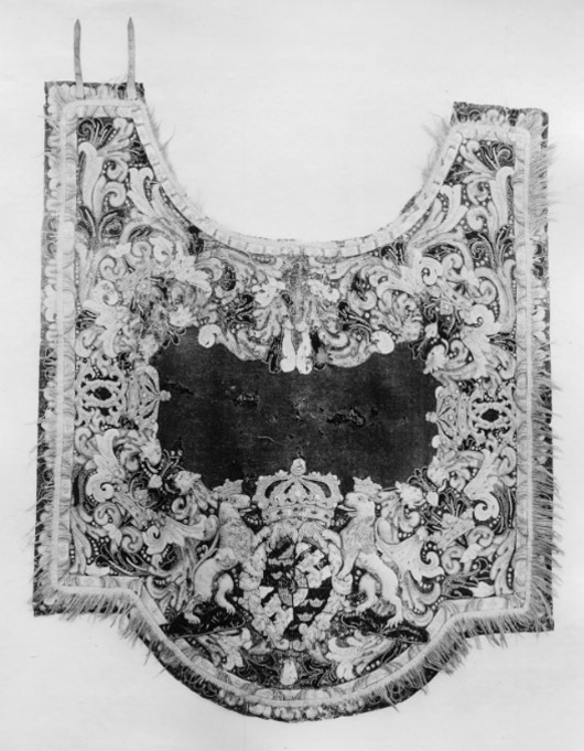 Täcke av blått kläde med applikationer av kläde i flera färger, huvudsakligen gult ochvitt. Samma typ som nr 4061 men skiljer sig från detta i följande avseenden: Bredd framtill: 1530 mm. De små gula lejonen i vapenskölden är av gult kläde broderat medullgarn. Riksvapnets mått: 560x620 mm. Vänstra framstycket har två bruna läderremmar ca250x20 mm, placerade ca 55 mm från framkanten. Högra framstycket har tvåbruna lädertränsar,50x30 mm, med spännen av vitmetall, 28x30 mm, tränsarna sitter 70 mm från framkanten. På baksidan sitter fem tränsar, liksom på nr 4061. Märk "G.17." med svart tusch 74 mmnedanför inskärningen. Två hällor av ljusbrunt läder, 260x35 mm, placerade ca 530 mminnanför respektive långsida ungefär i täckets mitt. Två svansremmar av brunt läder, dennedersta sitter fastknuten i fodret 270 mm ovanför bakre fliken och är, 580x8 mm, denöversta är 430x10 mm och fastsydd, fodret 300 mm ovanför den nedersta remmen.
