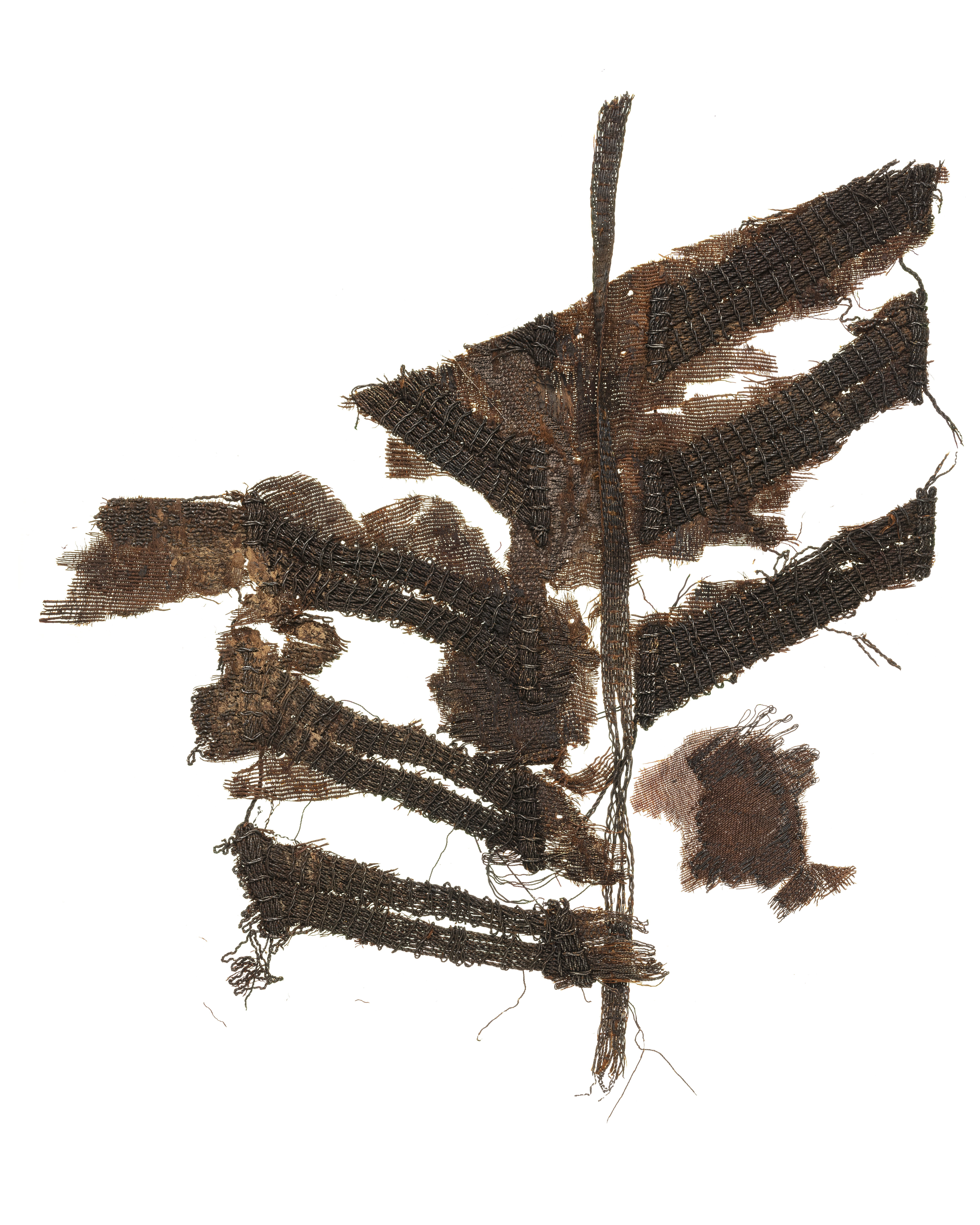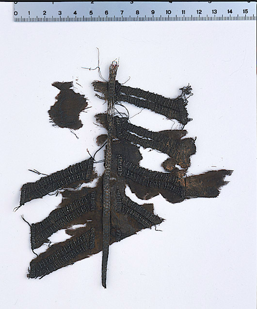 Förmodligen från praktdräkten. Brokad med garneringar av galoner och knapphål. Sidenbotten är trasig och framförallt vänster sida är skadad och i oordning. Fragmentet ingår i en samling fragment tagna som prov ur drottning Kristinas kista vid gravöppningen den 13-14 december 1965. Brokaden har en mönstrad botten av varprips och 8-skafts satin med guldbroscheringar. Brokad i siden med broscherat blommönster i metalltråd, en smal galon delar fragmentet vertikalt, på var sida utgår bandkantade knapphål, på vänster sida finns det fyra intakta samt rest av ett, på höger sida finns det tre knapphål. Knapphålen är ej skurna.