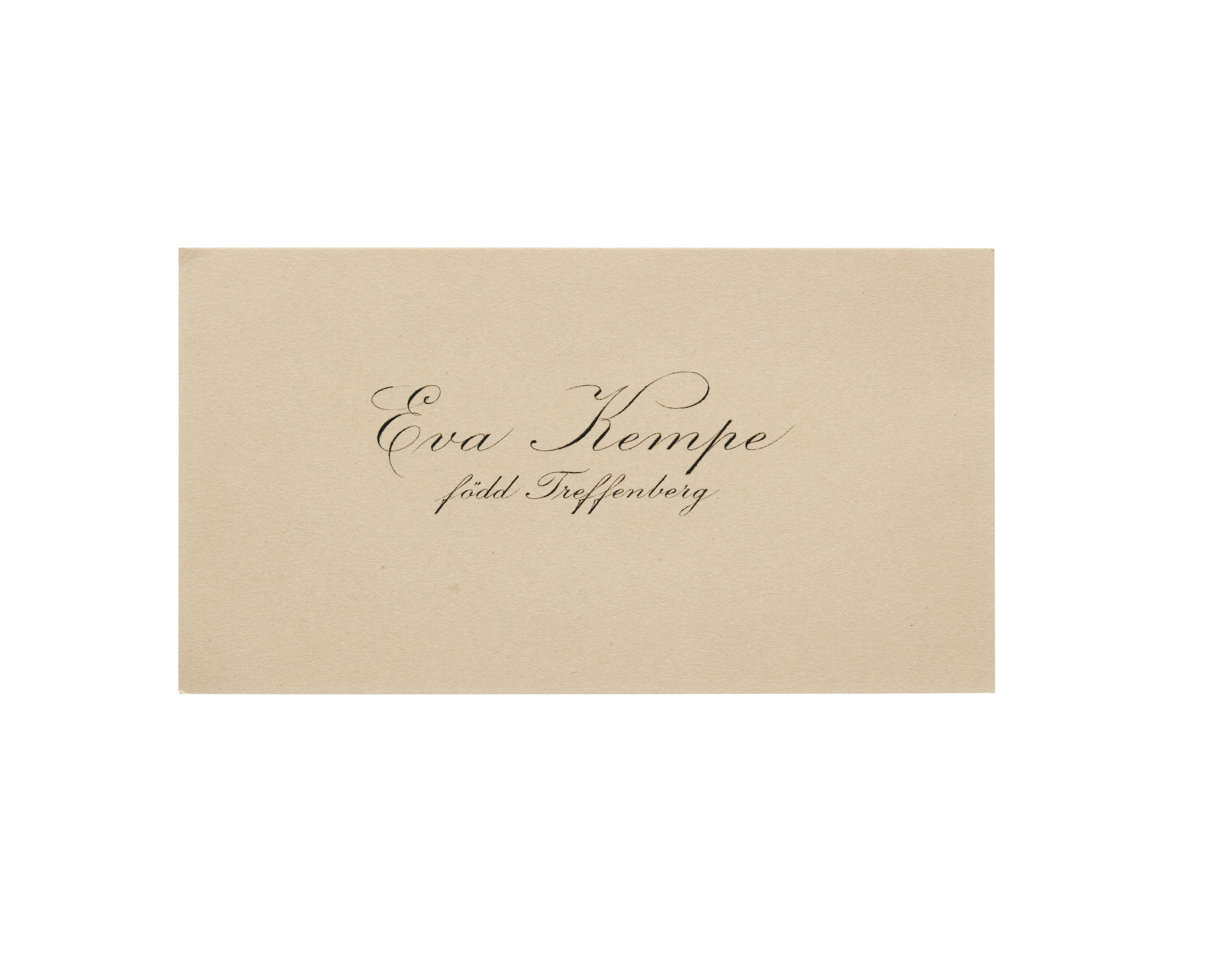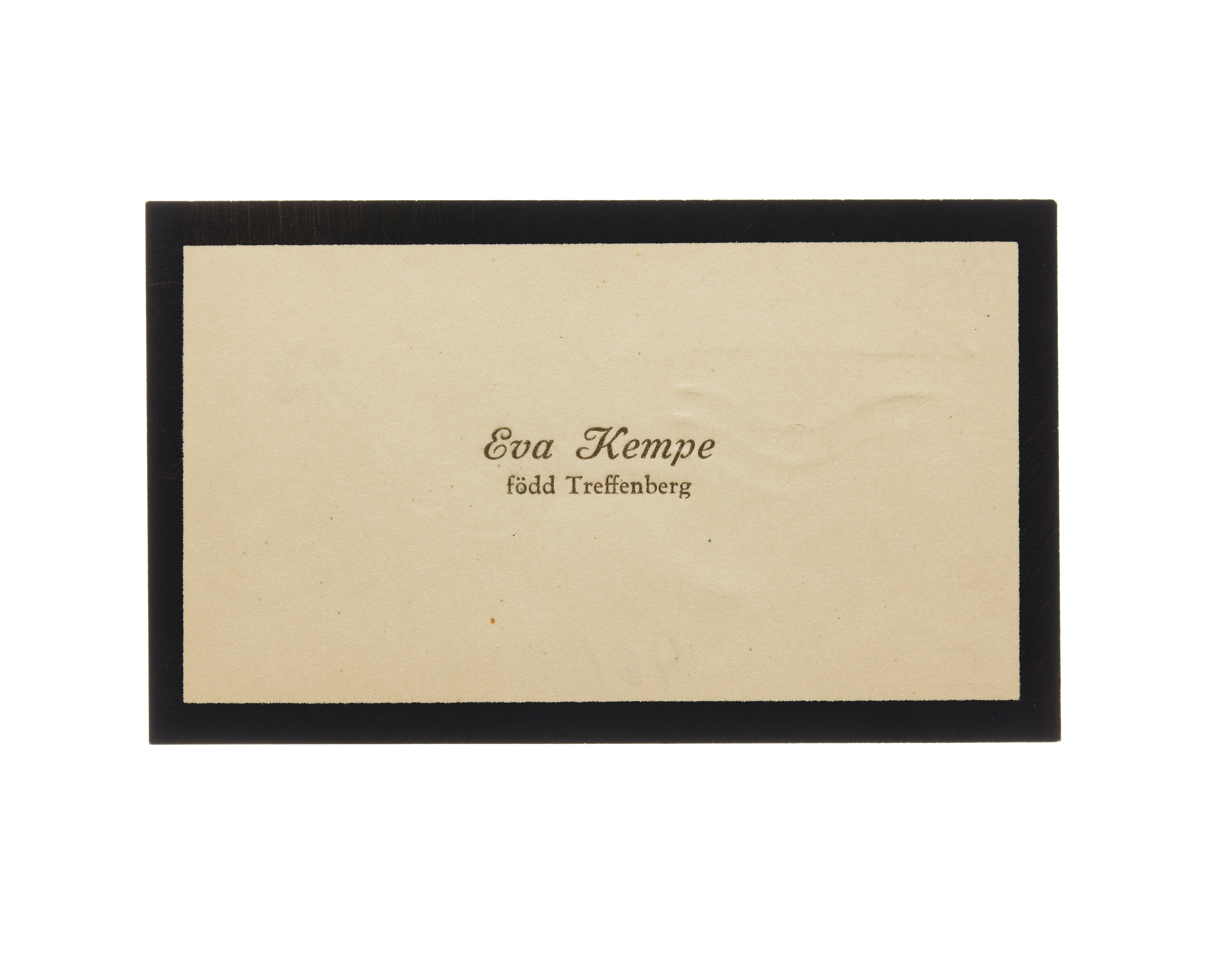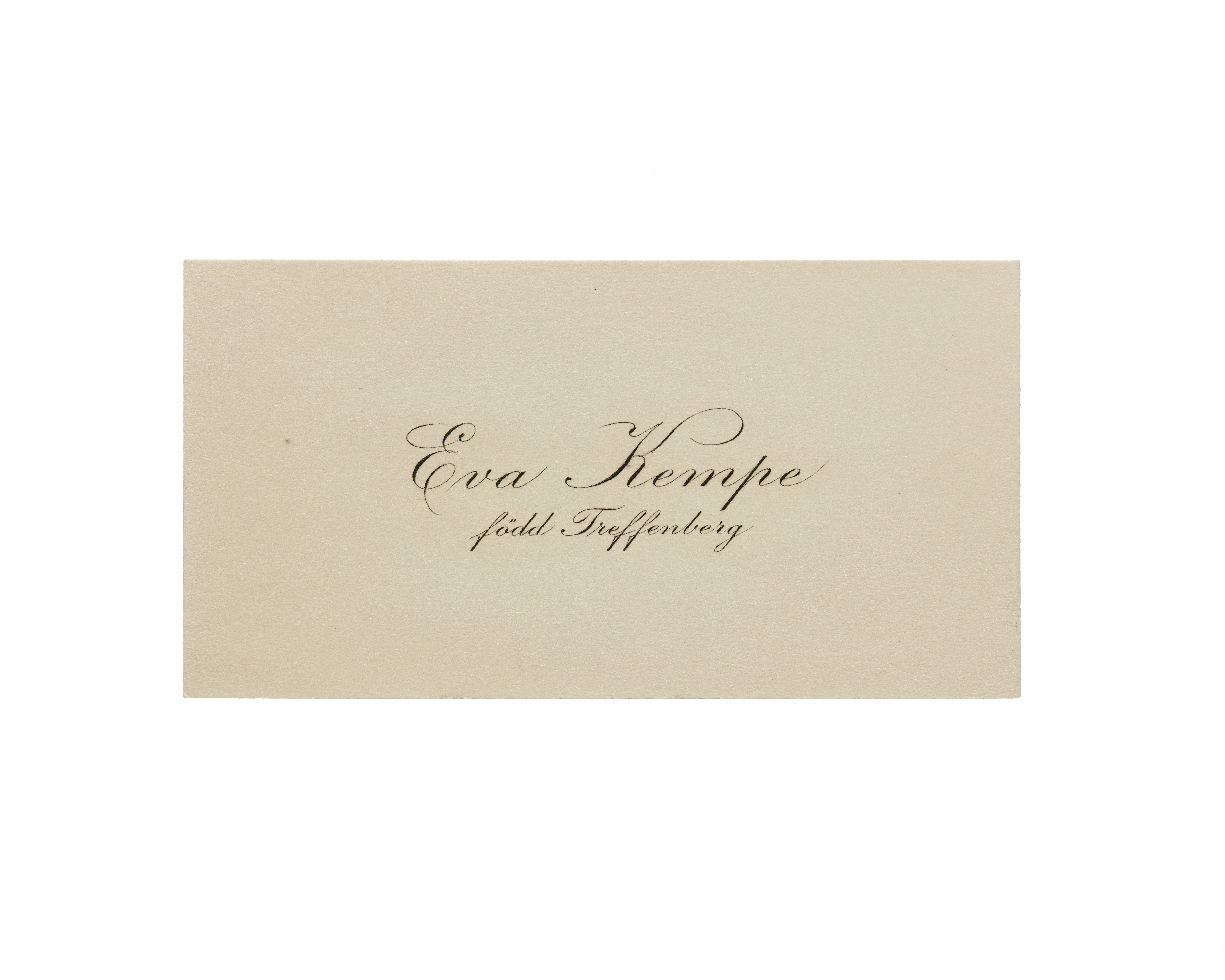 Sju visitkort från Eva Kempe, f. Treffenberg. Första kortet daterat 1919. Andra kortet daterat 1920. Tredje kortet daterat 1921. Fjärde kortet daterat 1924 samt sorgkant. Femte kortet daterat 1925 samt sorgkant. Sjätte kortet daterat 1927. Sjunde kortet daterat 1928.