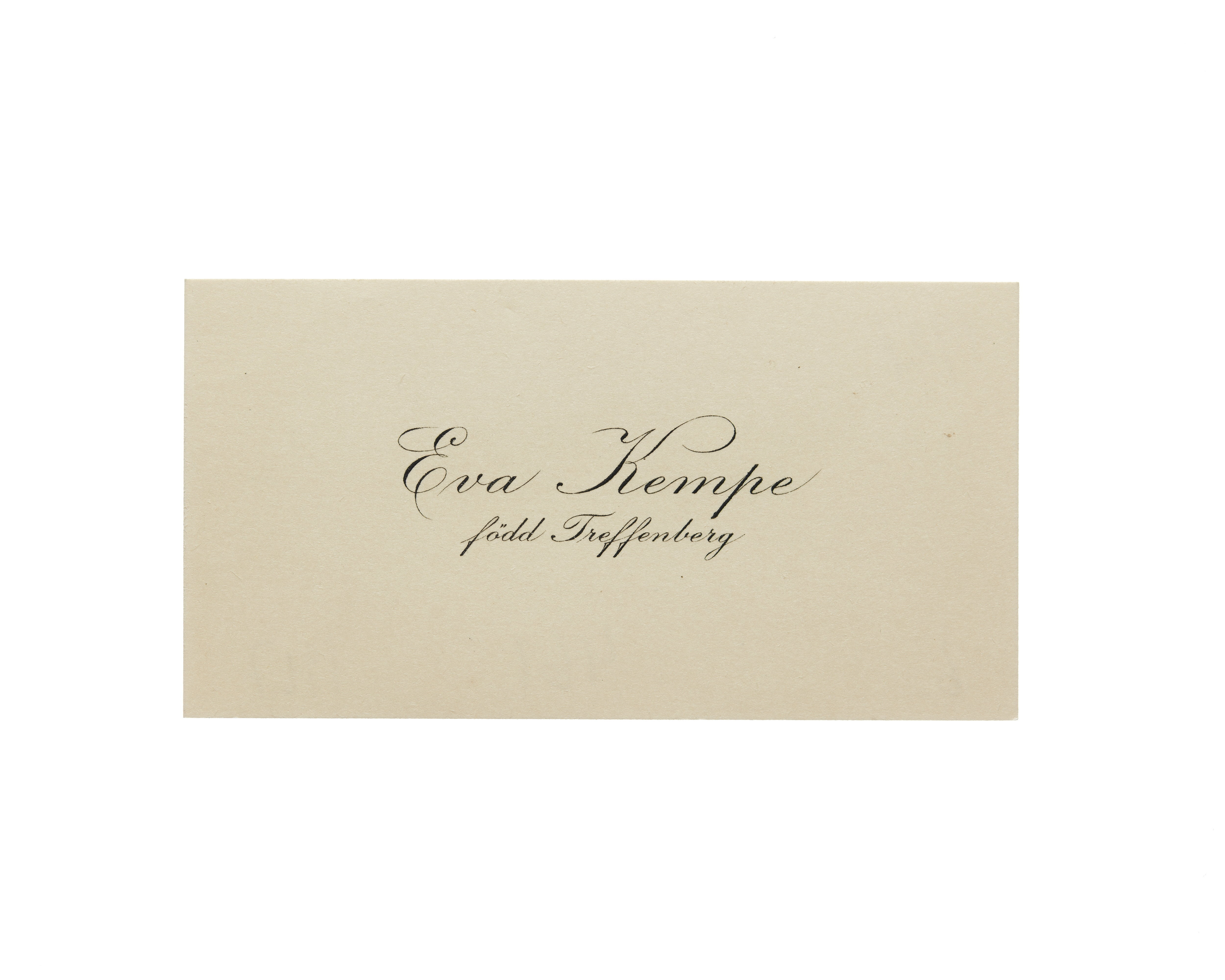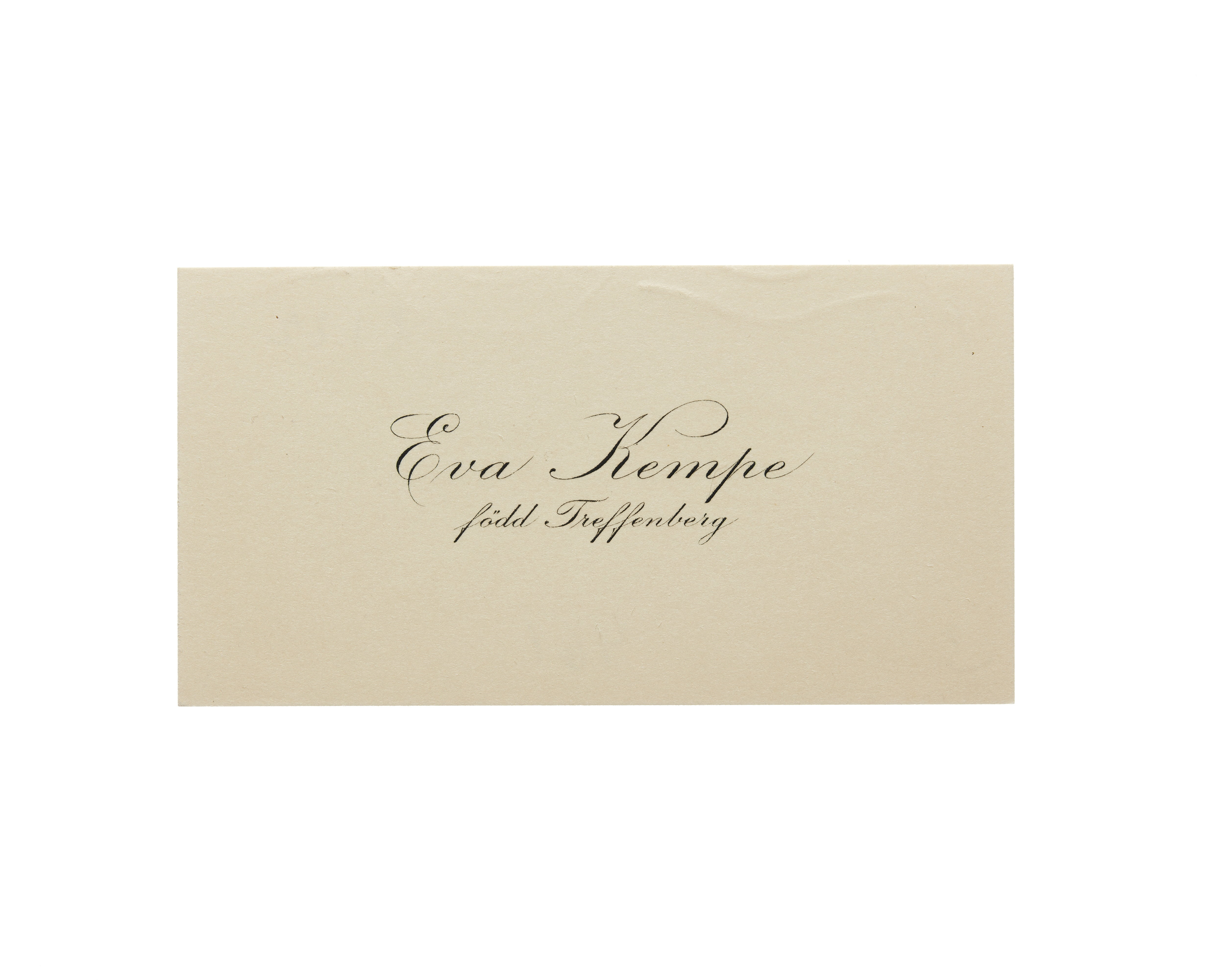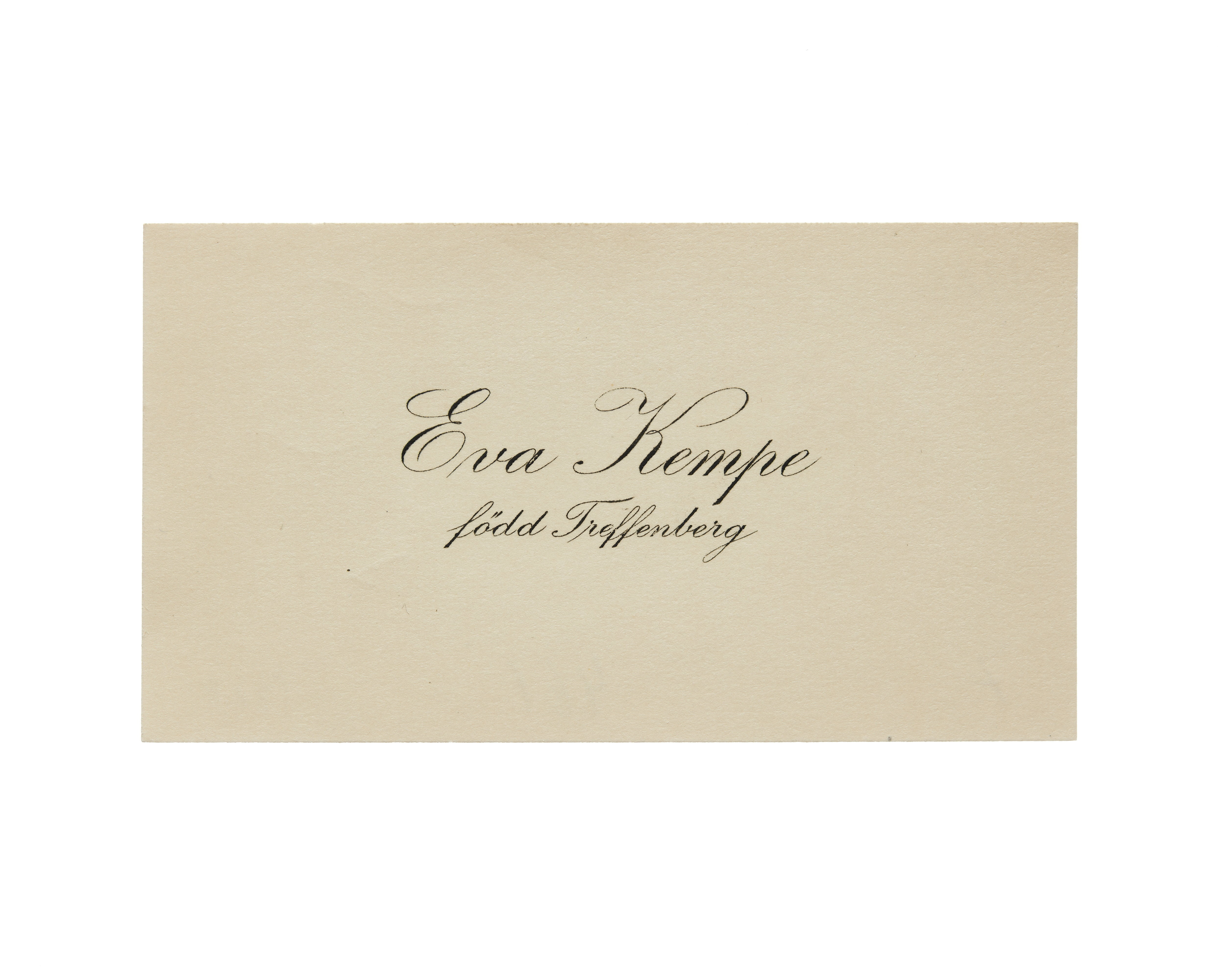 Sju visitkort från Eva Kempe, f. Treffenberg. Första kortet daterat 1919. Andra kortet daterat 1920. Tredje kortet daterat 1921. Fjärde kortet daterat 1924 samt sorgkant. Femte kortet daterat 1925 samt sorgkant. Sjätte kortet daterat 1927. Sjunde kortet daterat 1928.