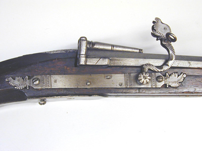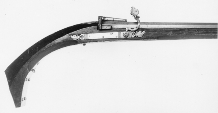 Åttsidig, slätborrad pipa med antydan till trumf, svansskruvblad till kolvänden. Vid pipbasen filad dekor i form av flätband. På v. pipfas därframför en djupt inslagen, otydlig stämpel. På ovansidan 150 mm från pipbasen stämplar: H H ovanför enhörning (Stöckelnr 2889, LRK vägl. 1921:169) samt Nürnbergs stadsstämpel med N (Lrk vägl. 1921.179, Stöckelnr 1581). På pipans h sida vid pipbasen fäst en rektangulär fängpanna med filade diagonala streck. Locket (utan fingergrepp) fäst på axel vid yttre bakre hörnet. På samma axel fäst en krutskärm med fyra filade hack i överkanten. Riktmedel: På kammaren ett 92 mm långt rörsikte.Framåt avsmalnande stolpkorn. Fästning: Tre häften. Krysskruv underifrån samt tre ej ursrpungliga pipstift av trä, svansskruvbladet fäst med två spikar. Luntlås med långt, smalt, rektangulärt låsbleck med drakformigt konturerade och punsade ändblad i båda ändar. Filad och punsad vertikal dekor i form av snedräfflade bårder omväxlande med ringpunsade, vid bakre låsskruven tre räfflade omväxlande med två ringpunsade, på vardera sidan om hanen två räfflade flankerande en ringpunsad bård. Bakom den bakre av dessa Nürnbergstämpel utan N (Stöckelno 1589). Vid bakänden en korsliknande stämpel (LRK vägl.1921:305. Kraftigt S-formigt svängd hane med drakklämmor, filad och punsad dekor, på bakre kanen rundade fasningar. Klämskruv med ringformigt grepp (ursprunglig?). F'ästning: Två l åsskruvar från h sida. Avtryckaren saknas. Helstock av petrinaltyp med kantiga sidor, kolven nedåtsvängd med rak kolvände i nästan rät vinkel mot pipan, åttsidigt tvärsnitt på kolvhalsen, kolvänden sexsidig med tvärt avskuren tå. Kolvryggen skodd med svansskruvbladet till kolvänden. Kolvänden täckt med stålplatta tre fästspikar. På undersidan beslag från kolvtån till laddstocksrännan, konturerat efter kolvens form, framtill avslutat med spets. Underbeslaget framtill fäst med krysskruven, baktill med fem skruvar (fyra och en) samt däremellan en skruv med ring.