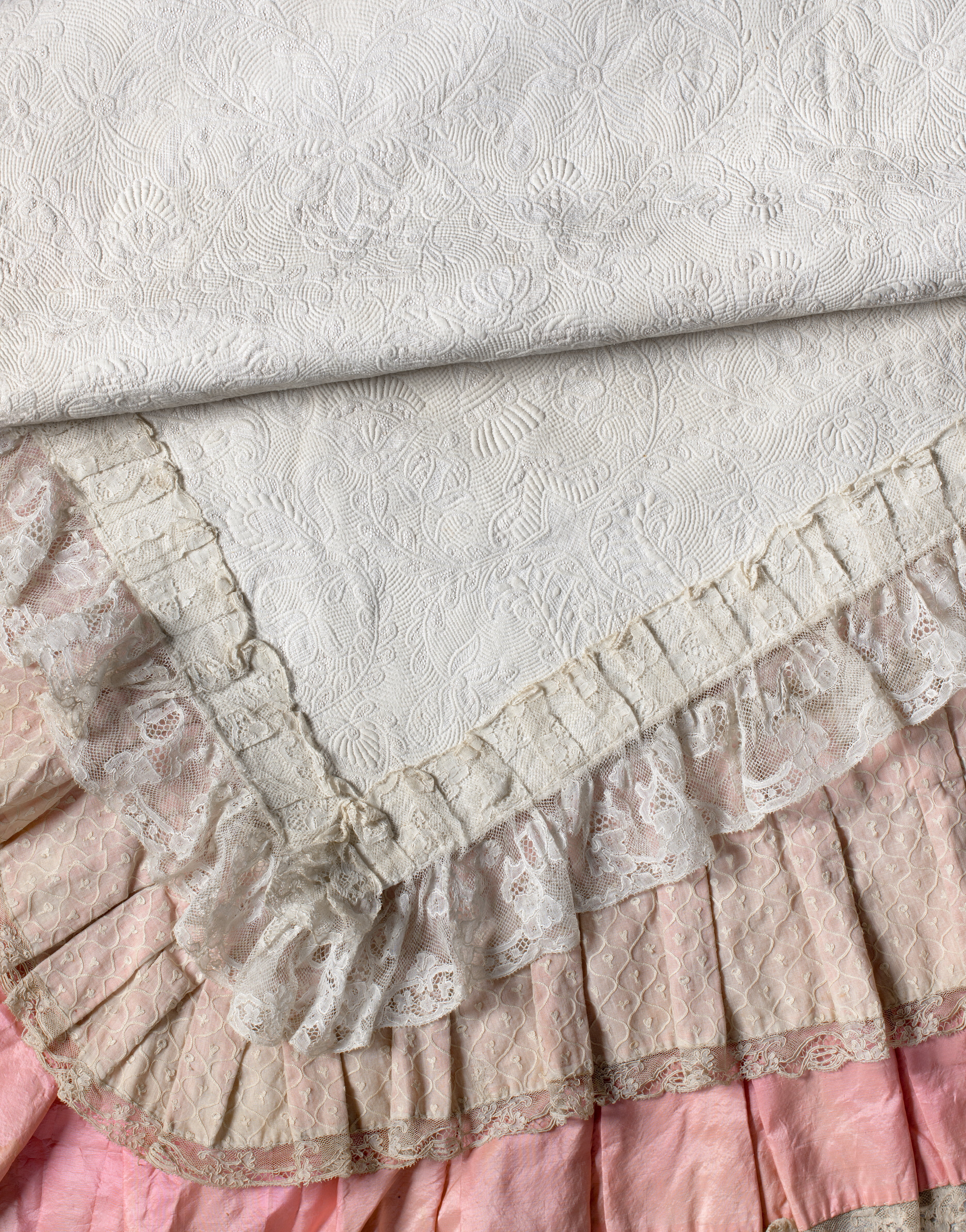 Litet vaggtäcke av broderad nettelduk, fodrat med röd taft samt garnerat med smala spetsar.