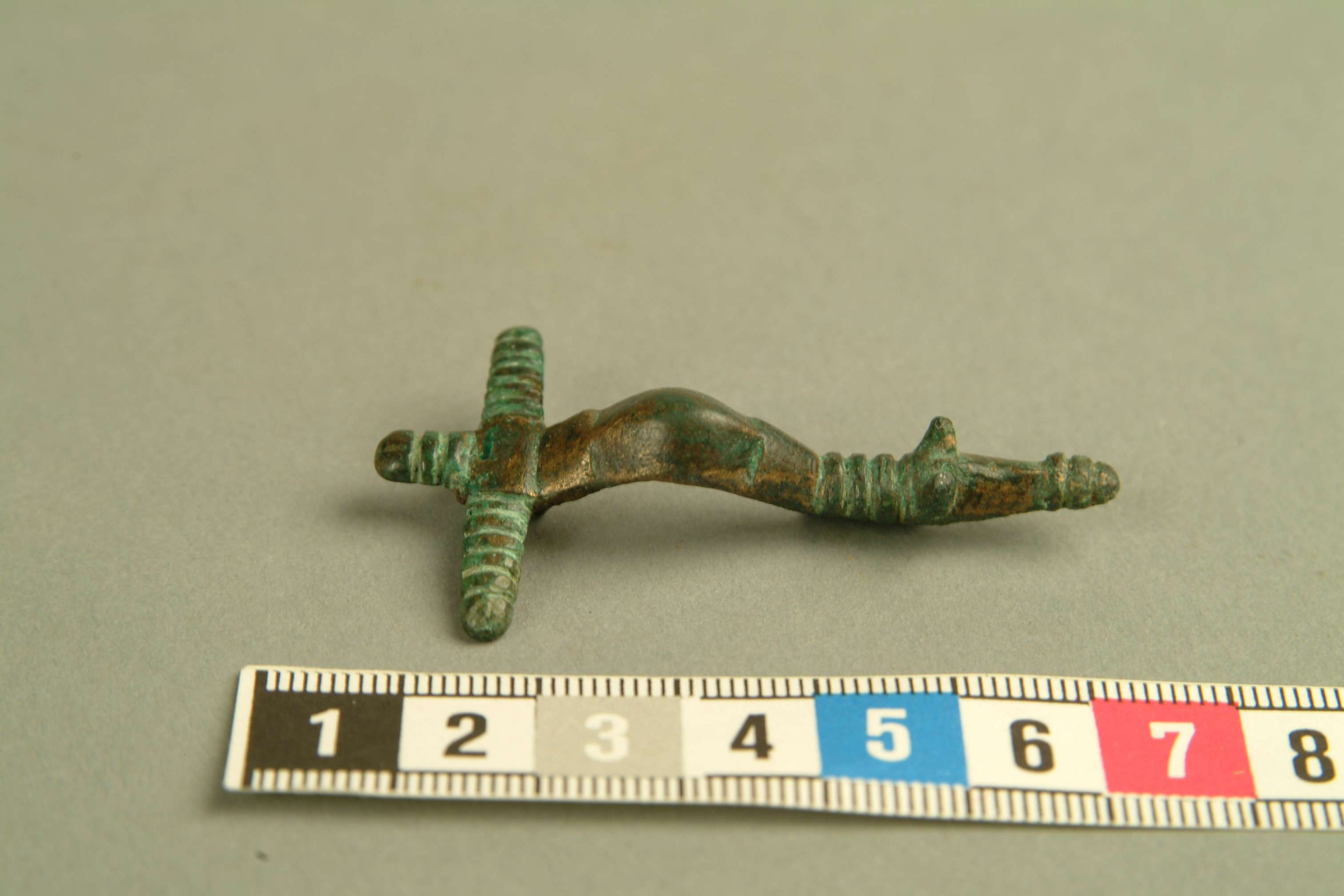 Korsformig fibula av brons. Dess övre del, från armarna och delen närmast nedom bågen, har djupa tvärräfflor. Nedersta delen har formen av ett djurhuvud. Bågen är oornerad.