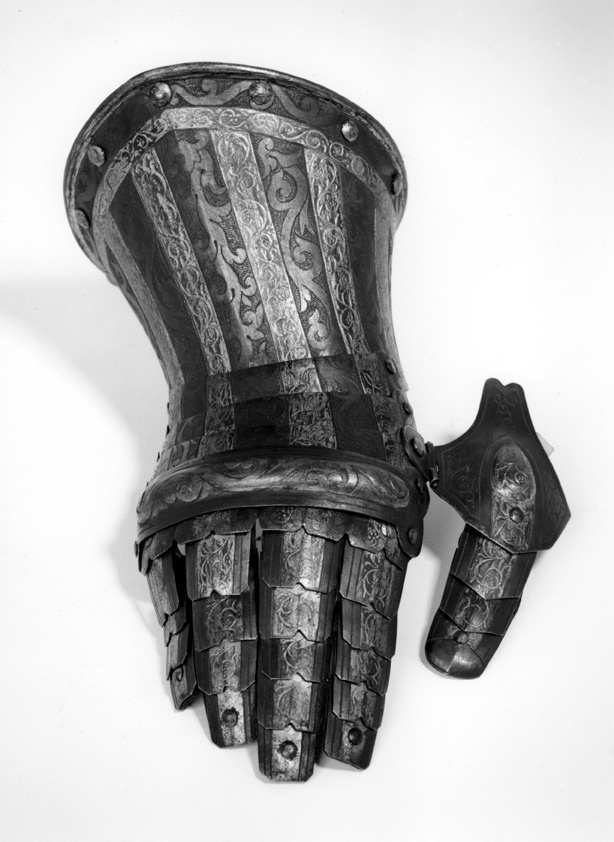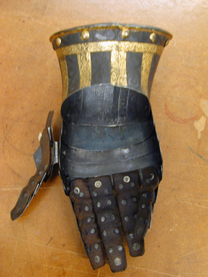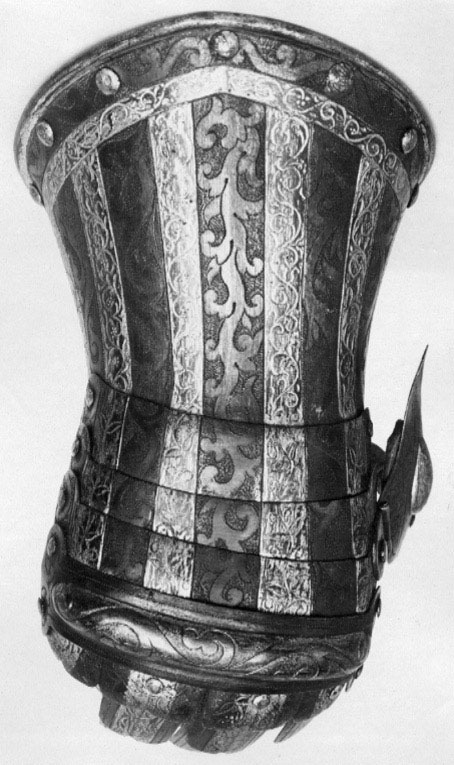 - 1 st Harnesk (på ena handsken felar några fingrar) med utstuckit arbete och förgylte ränder; best. af Cascquette, ringkrage, armskenor, bröst och ryggstycke, lår skenor och ett par handskar. komit ifrån Påhlen.