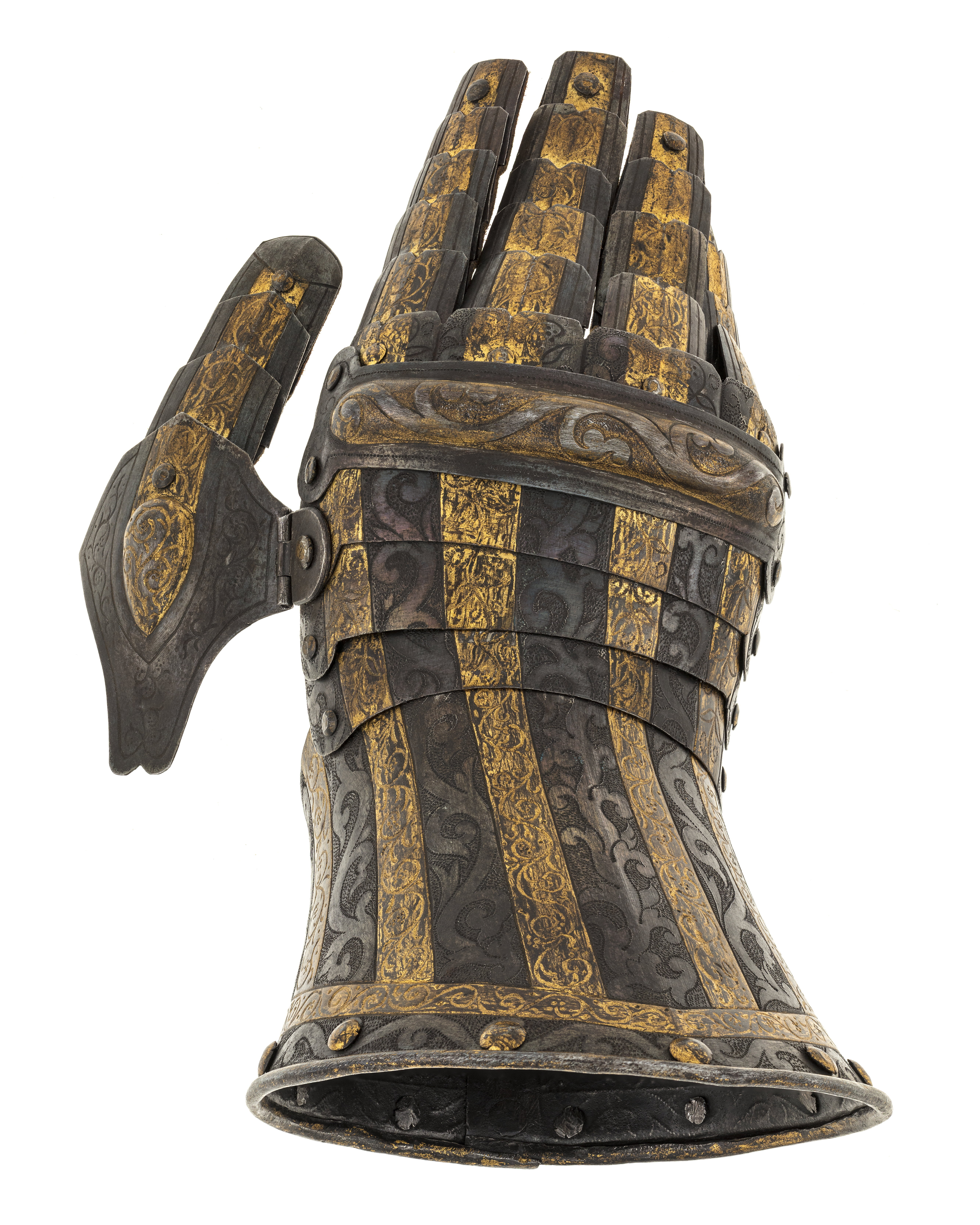 - Ett litet Harnesch af Järn, utstuckit arbete, med förgylte wänder uppå; Samma Harnesch består af Casqwett, Ringkrage, Armskenor, Bröst- och Ryggstycken, Lårskenor och ett par hanskar, Kommit ifrån Påhlen och Kostar - 90:-