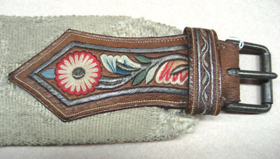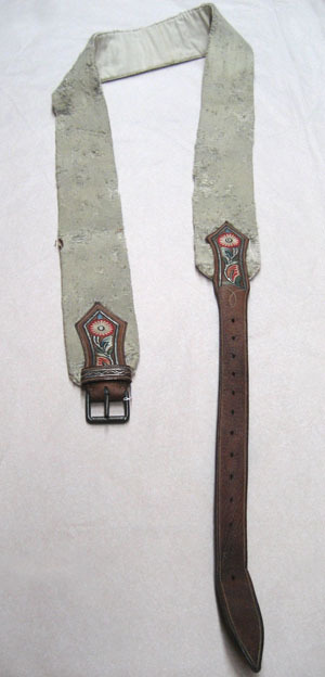Gjord av vitt band i grunden av grov vävnad, eventuellt linne. Klädd på ovansidan av vit ylle. Foder av tunnare vit textil, tuskaft. Rundade ändar med på ena sidan en lång, smal, brun läderrem med spetsformat avslut och 13 hål i rad längs mitten. På andra änden ett fyrkantigt metallspänne med löphylsa och en nål. Fäst i bandet med en läderhälla. Båda läderfästena är broderade med blomsterslingor i röd, vit, blå och grön silke samt guld- och silvertråd. Fästena har en spetsform med tre hörn. Nedanför spännet är en fast tvärgående läderrem broderad med en växtslinga av grön och ljust röd silke samt guld- och silvertråd. Remmens bredd: 20 mm. På gjordens ena långsida är en fastsydd, tunn skinnhälla, 105 mm från spännets skinnfäste. Hällans bredd: 4 mm, längd: 28 mm.
