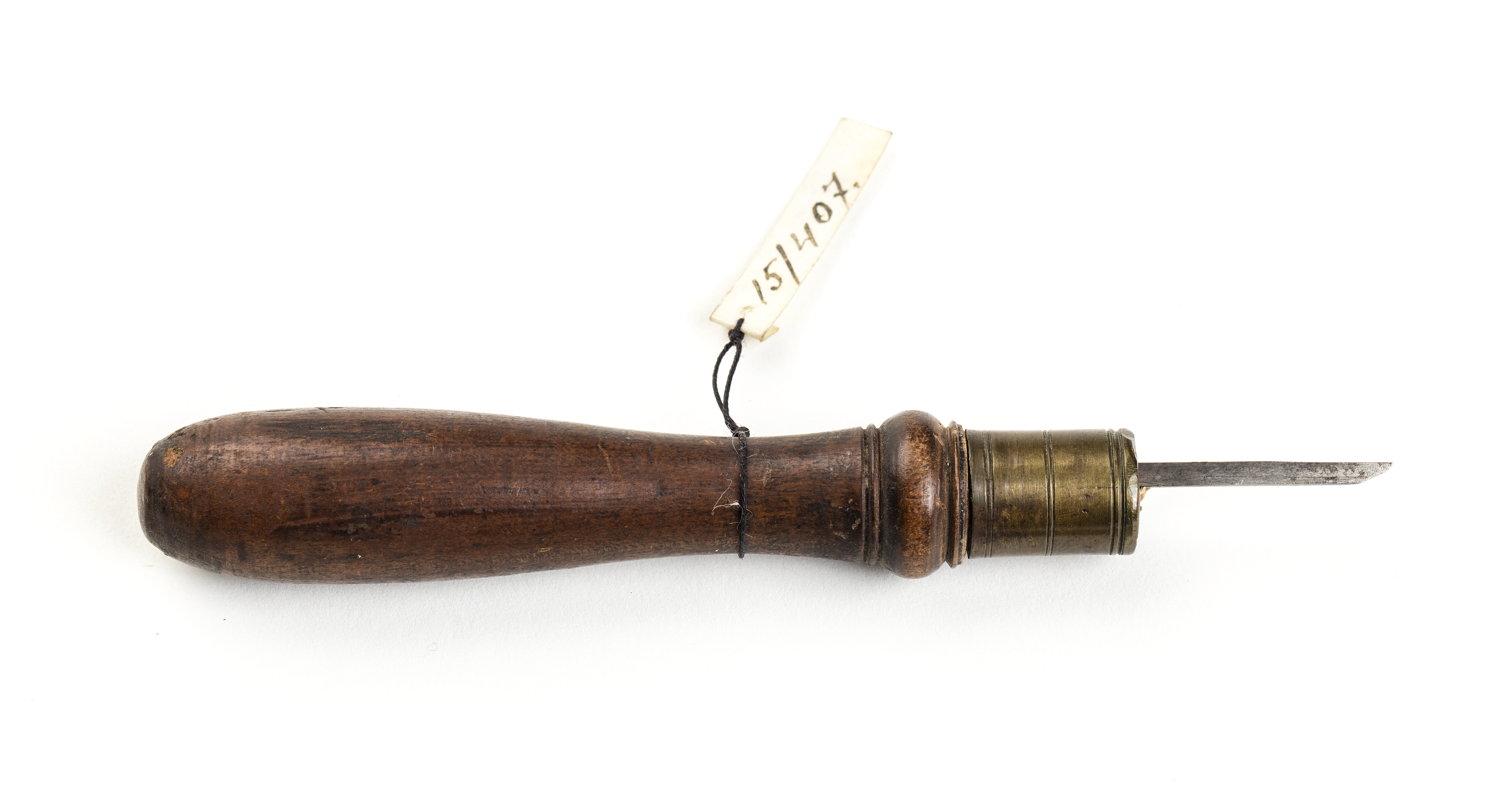 Gravstickel med diagonalslipad egg. Klinga med rombiskt tvärsnitt med ett hörn avskuret. Svarvat, kägelformigt skaft, med fästet dekorerat med en vuslt och skott med em mässingsring dekorerad med 6 svarvade ringar.